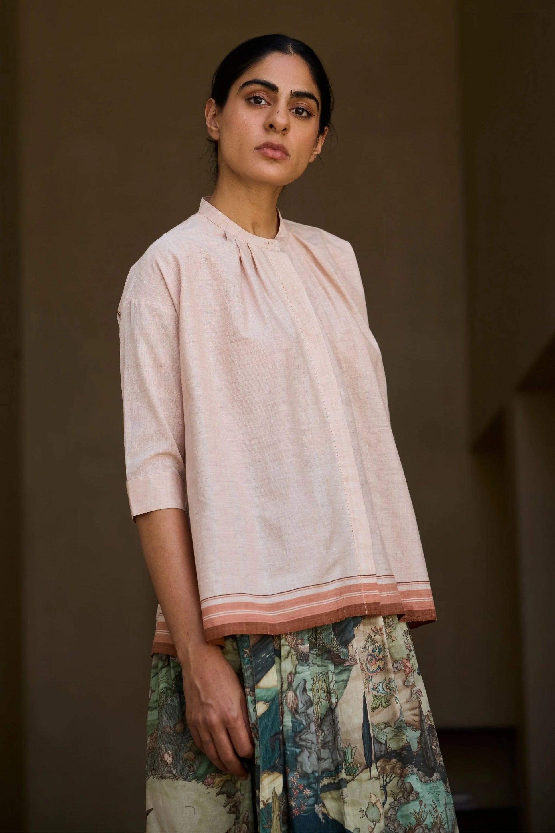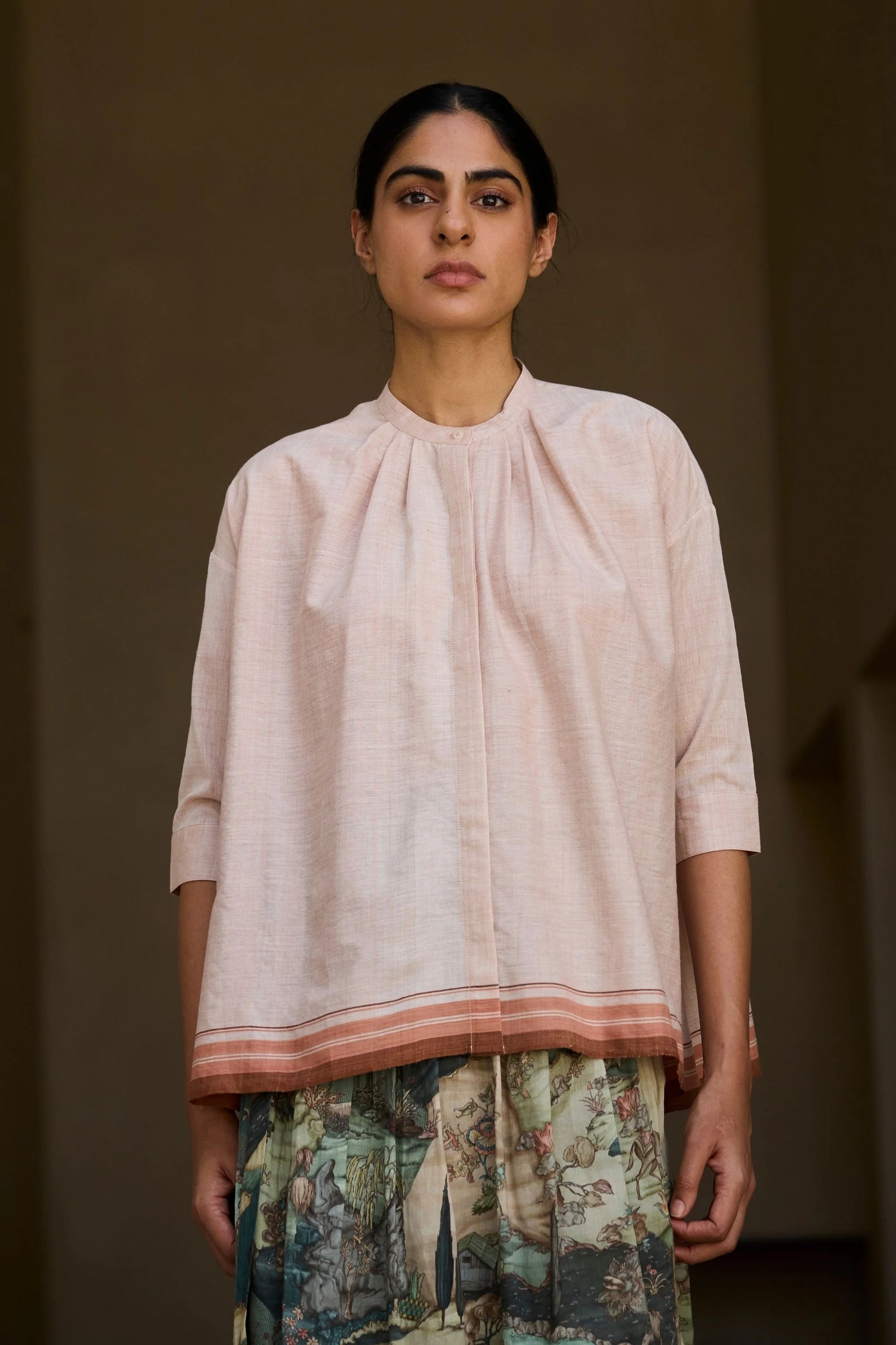 Crafted from handwoven cotton. Combines a slim band collar and concealed placket. Delicate gathers around the neckline. Three-quarter length sleeves. Two-button fastening cuff. Beautiful loom striped hem.