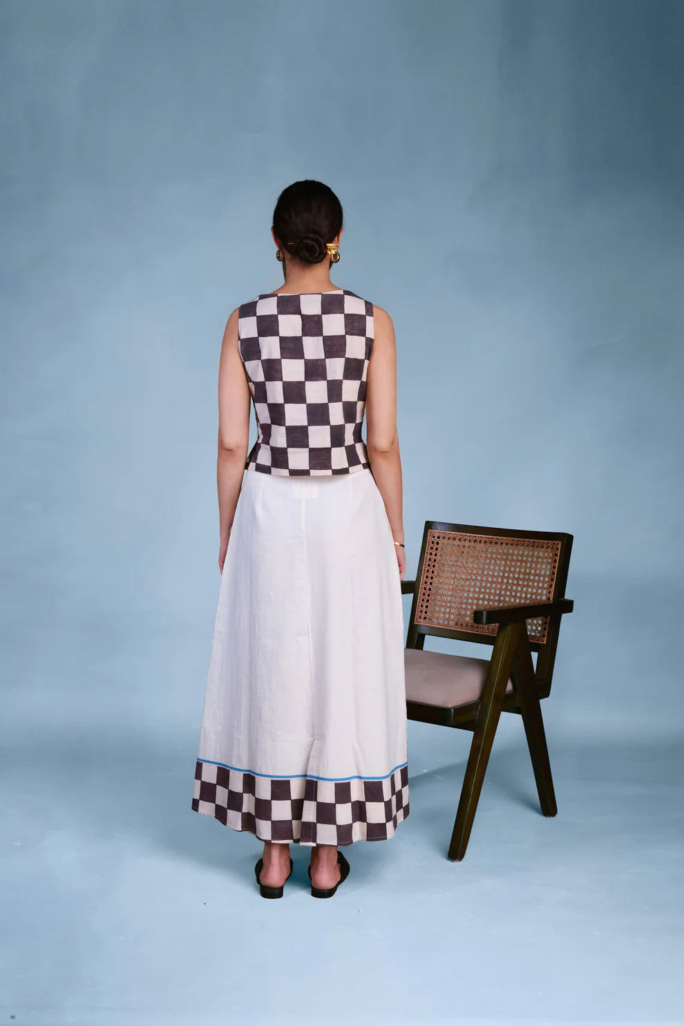 A classic A‑line midi skirt with a side zipper. It is painted with myrobalan, lac, and alum, and the back is painted with kassim. It also has a small indigo blue patch running above the kassim border.