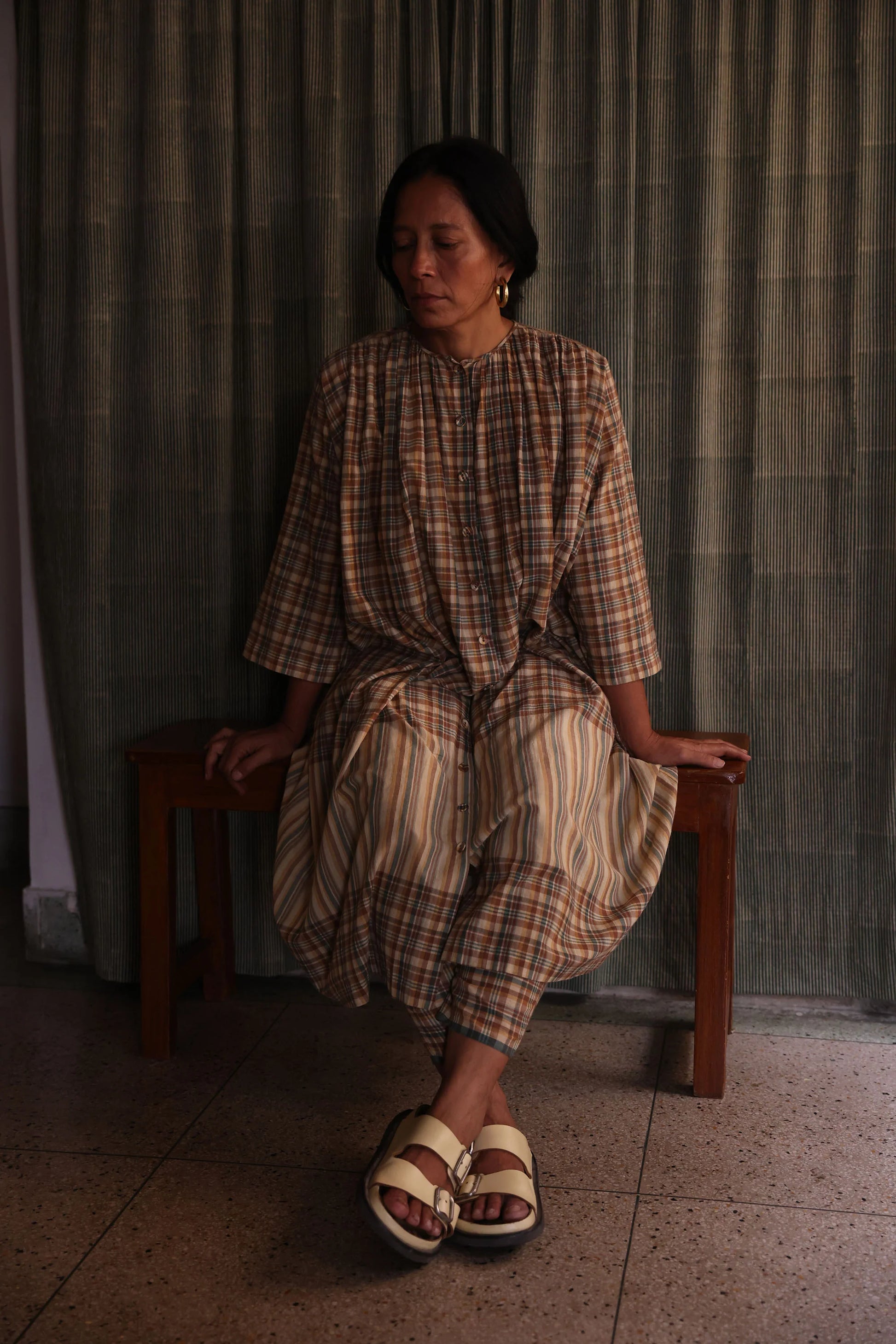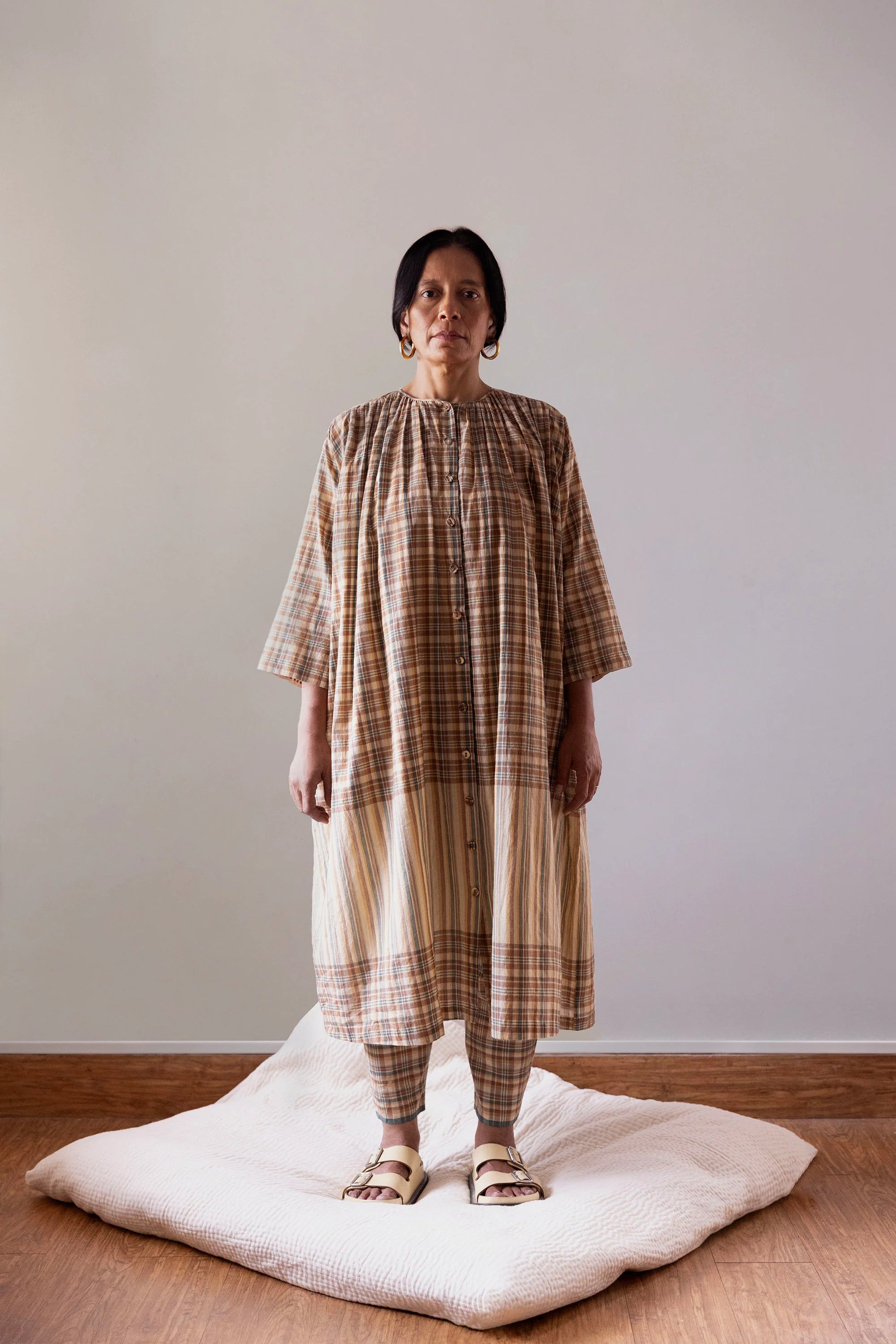 An airy, anti-fit muslin cotton dress that grazes the calf and gathers around the neck and shoulders. 3/4-quarter sleeves with hand-embroidered cuff details on silk. This Kaneer Dress is made from airy, anti-fit muslin cotton that grazes the calf and gathers around the neck and shoulders. This design includes 3/4-quarter sleeves with hand-embroidered cuff details on silk for added elegance and charm. Perfect for any fashion-forward individual seeking style and comfort.