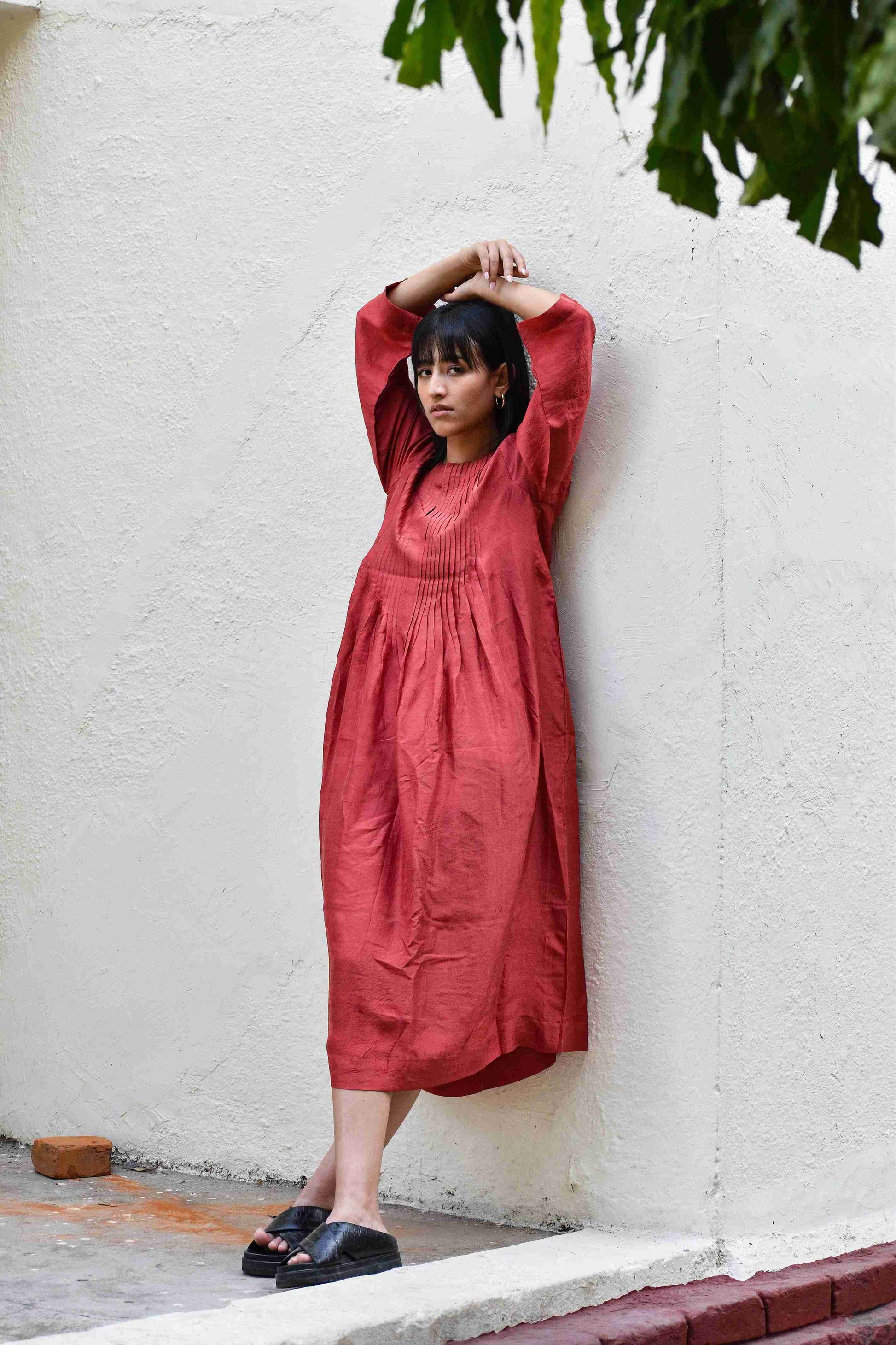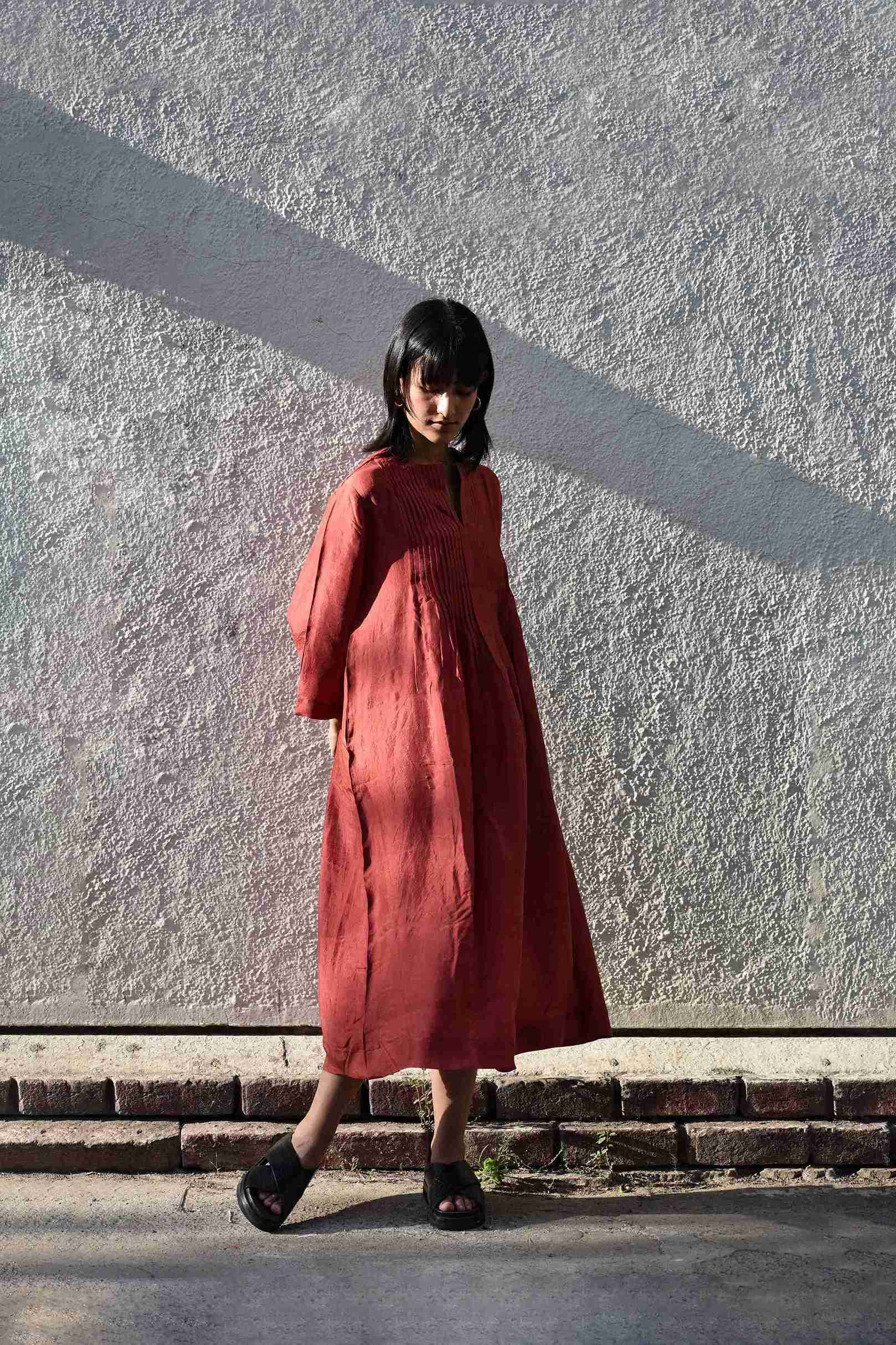 Midi dress with pintucks on the front- neatly arranged on either sides. Elbow-length sleeves, and in-seam pockets for details. Comes with a handwoven cotton slip.