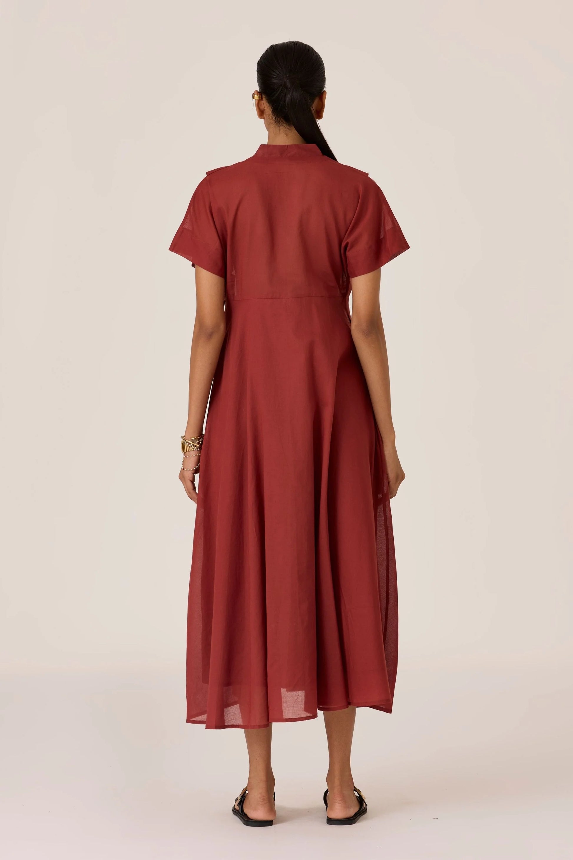 Fit and flare dress in breezy cotton. A gentle inverted detail along the neckline. Relaxed drop sleeves. In-seam pockets. This dress is lined from waist down.