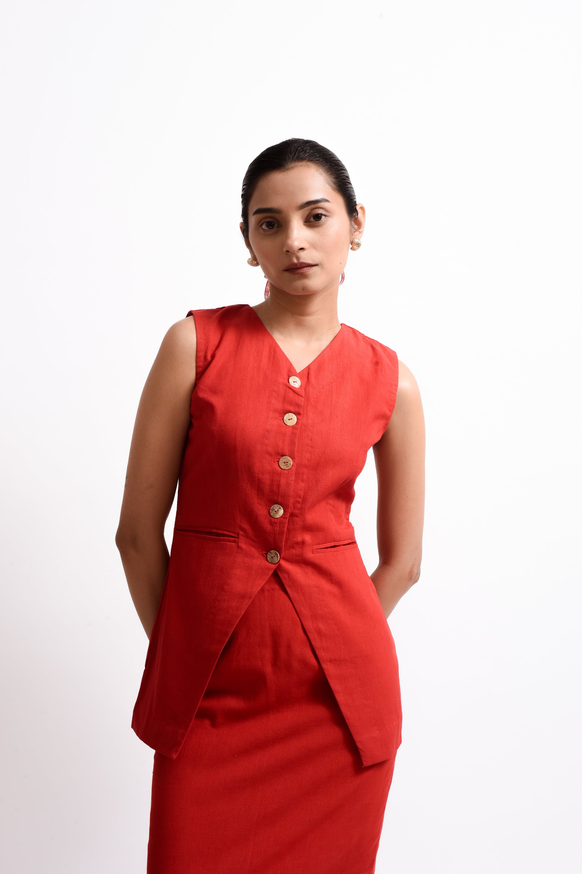 Elevate your wardrobe with the Ellie Vest and Pencil Skirt Coord Set. Featuring a chic V neckline vest with center front buttons and side pockets, paired with a high/mid waist pencil skirt with a center back split. Both pieces are fully lined for comfort and style.