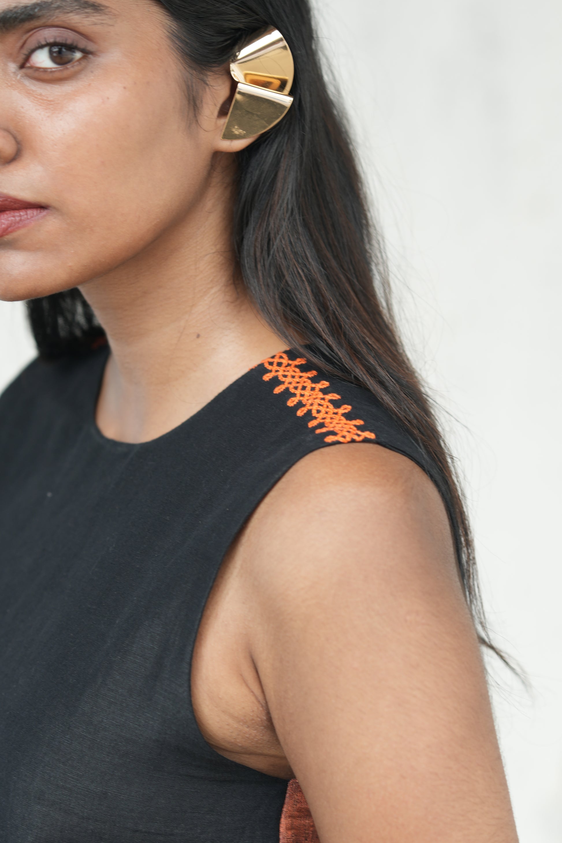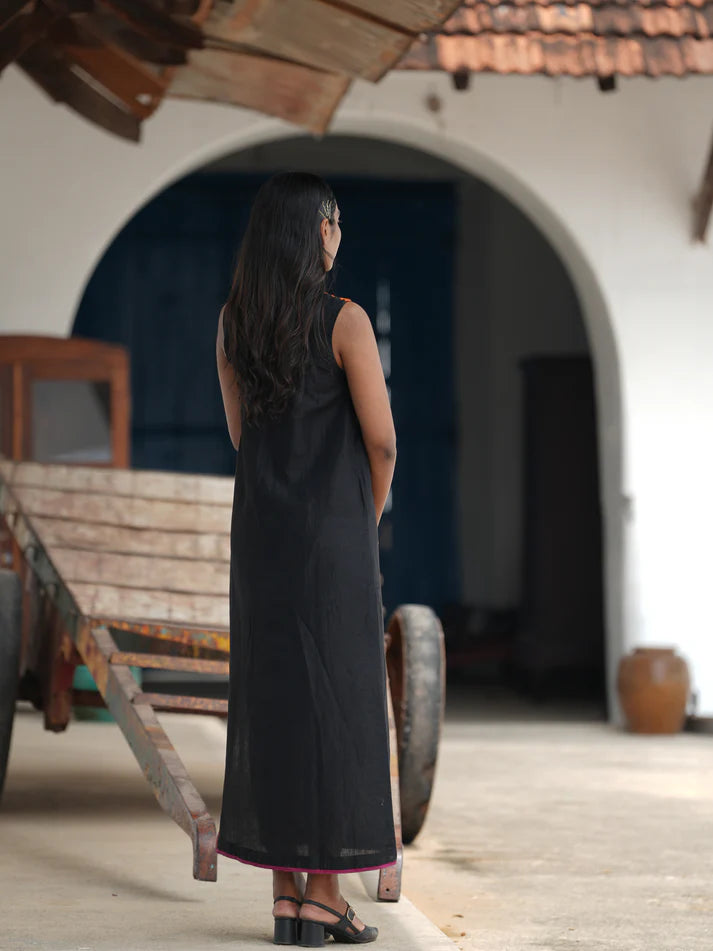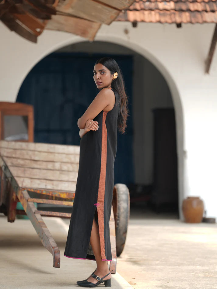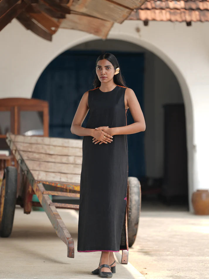 The ratri dress Crafted in handloom cotton linen, this sleeveless long dress offers a fluid silhouette that drapes beautifully. The embroidered shoulders add a delicate touch of craftsmanship, while the Zari side panel introduces a subtle hint of shimmer. A one-sided long slit enhances movement and grace, complemented by contrast side embroidery that adds depth and refinement.