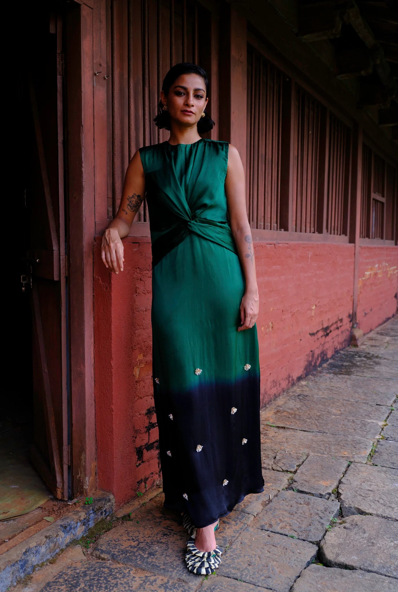A timeless evening dress, hand dyed in jewel tones, embellished with 3-D embroidered flowers. The draped knot in the front makes for a stand out detail, the soft silk skims the body before falling to a fluid hemline.