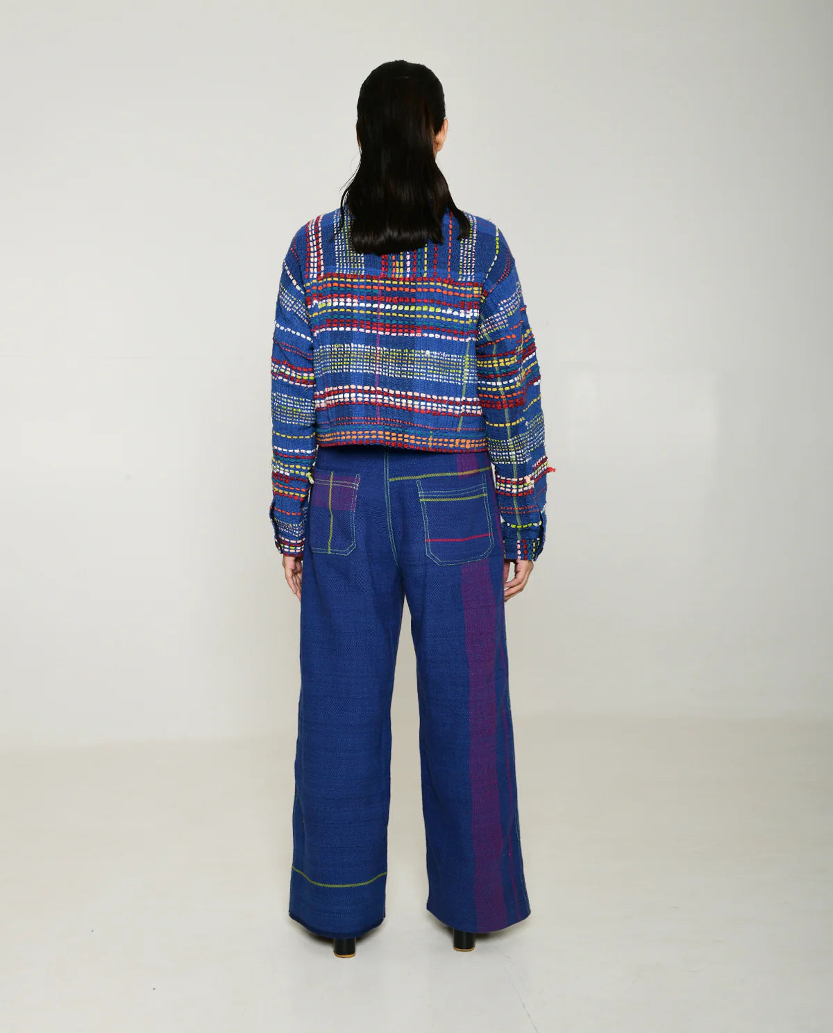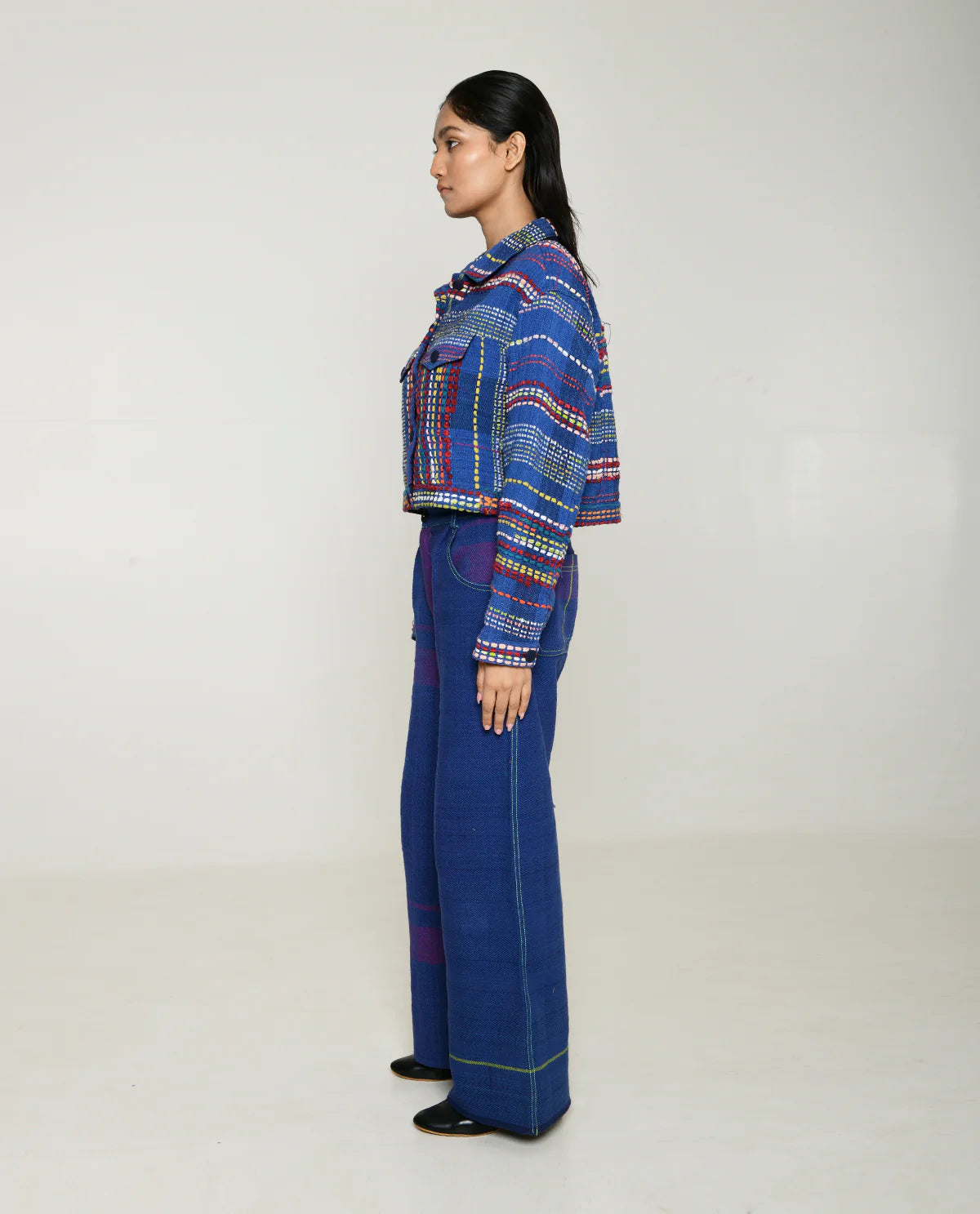 Handwoven unisex jackets are skillfully crafted using our recycled fabric with the extra weft technique on frame looms. Each jacket is made from Rias Jaipur's manufacturing waste collected over the past year, undergoing meticulous re-weaving and re-imagining for a fresh and unique appearance. This sustainable and eco-friendly fashion choice is created entirely from 100% cotton.