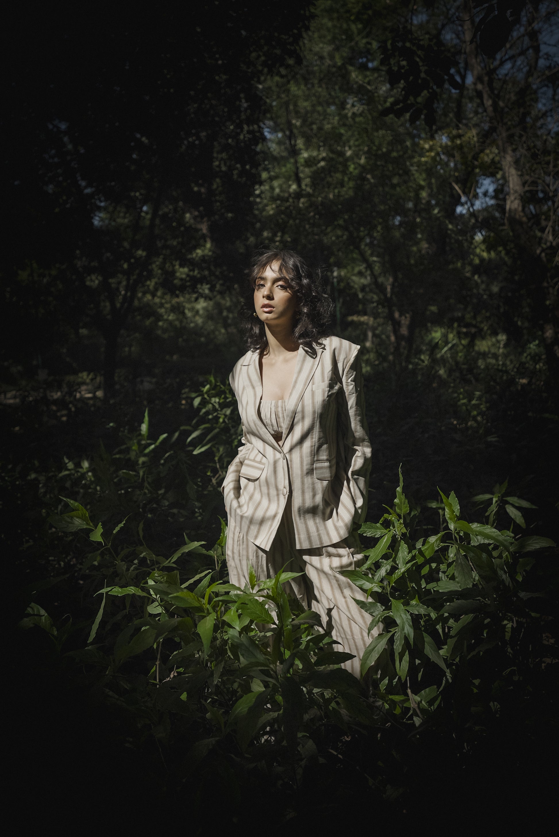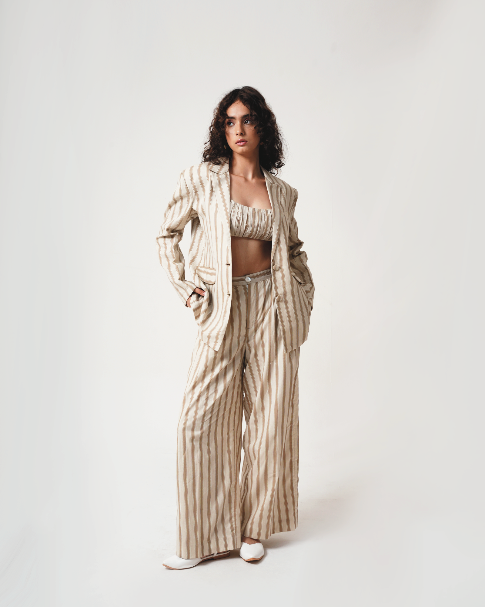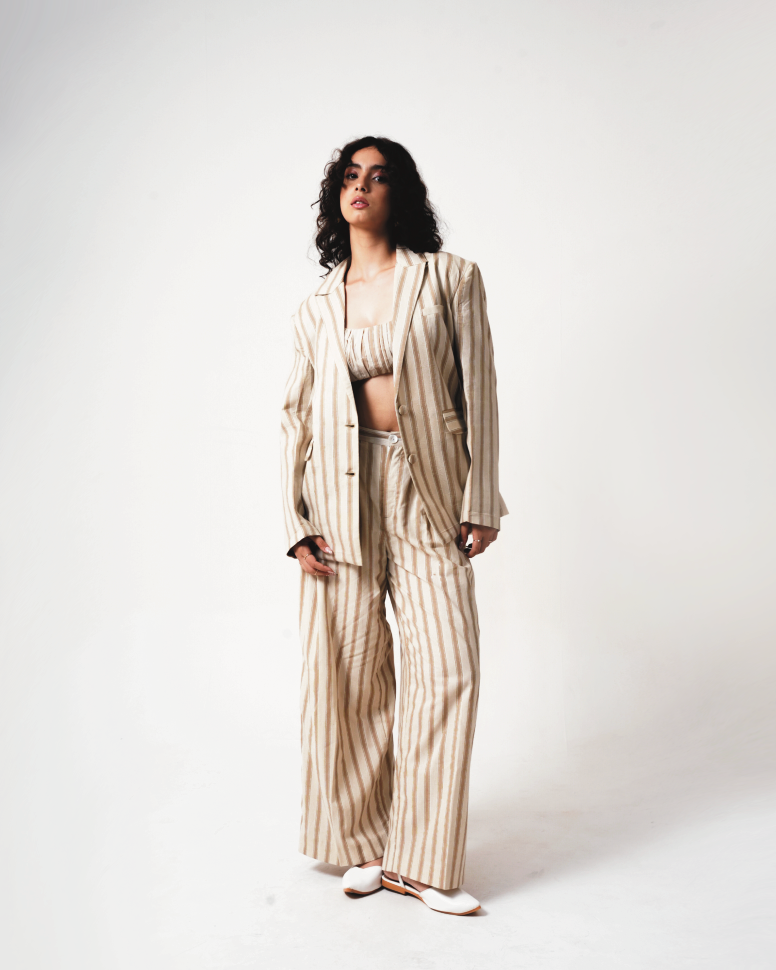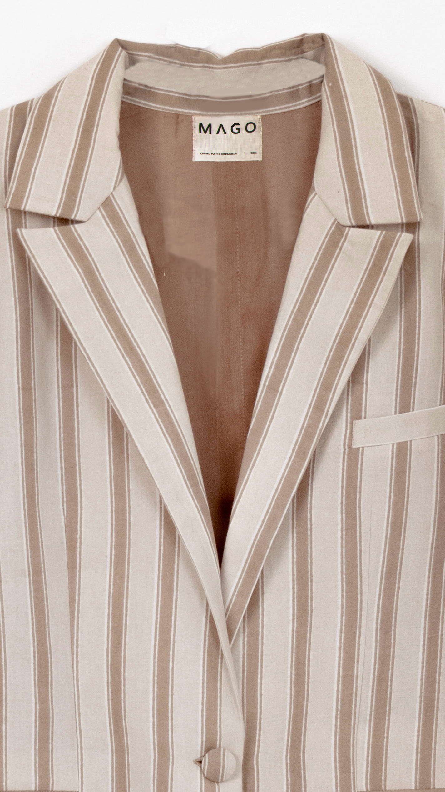 A modern take on timeless tailoring, this structured blazer blends sophistication with effortless charm. Designed with sharp lapels and a sleek double-button closure, it creates a refined silhouette while maintaining a relaxed feel. The lightweight fabric allows for breathability and ease of movement, making it a versatile staple. Subtle stripes add depth and character, ensuring this piece stands out whether worn as a set or styled separately. Lined with soft cotton mul for added comfort and a smooth finish.