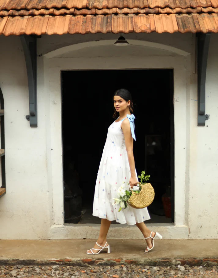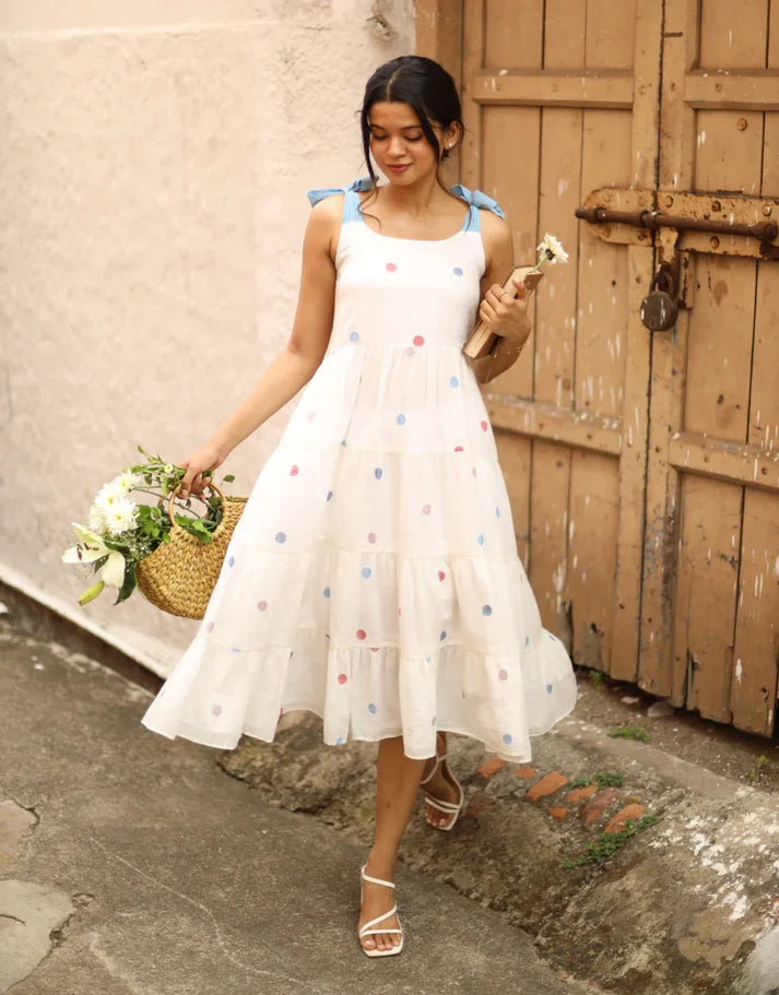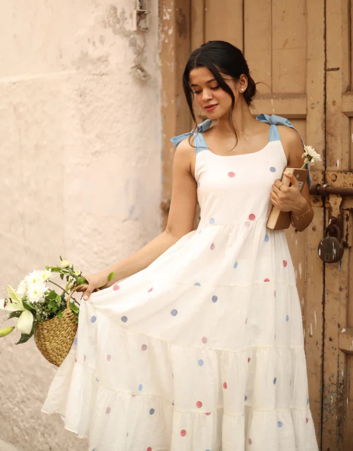 The Tier dress designed with contrasting strap tie-ups on the shoulders, a corseted yoke and tiers of gathers is crafted from Jamdani cotton fabric, in a delightful combination of white base with blue and pink polka dots.