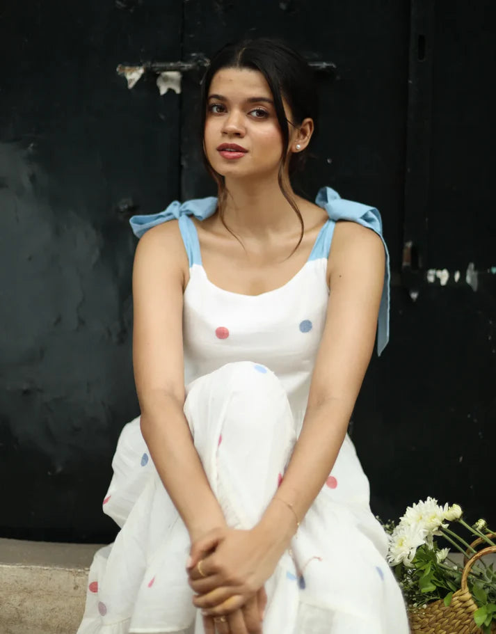 The Tie Up dress designed with contrasting strap tie-ups on the shoulders, a corseted yoke and tiers of gathers is crafted from Jamdani cotton fabric, in a delightful combination of white base with blue and pink polka dots.