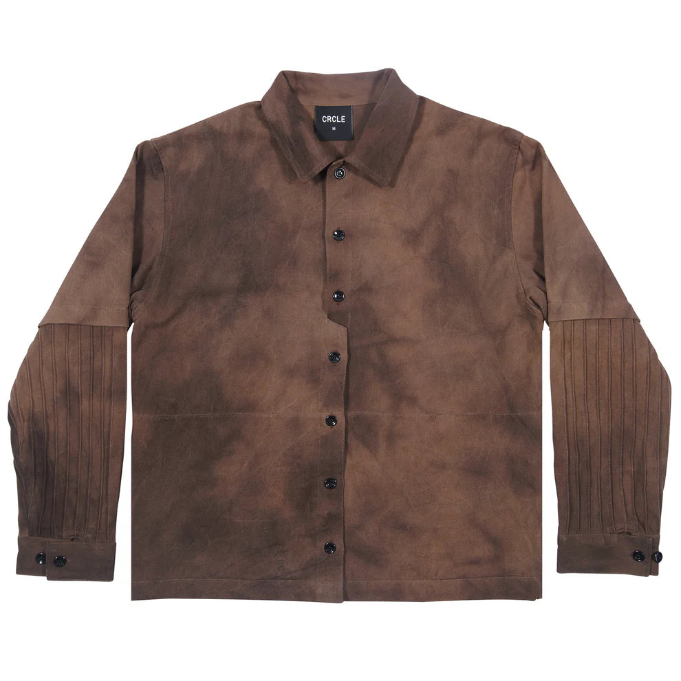 Double sleeve Jacket with irregular front button placket, crush tie and dyed and pintucks on sleeves. Pockets on both side seams.