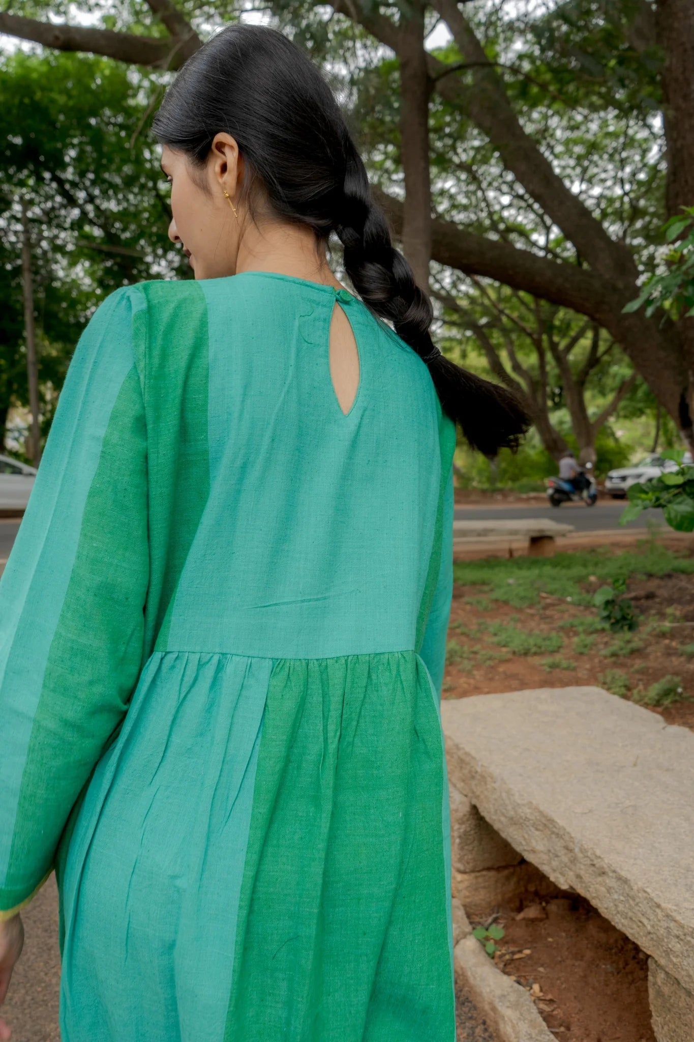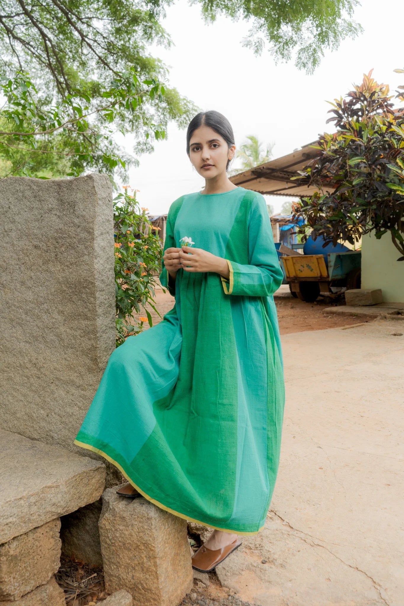 Green-panelled dress - A classic gathered dress with panels of green in kala cotton with yellow selvedge detailing.