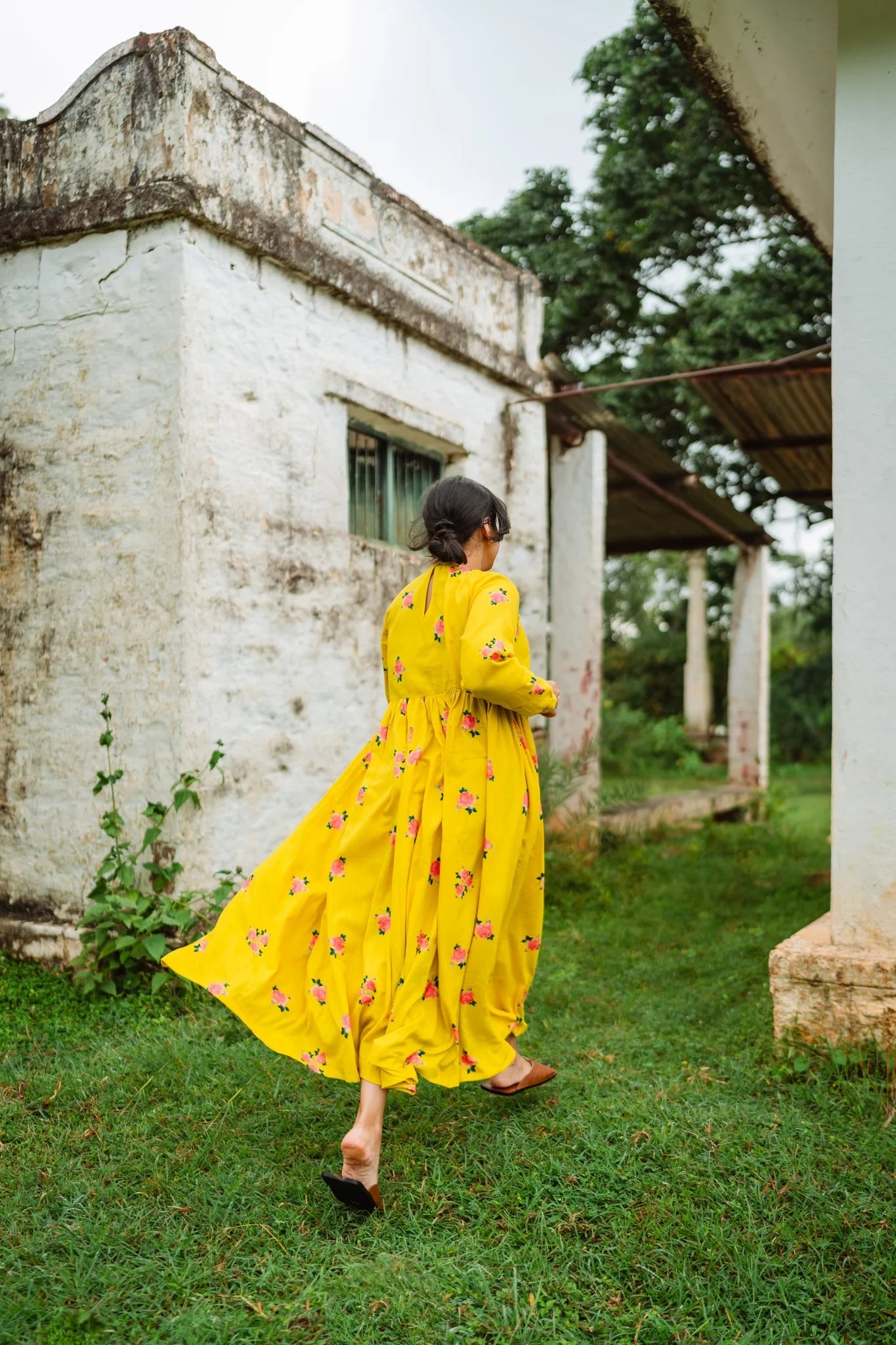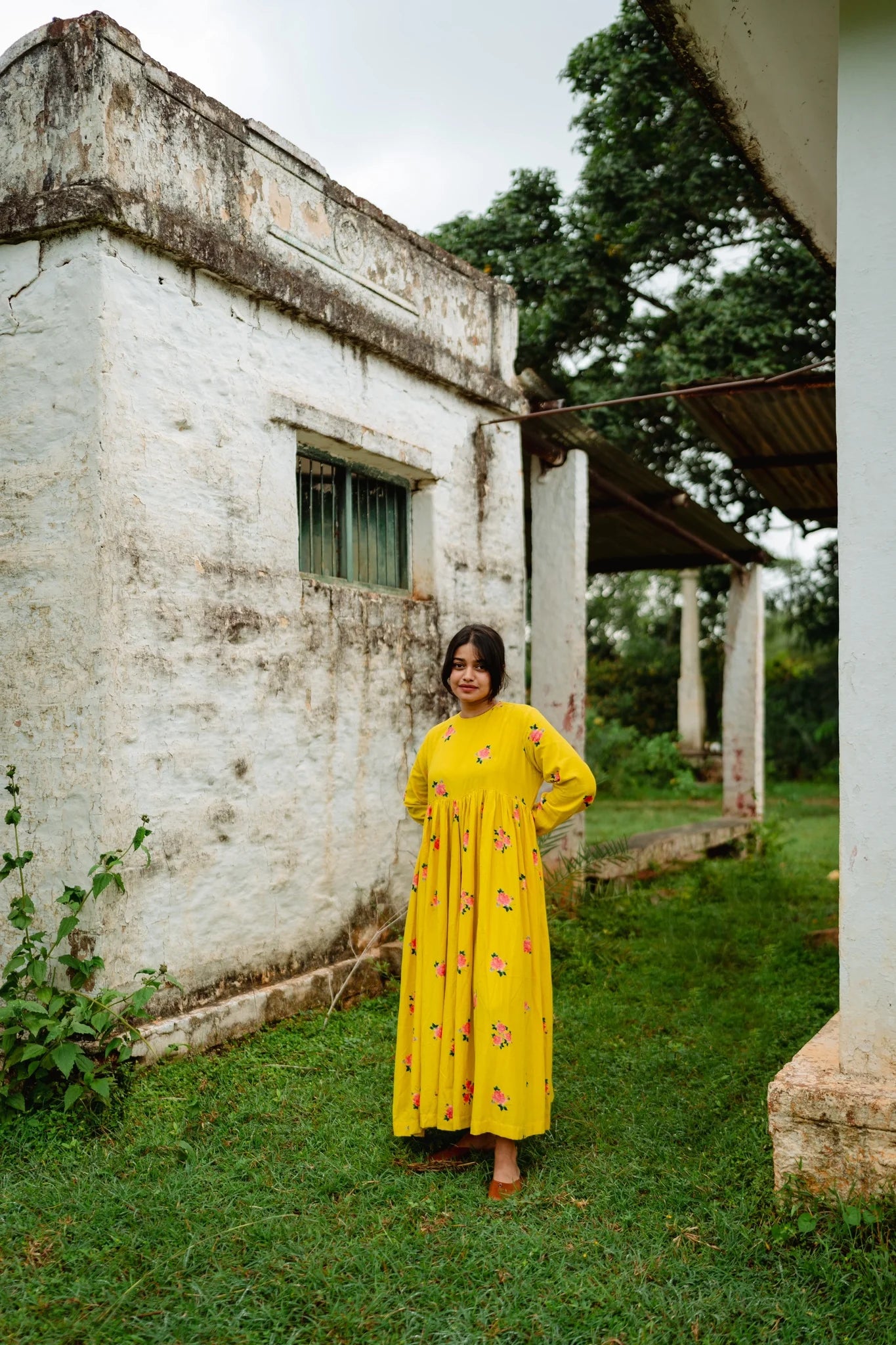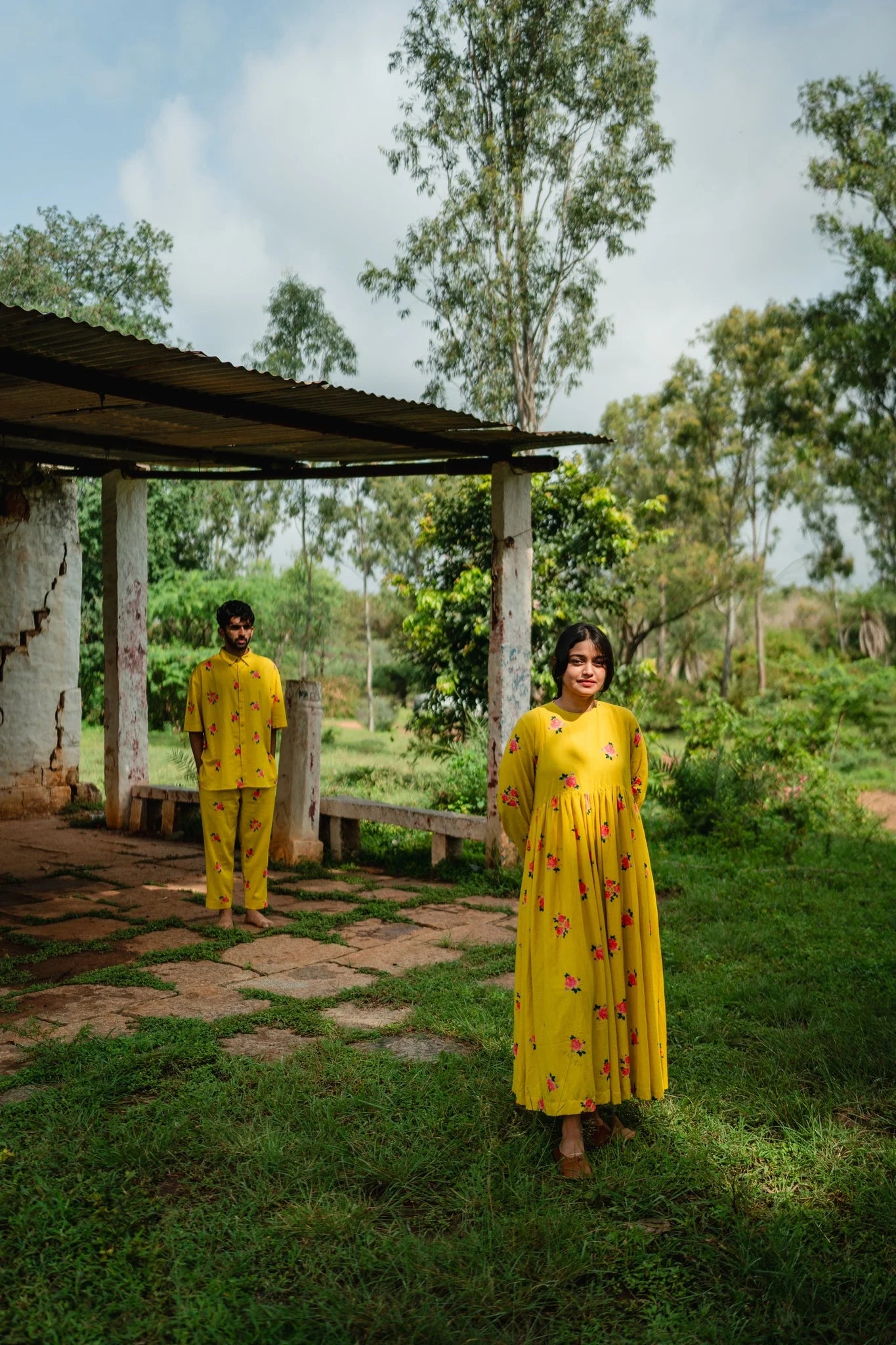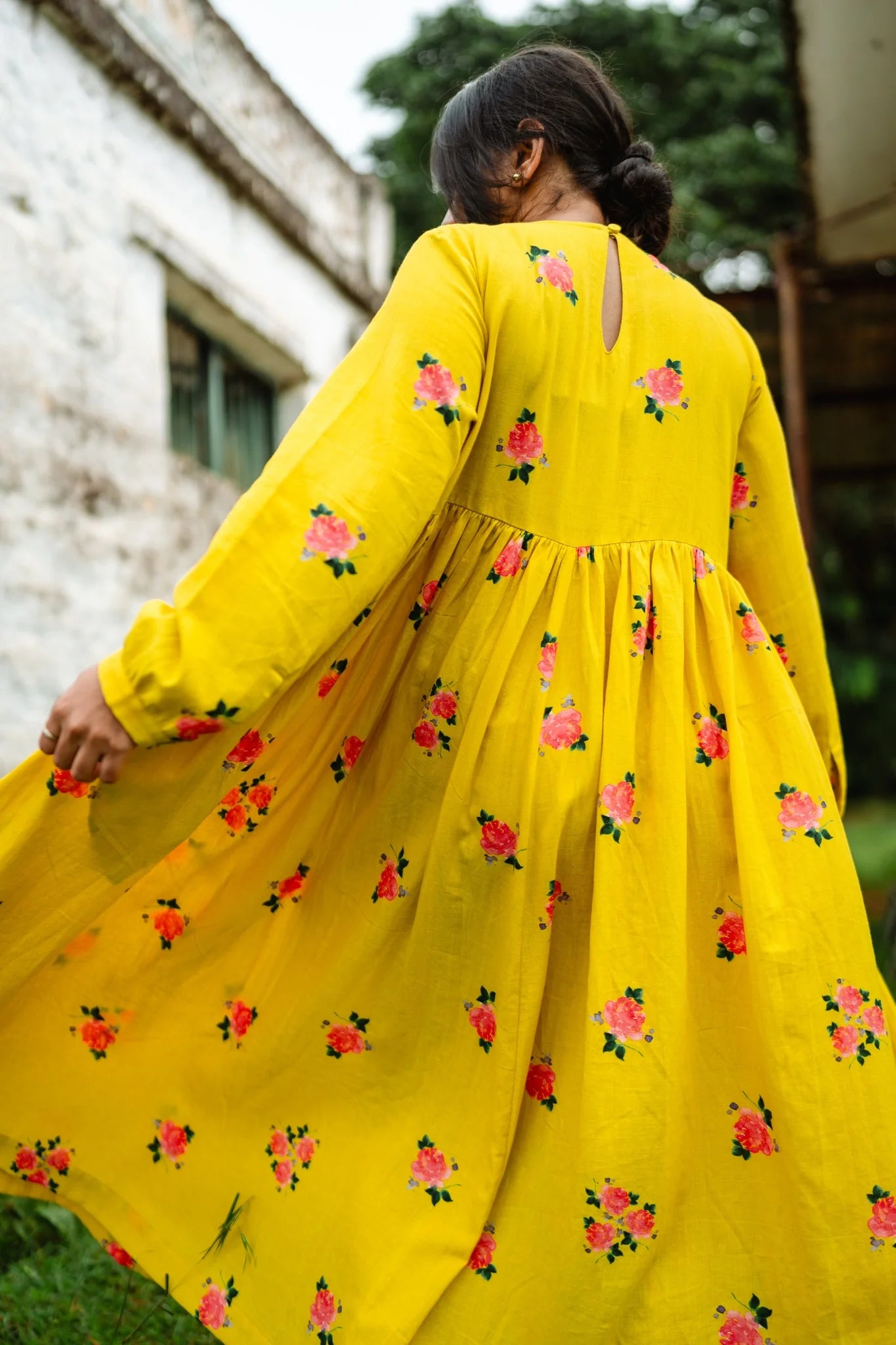 A free-flowing ,printed gathered dress in a lime yellow on a pure handwoven cotton.