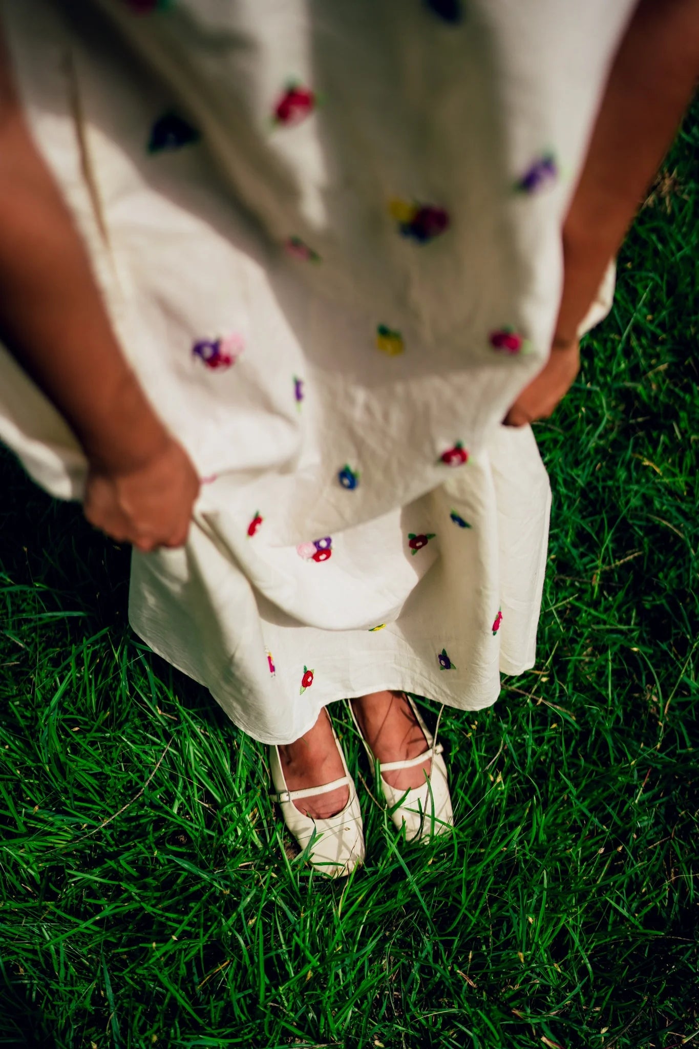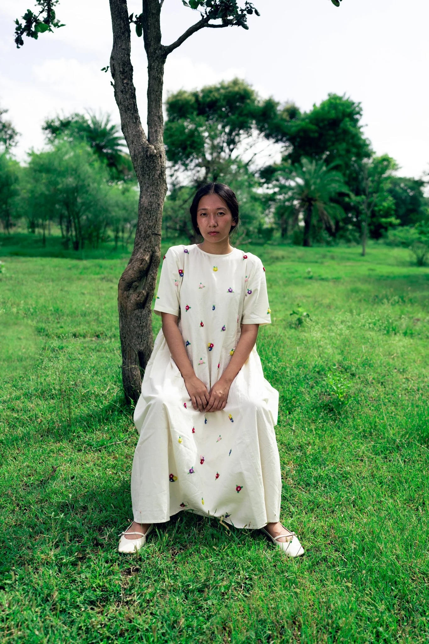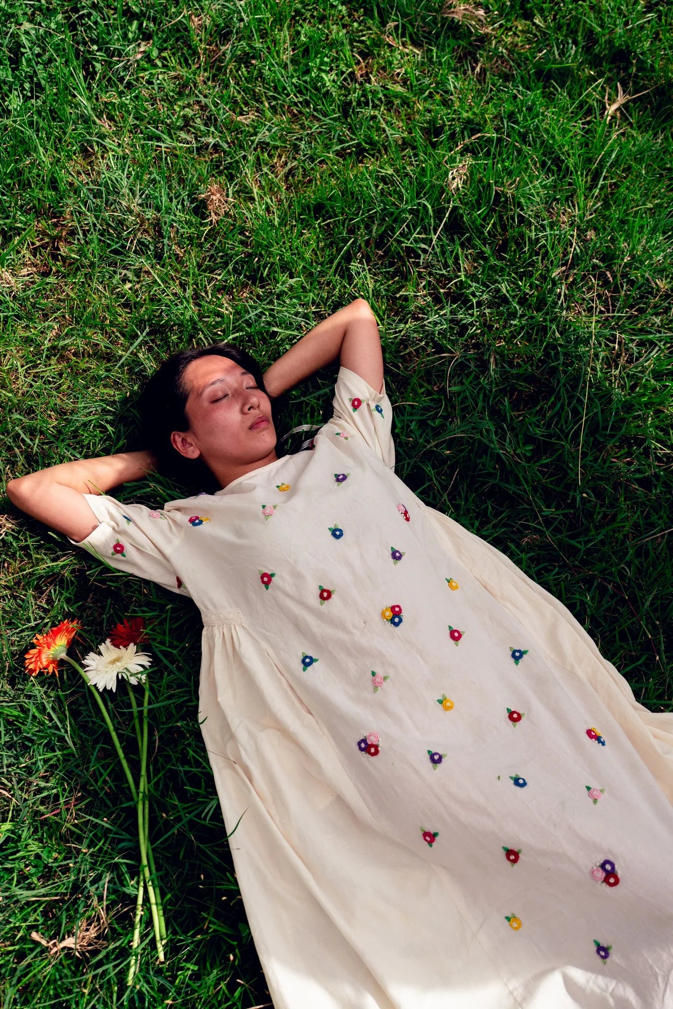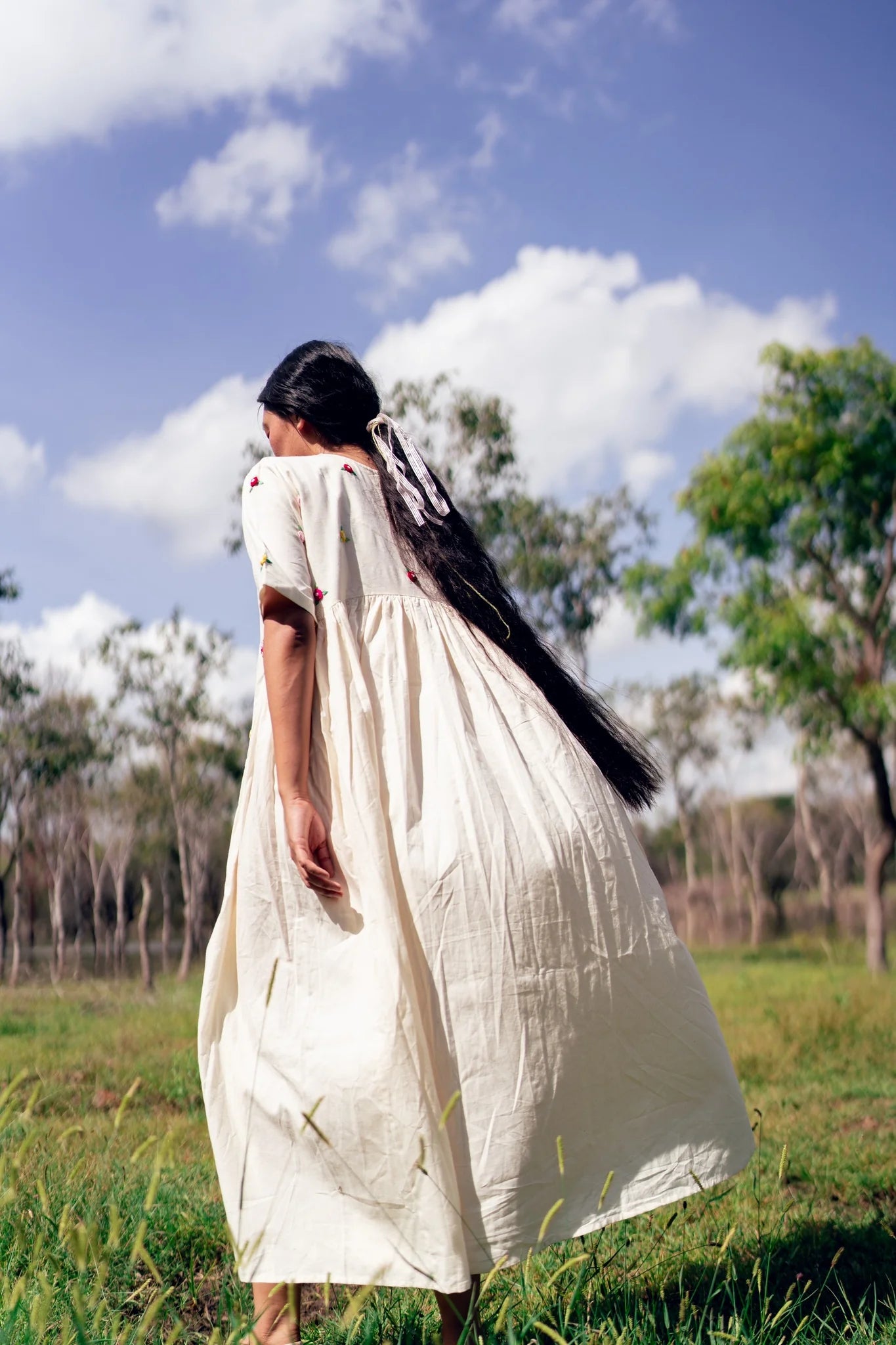 Hand-woven, hand-embroidered cotton dress with lace detailing.