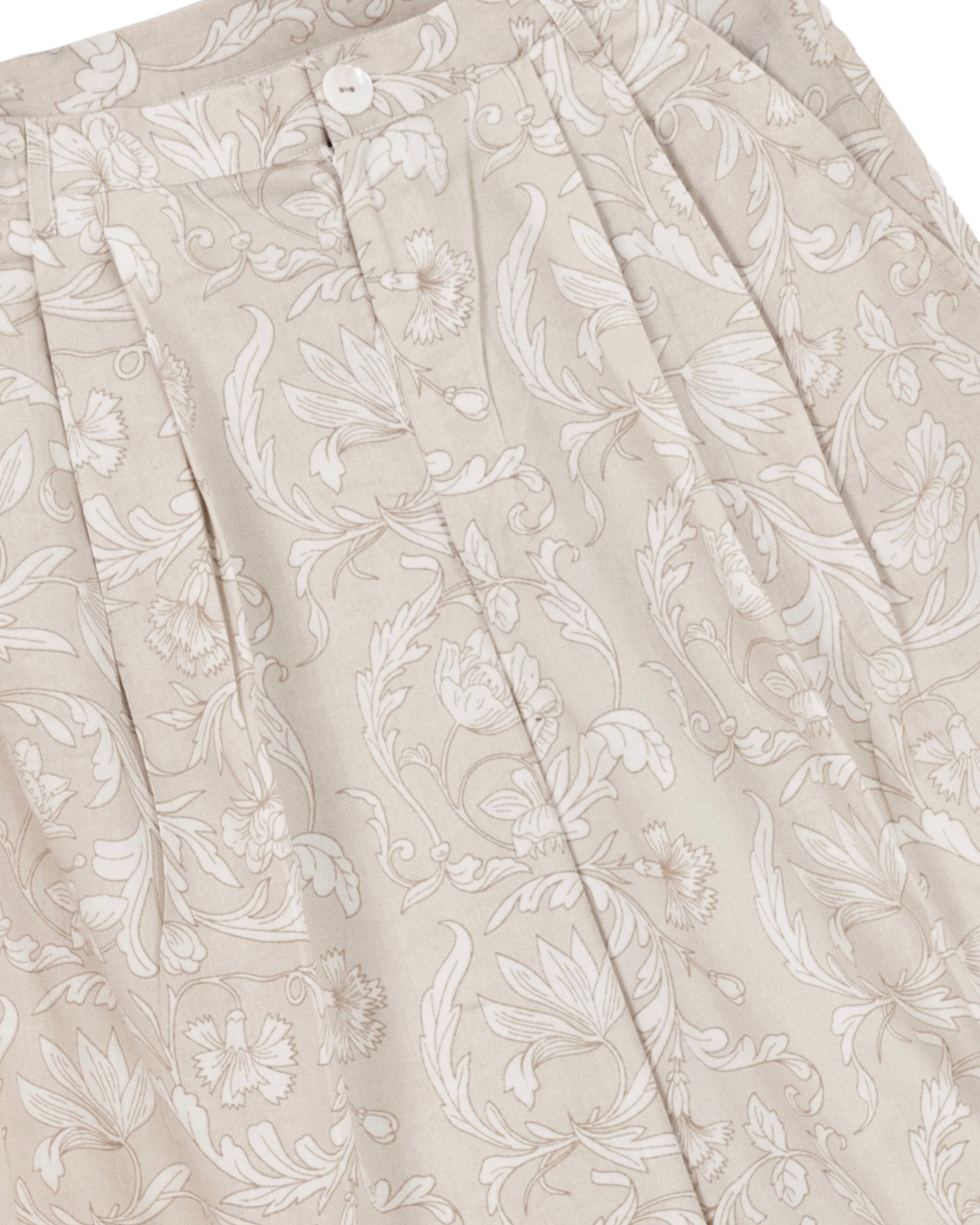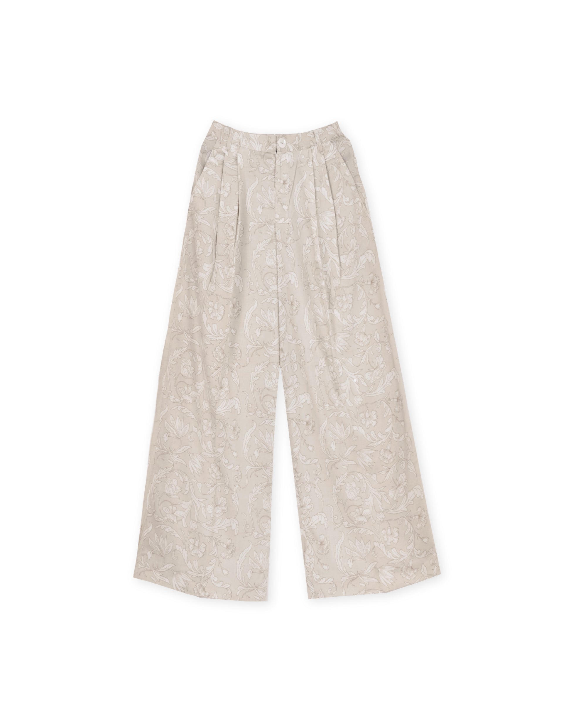 These wide-leg pants offer a seamless fusion of comfort and elegance. Crafted from airy, lightweight fabric, they drape beautifully, allowing for effortless movement. The relaxed fit is complemented by an elastic waistband at the back, ensuring both style and ease. A subtle floral pattern enhances their refined aesthetic, making them the perfect match for the coordinating shirt or a versatile standalone piece.