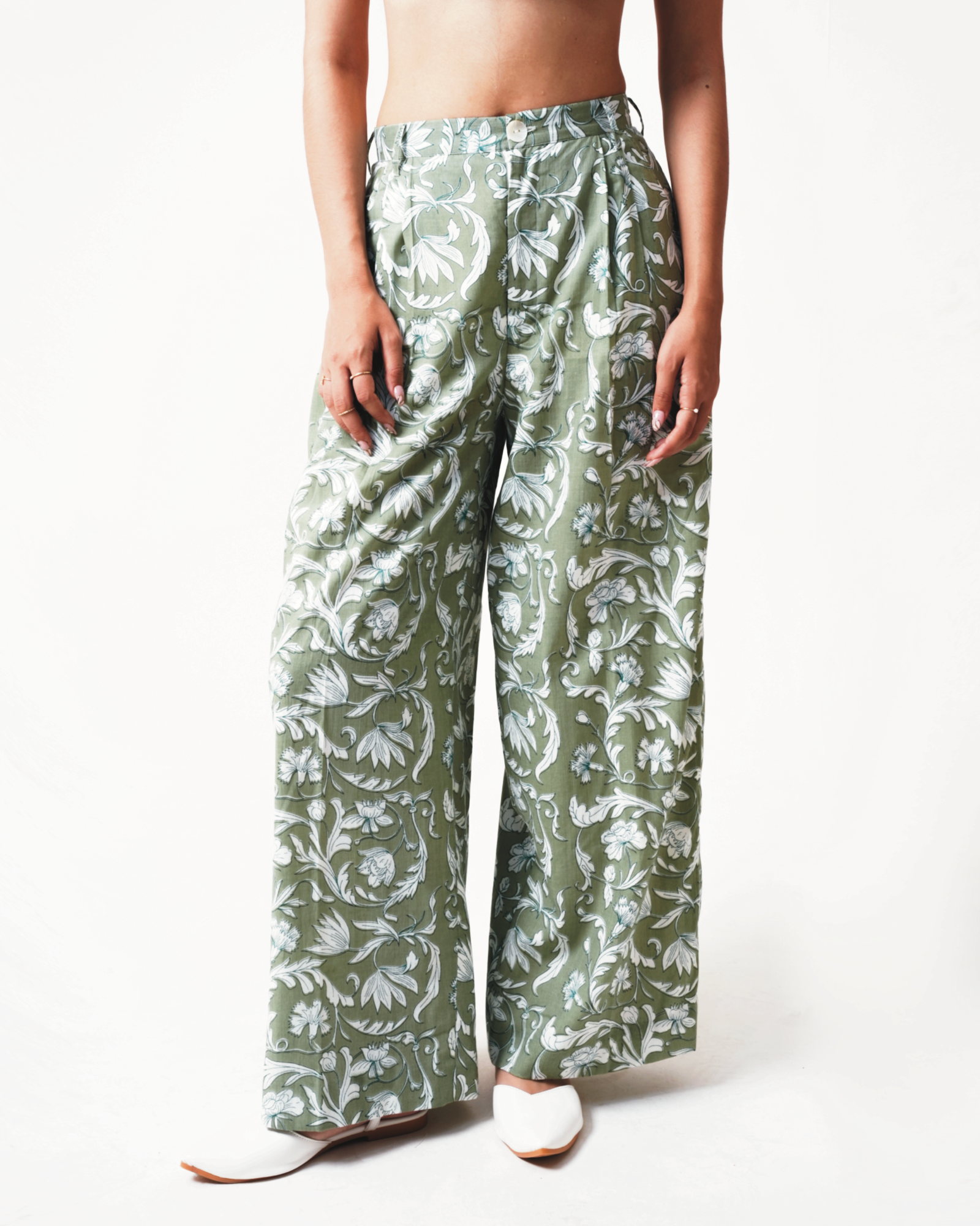 These wide-leg pants offer a seamless fusion of comfort and elegance. Crafted from airy, lightweight fabric, they drape beautifully, allowing for effortless movement. The relaxed fit is complemented by an elastic waistband at the back, ensuring both style and ease. A subtle floral print enhances their refined aesthetic, making them the perfect match for the coordinating shirt or a versatile standalone piece