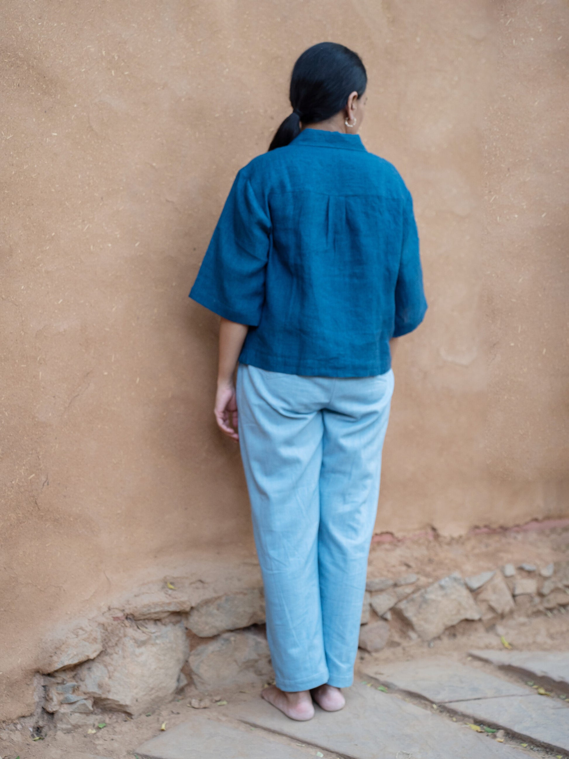 Finding the bluest blues, and living in them! A solid shirt with camp collar and elbow-length sleeves. Look closely for hints of red alongside the buttons for details. Box pleat at the back.