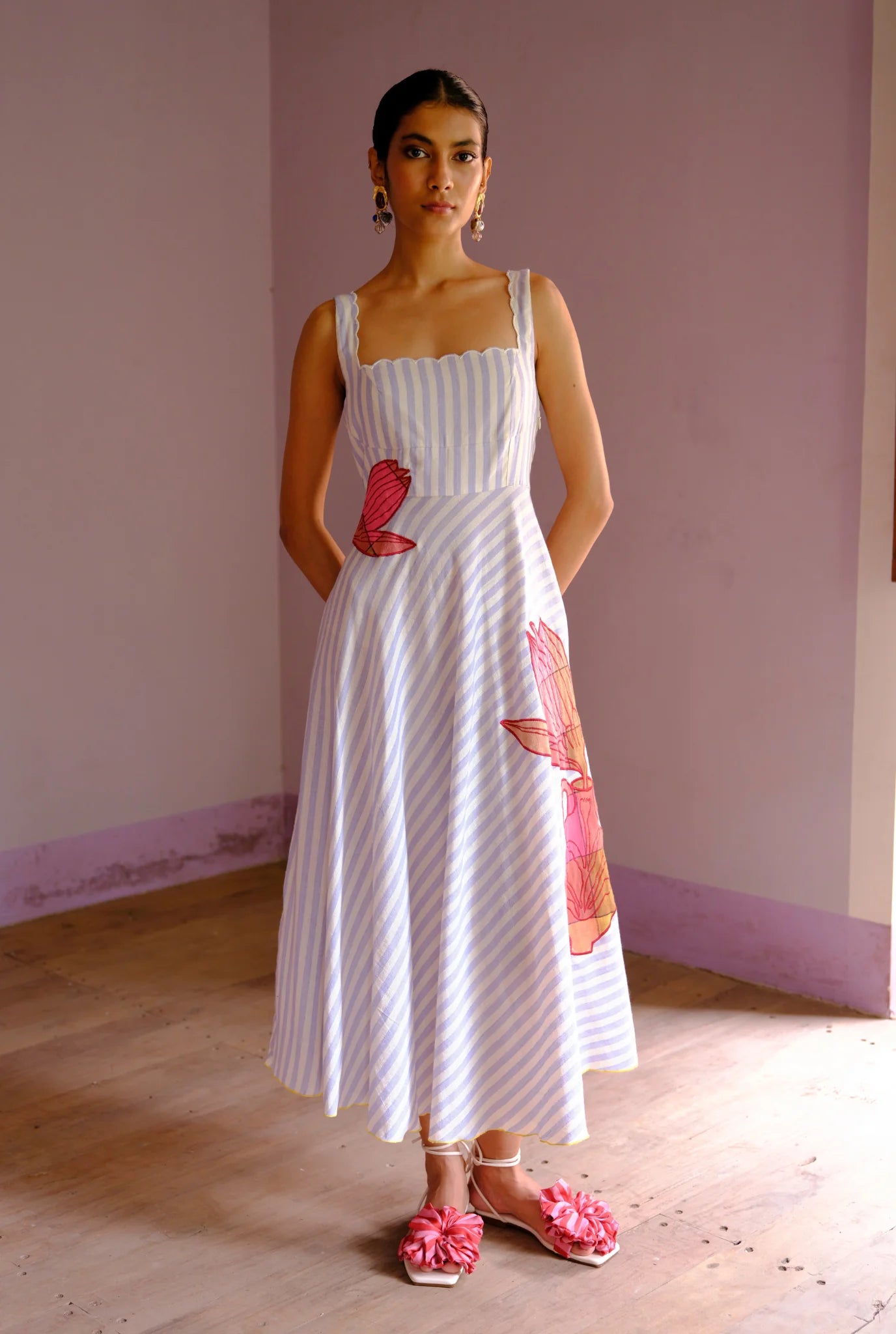 This fit-and-flare dress features a flattering scalloped neckline with intricate embroidery and appliqué detailing at the waist and the skirt. The handwoven cotton deserves a special mention—it’s soft to the touch and it feels lovely on the skin. Don’t miss the colourful detail on the hemline.