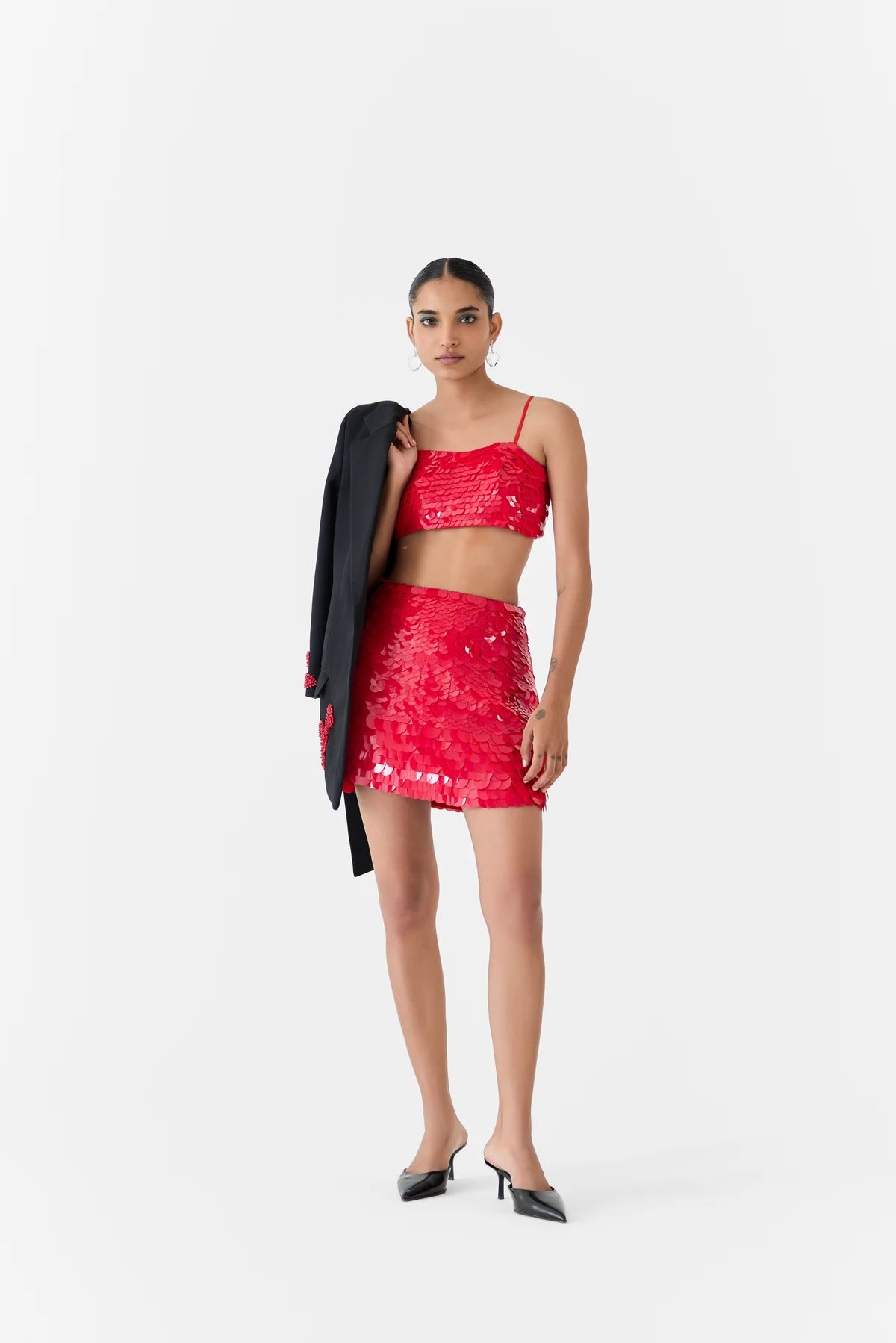 The Ruby sequin Bustier & Skirt Co-ord crafted from our stunning organza fabrication, trans-seasonal, is a statement piece. The sequin bustier has side hooks and adjustable straps. This skirt, made in our hand embroidered ruby sequin, has a straight fit. It has a side zipper and is lined. It can be paired with our Cherry Blazer . Wear it with heels for an elegant look.