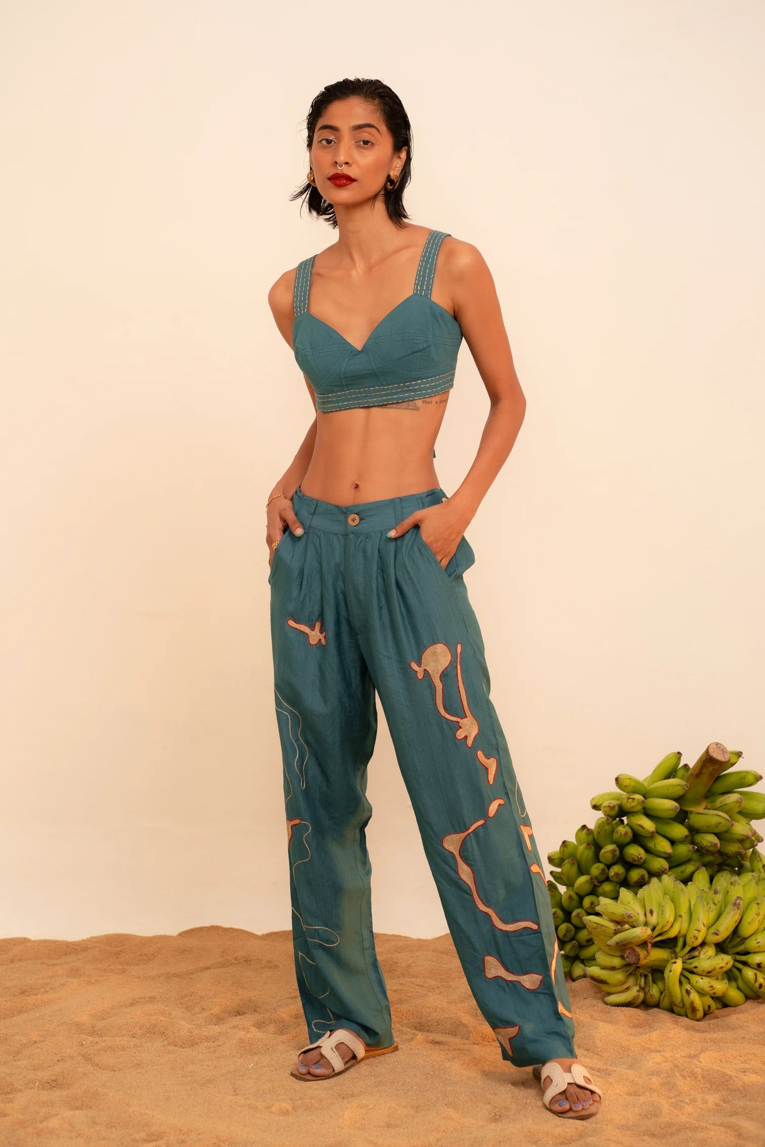 Our favorite silk trousers features hand-embroidered designs inspired by the ocean, its corals, and marine life by Lambani artisans, while the Eri (peace) Silk composition provides a soft and luxurious feel. The vivid ocean blue hue (created from a combination of marigold and indigo natural dyes) adds a perfect touch of vibrancy. Whether paired with the Coral Bralette and the Coral Silk Shirt or worn on its own with another top in your closet, this is a stylish statement piece is an artful and timeless addition to any wardrobe!