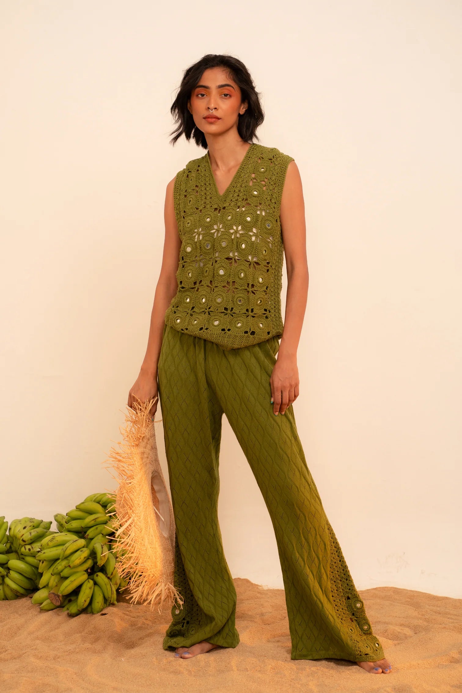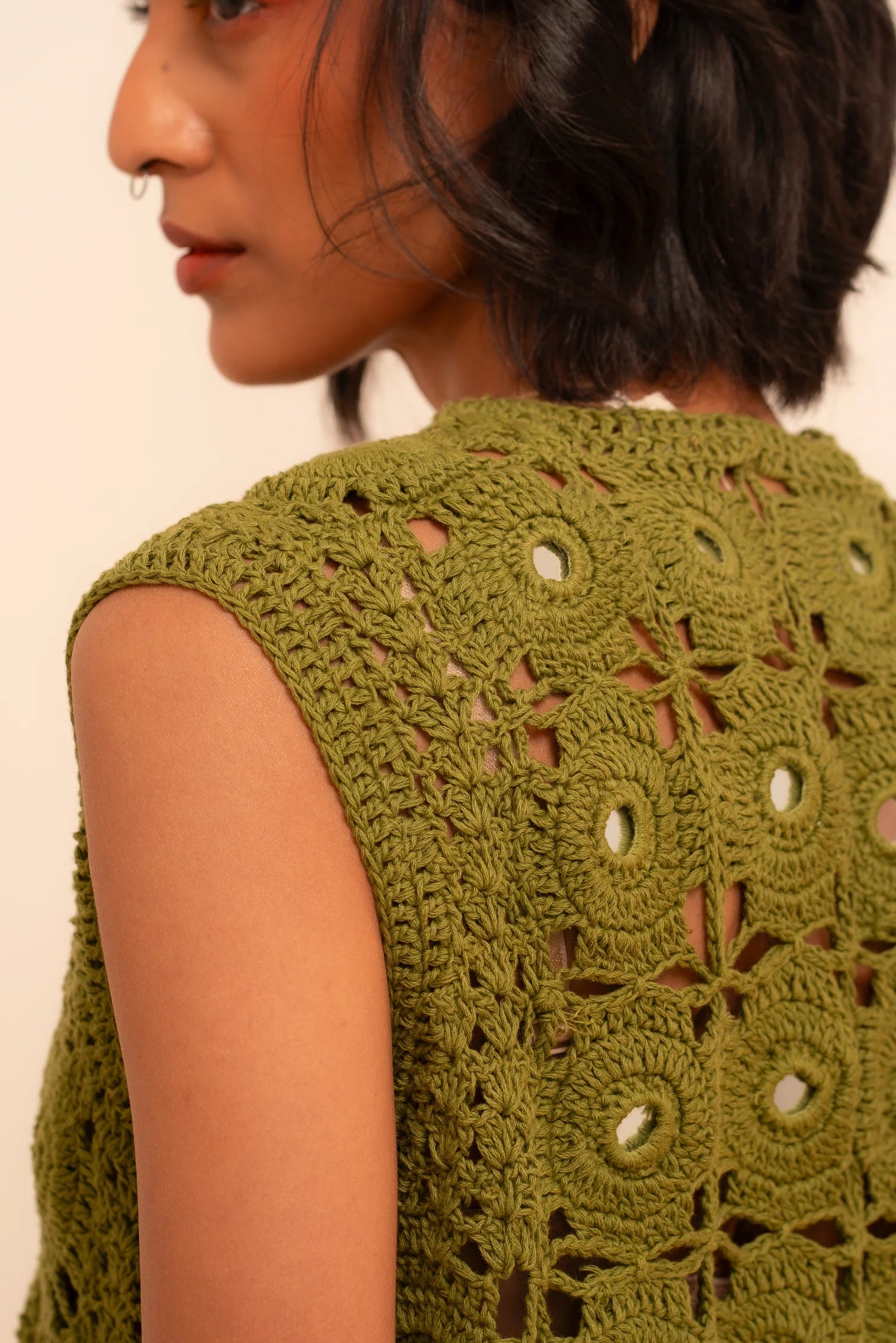 New hand-crochet vest made with recycled khadi (cotton) yarn and naturally dyed with marigold and indigo to achieve this beautiful seaweed green. The vest features intricate Lambani patterns and was hand-crocheted by skilled artisans. It was finished off with the skilled handiwork of traditional Lambani artisans who installed the mirror pieces onto the final piece that is a beautiful homage to traditional craftsmanship.