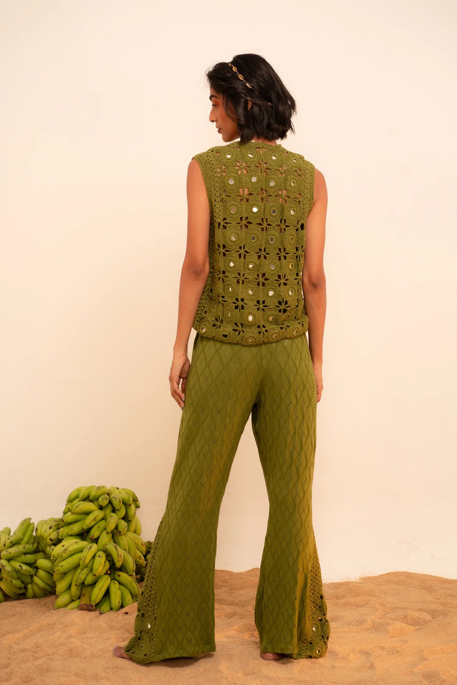 Elevate your wardrobe with these hand-knit Samudram Knit Flared Pants! Being hand-knit, this pant offers a stretch that contours with your body, providing comfort while remaining elegant. The pant features a hand-crochet panel with intricate Lambani patterns and mirror accents along the flare. Add a touch of natural color to your wardrobe with the seaweed green hue, crafted from natural dyes of indigo & marigold. Pair it with its matching Samudram Crochet Mirror Vest.
