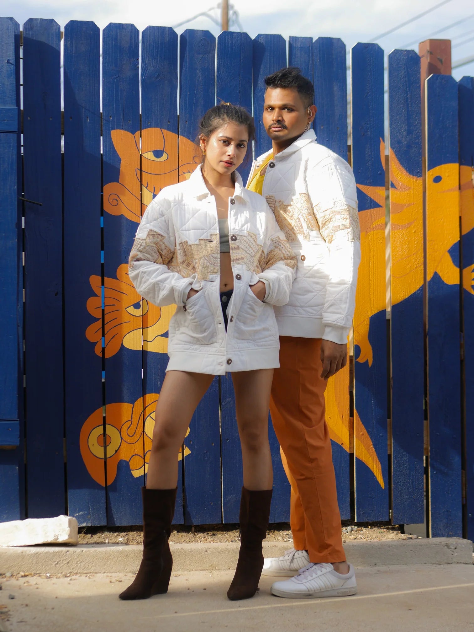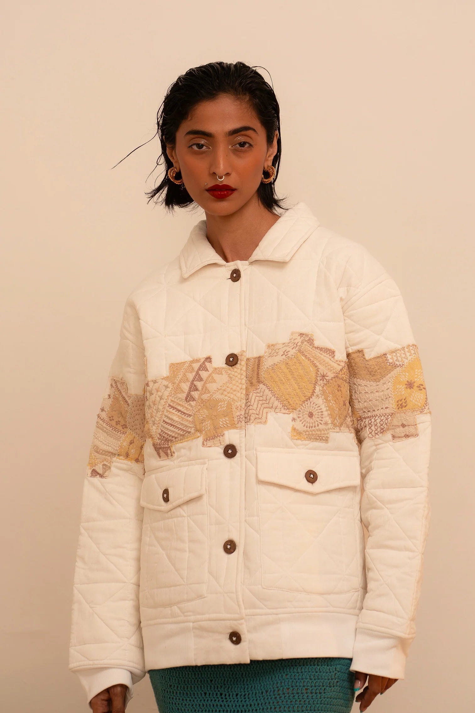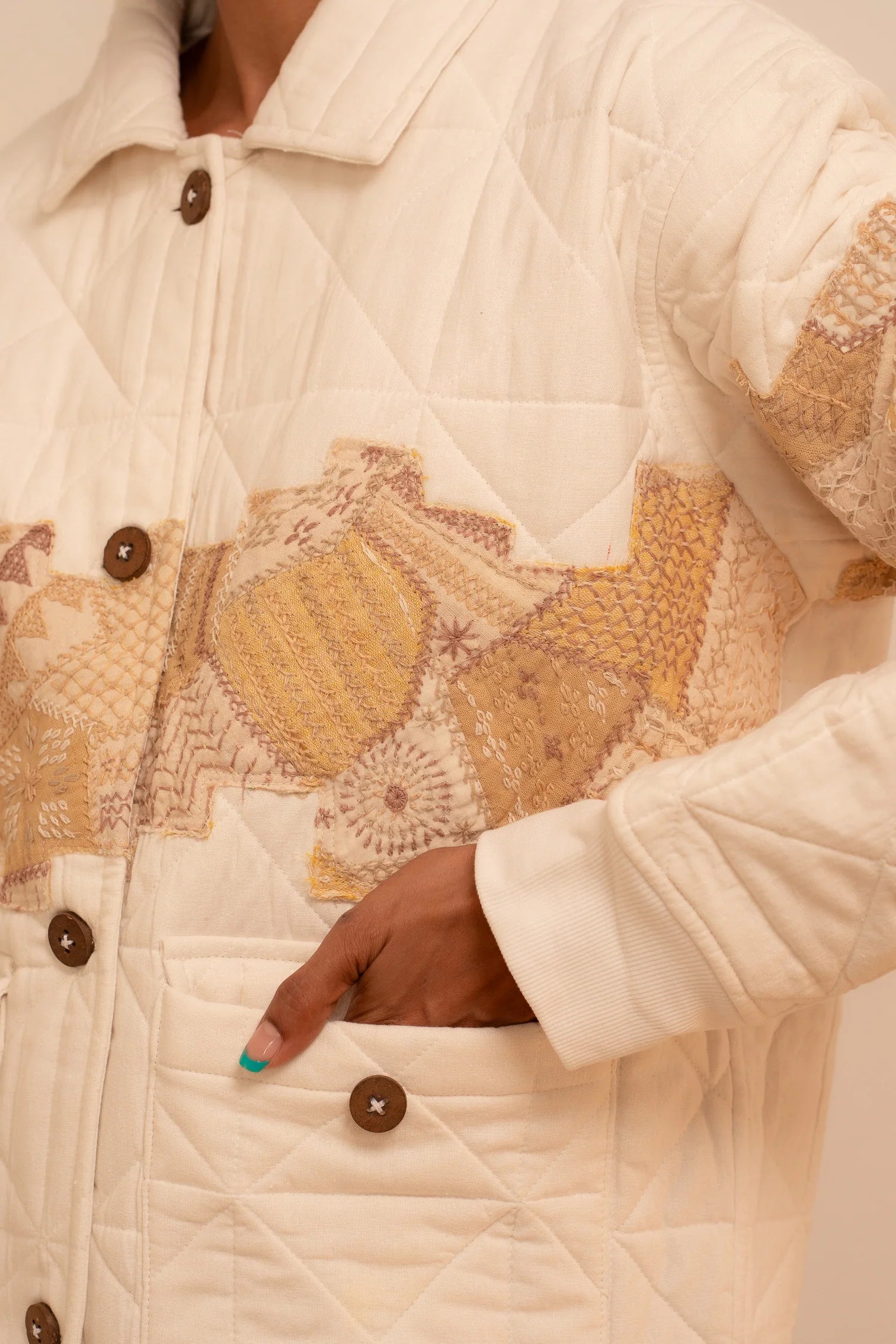 The Samudram Quilted Patchwork Jacket was made by our talented Lambani artisan partners, Sandur Kushala Kala Kendra, in Ballari, India. The patchwork pieces are hand-embroidered scrap Khadi fabric that were repurposed. They are stitched onto a quilted jacket also made from Khadi fabric. Together, they make this beautifully handcrafted, multi-purpose jacket - perfect for a cool, breezy day!