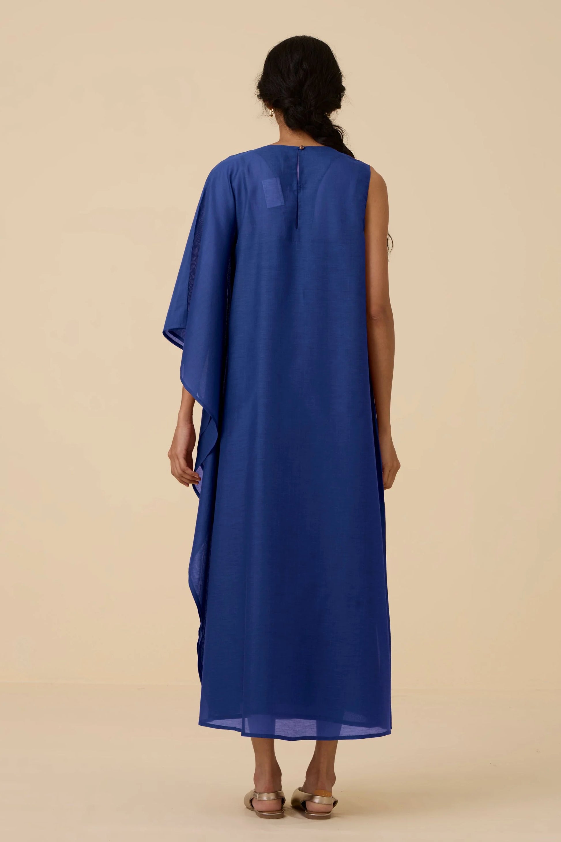 A stunning ensemble with a captivating one-shoulder drape. The back button loop fastening adds a refined touch. Slip included.