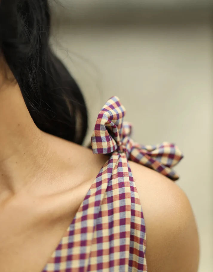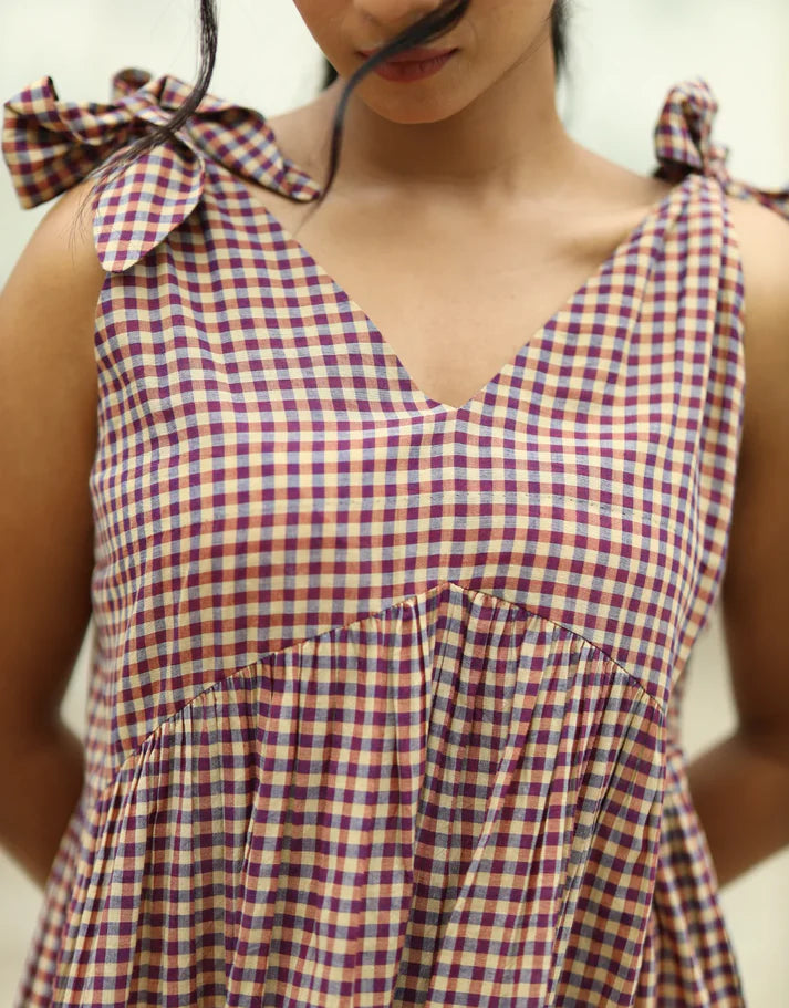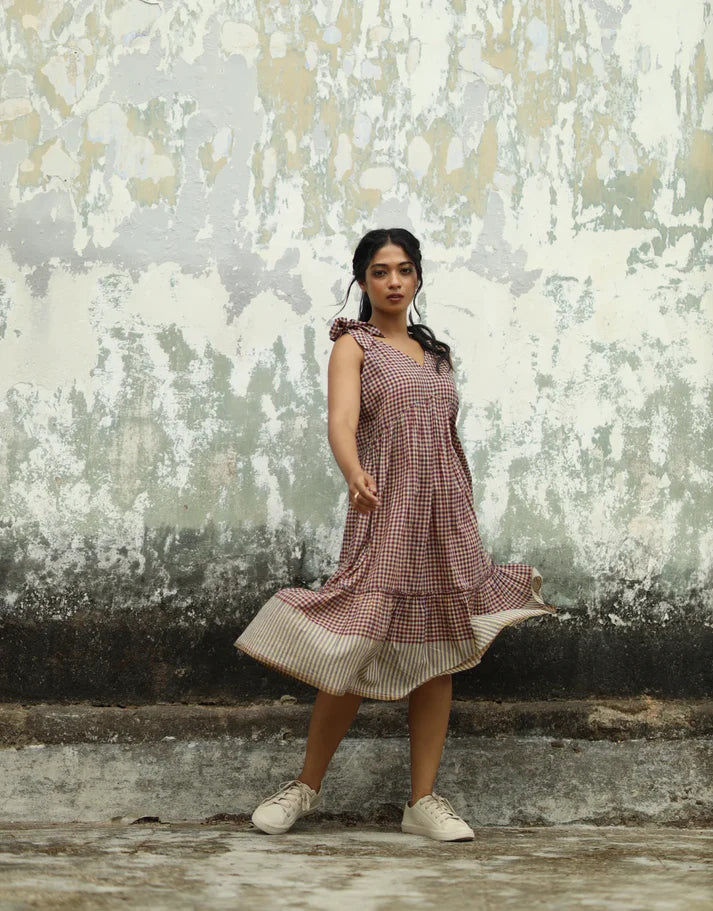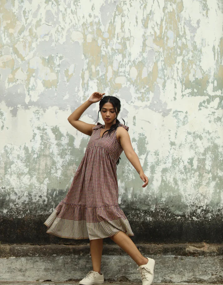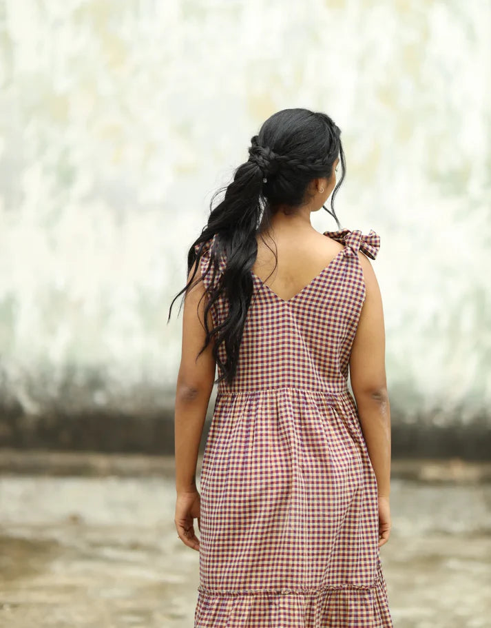 Classic Brown tie-up dress crafted in brown Handloom check cotton Fabric. The yoke cut and gathered hem complete the dress.