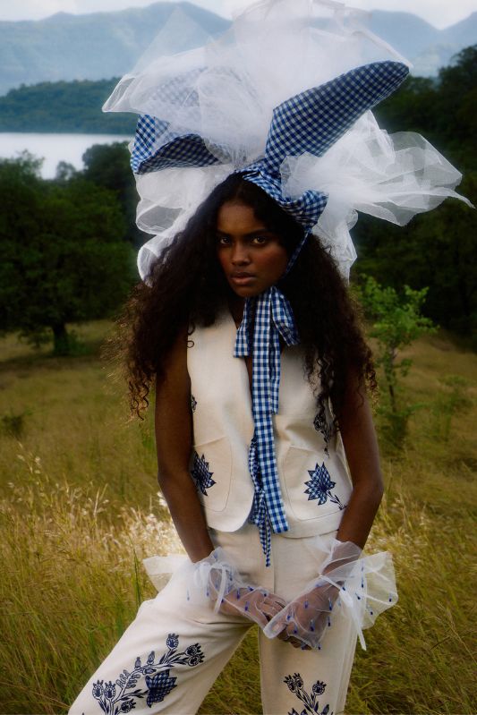 A cropped, sleeveless vest crafted from handwoven white denim. It features a V-neck and a front tie-up closure with a gingham detail. The piece is accented with rich navy blue floral applique on the chest and is perfect for adding artisan texture to a layered look.