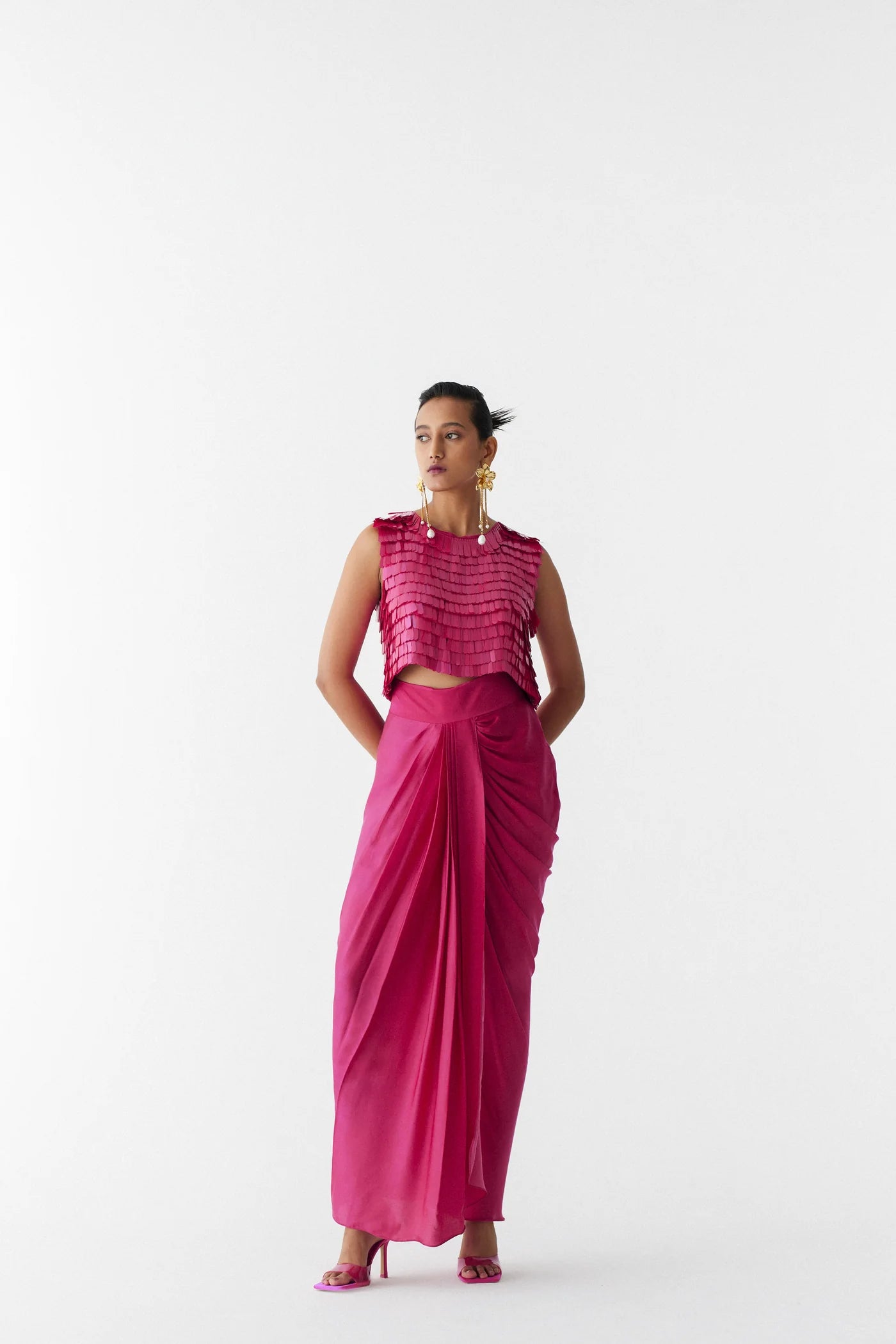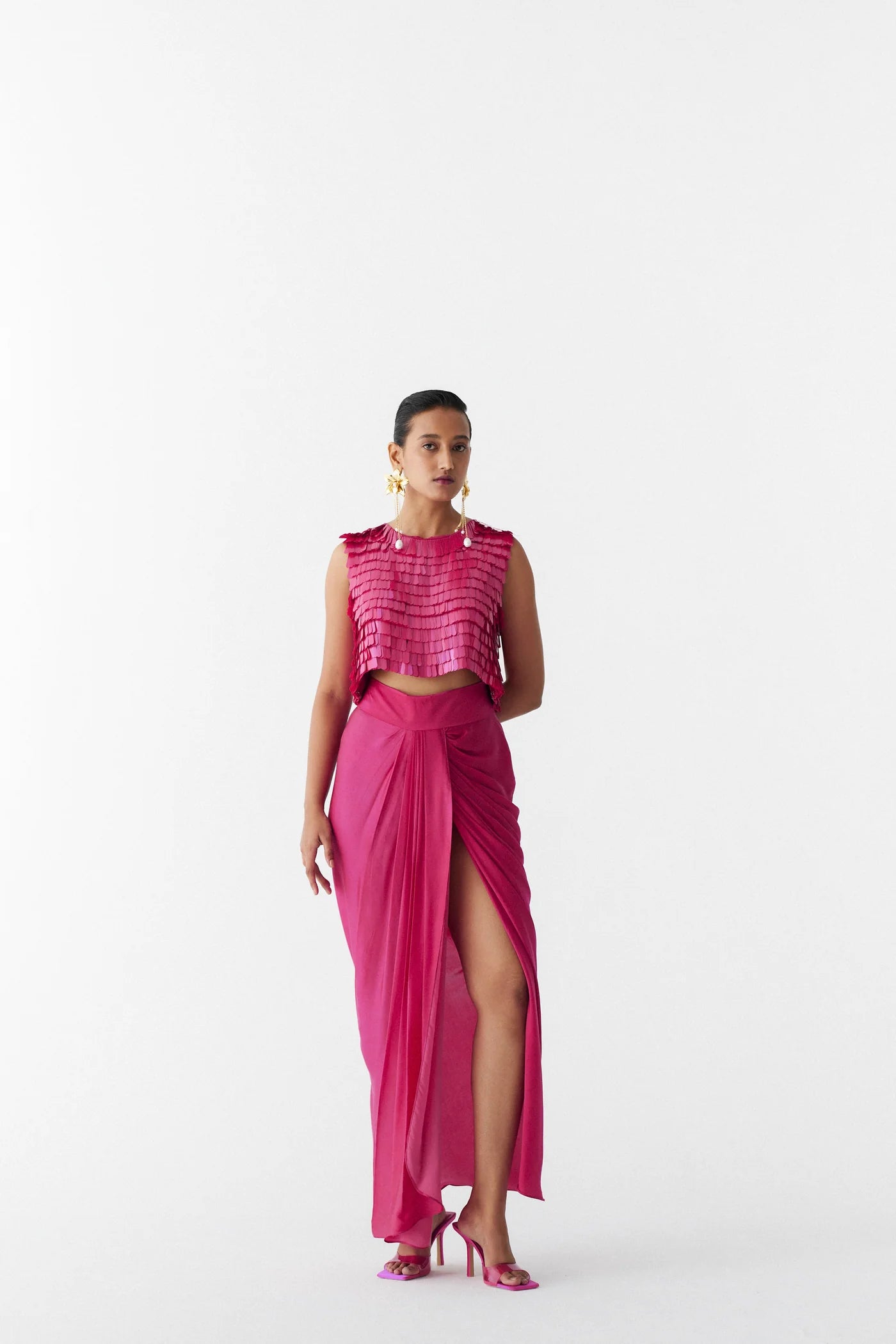 The Scarlet Sequin Blouse & Drape Skirt crafted from our stunning Vegan silk fabrication, trans-seasonal, is a statement piece. Made from our hand-embroidered sequin, this blouse has a side zipper and keyhole. Featuring a short blouse, this piece has a draped skirt with a side zipper paired with it. Formal and elegant, this is a party favourite.