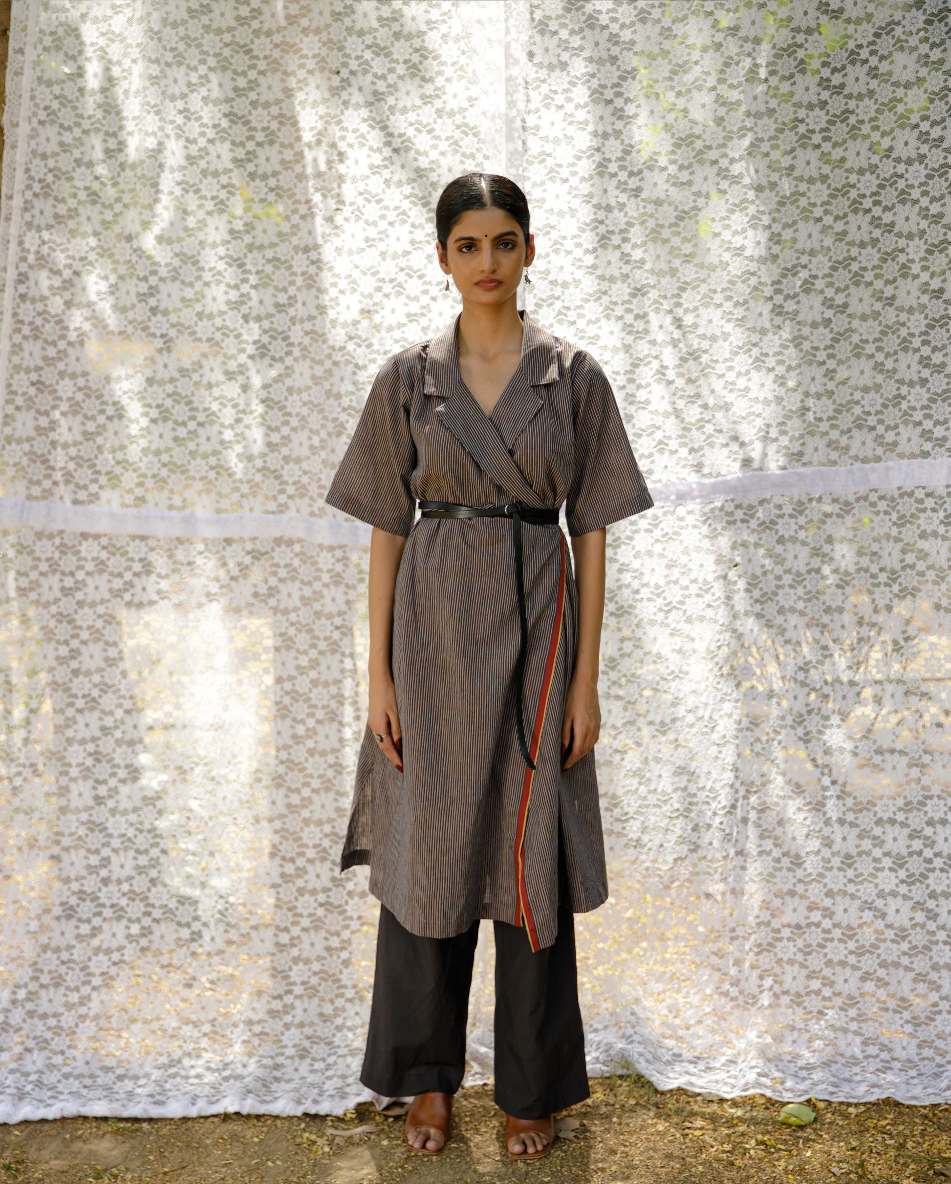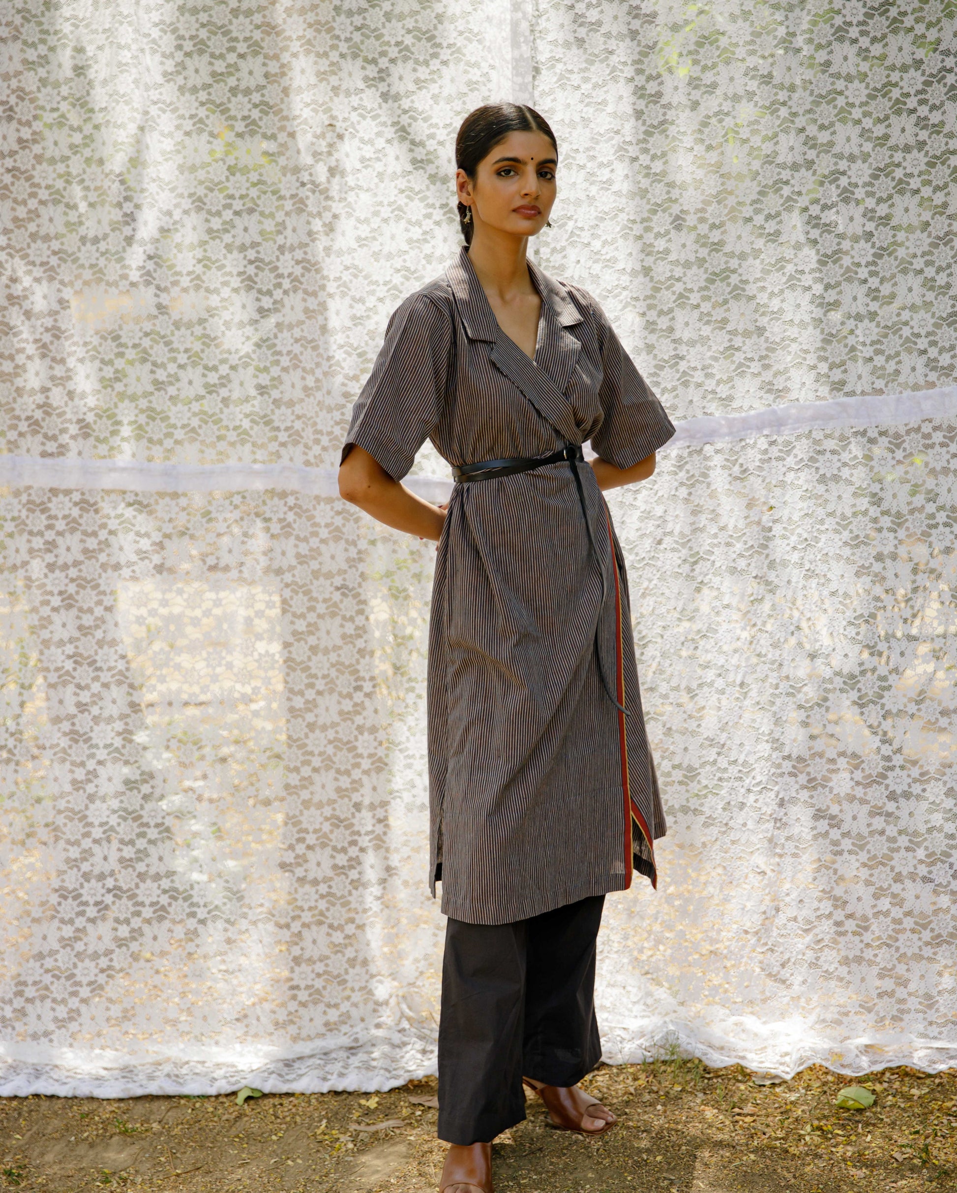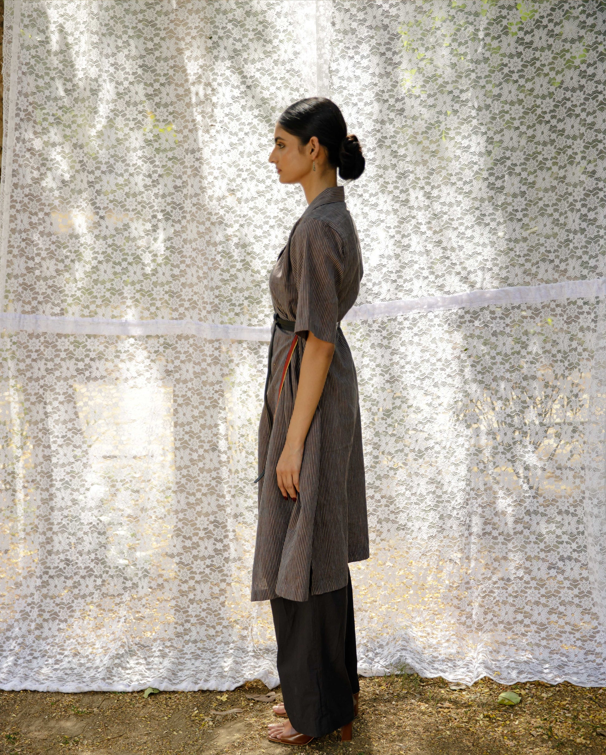 Our Selah tunic, is our take on a classic Kurta, It features a chic notch collar and contrast edge detail, crafted from handwoven Malkha cotton from Tamil Nadu. In this garment there is a weave of alzerin red, Dark Indigo and the creamy colour of cotton lint,the fabric first looks tough but once it rubs against your skin it will be surprisingly soft, its ethically sourced and promotes local weavers. Its perfect for everyday wear from bussiness to casuals.