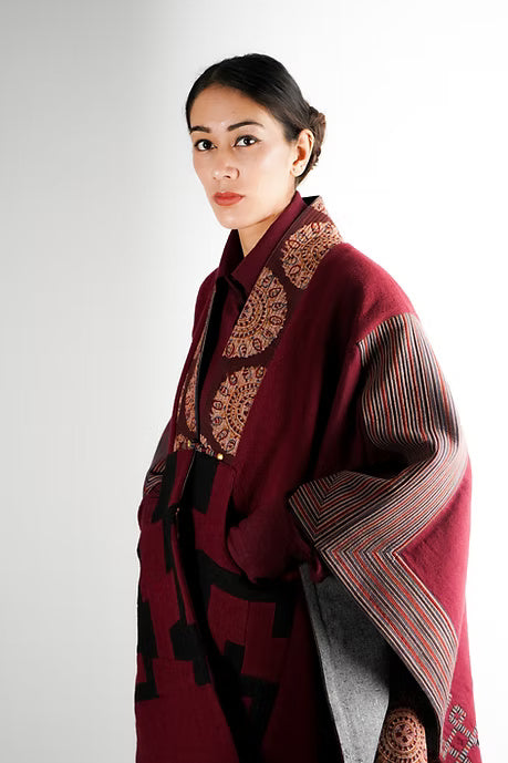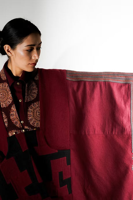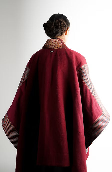 Crafted from handwoven Nambu wool in deep maroon, the Shantap Cape Poncho is a versatile layering piece that embodies warmth, structure, and ease. Designed with a front-split silhouette, it features patched kangaroo pocketsfor functionality and dimension, accented with intricate tag work that adds a signature artisanal touch. A single Tubchi button closure at the front pays homage to traditional metal fastenings, seamlessly blending heritage with contemporary wearability.