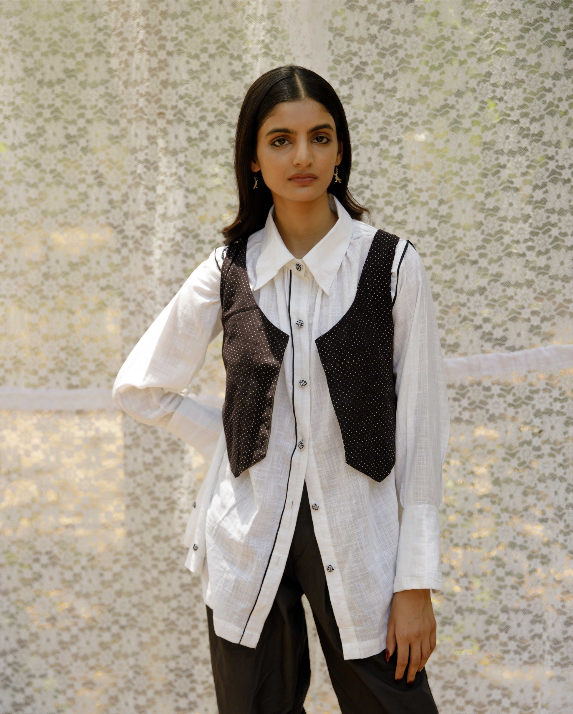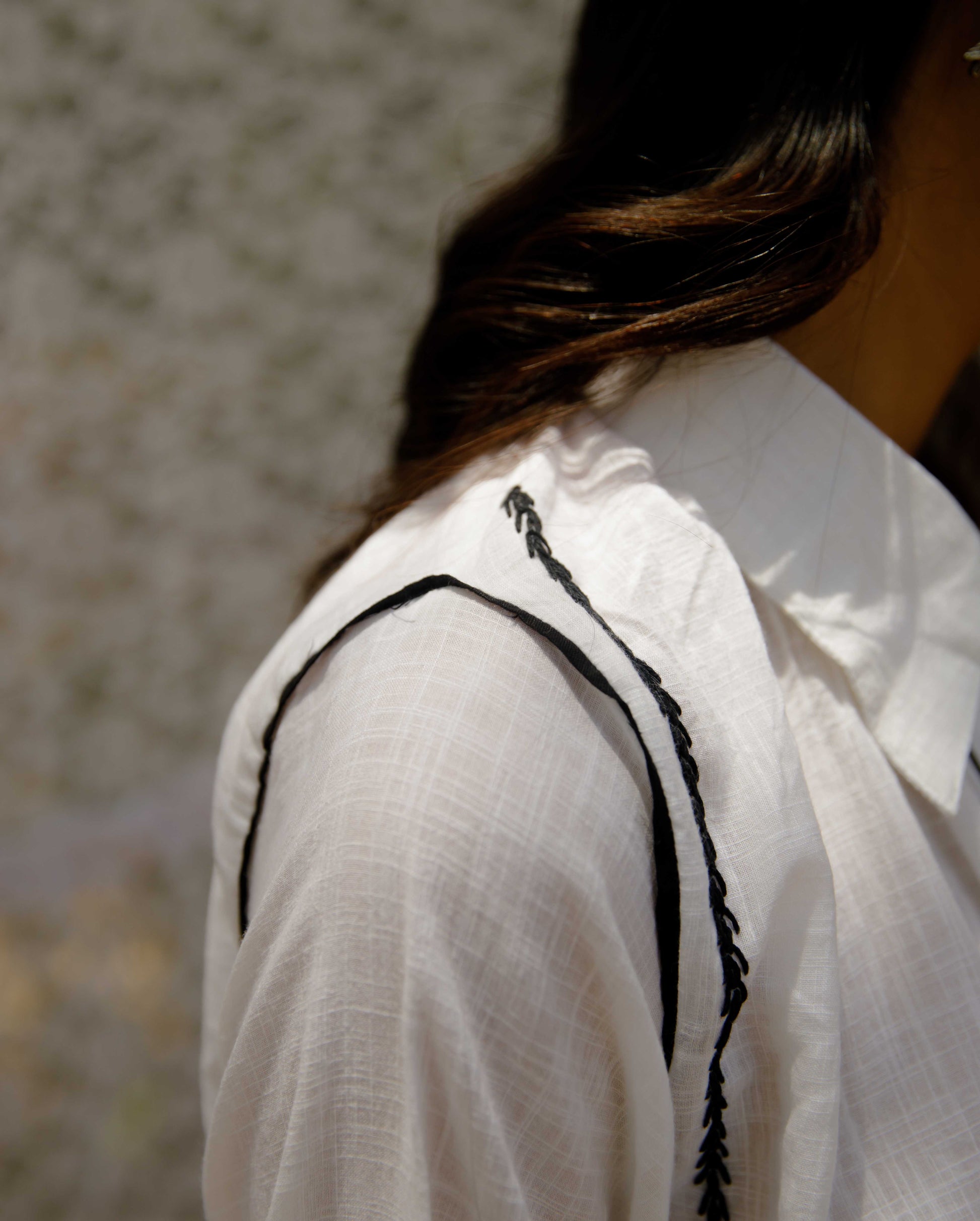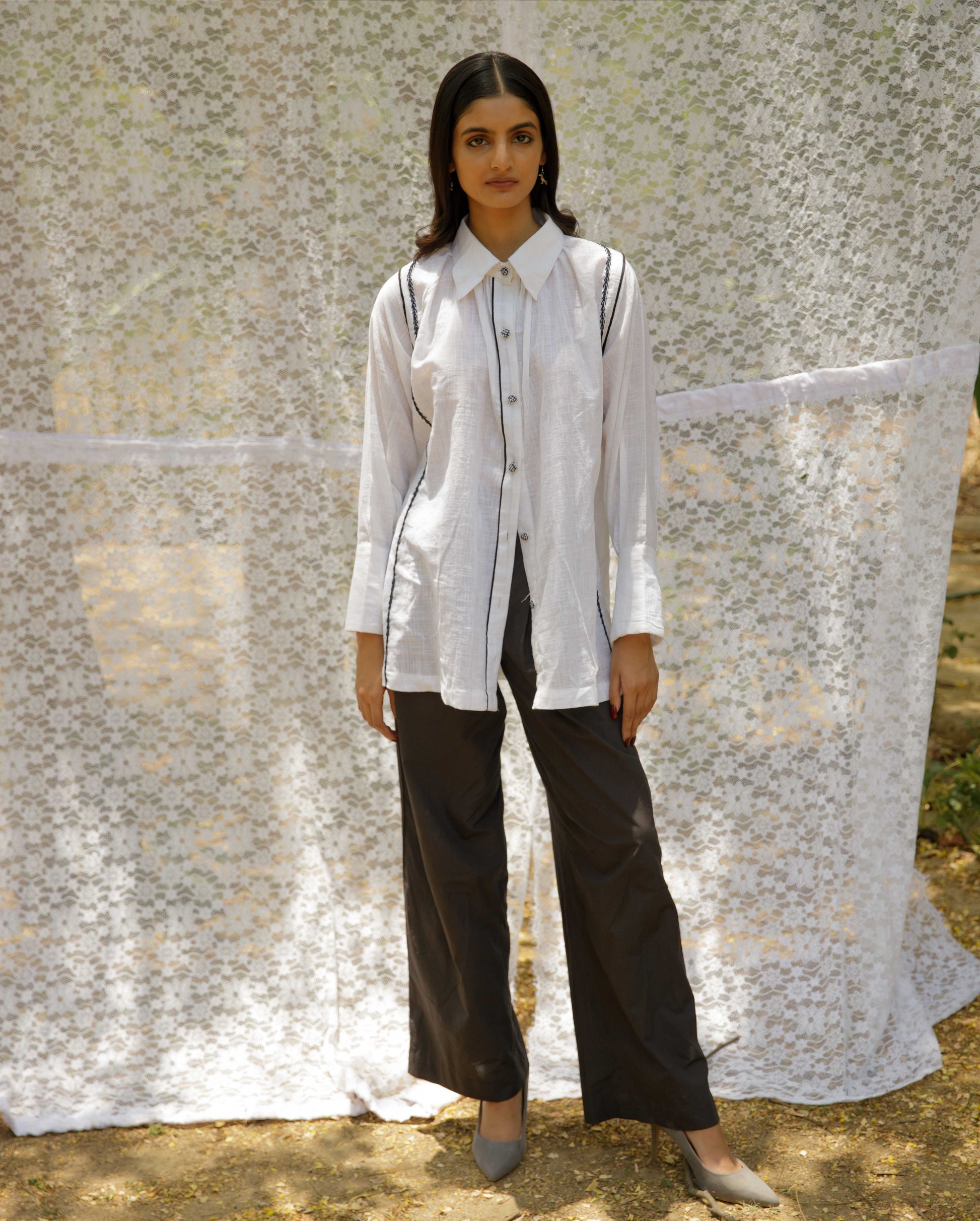 Shunya shirt is our ode to the basic white shirt, made in breathy 100% linen slub, with black piping details, embroidered buttons and embroidery details. It has a relaxed fit with open-pleat detail sleeves and broad open cuffs.
