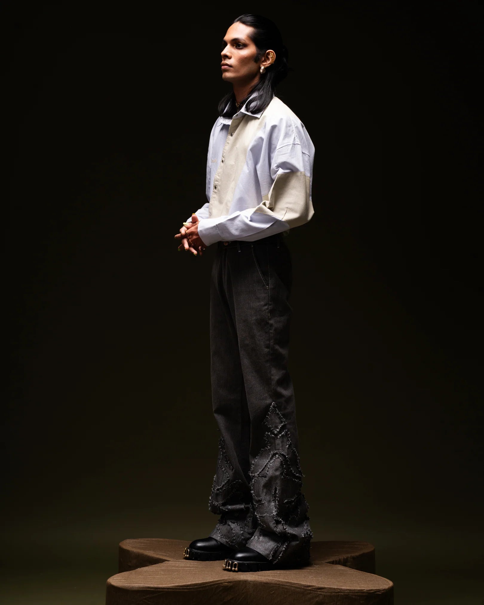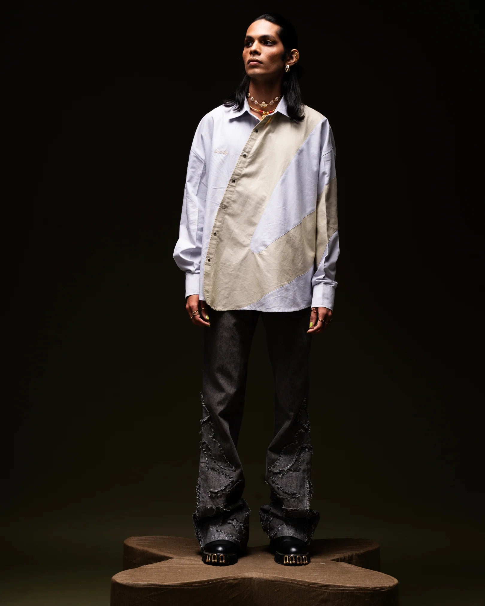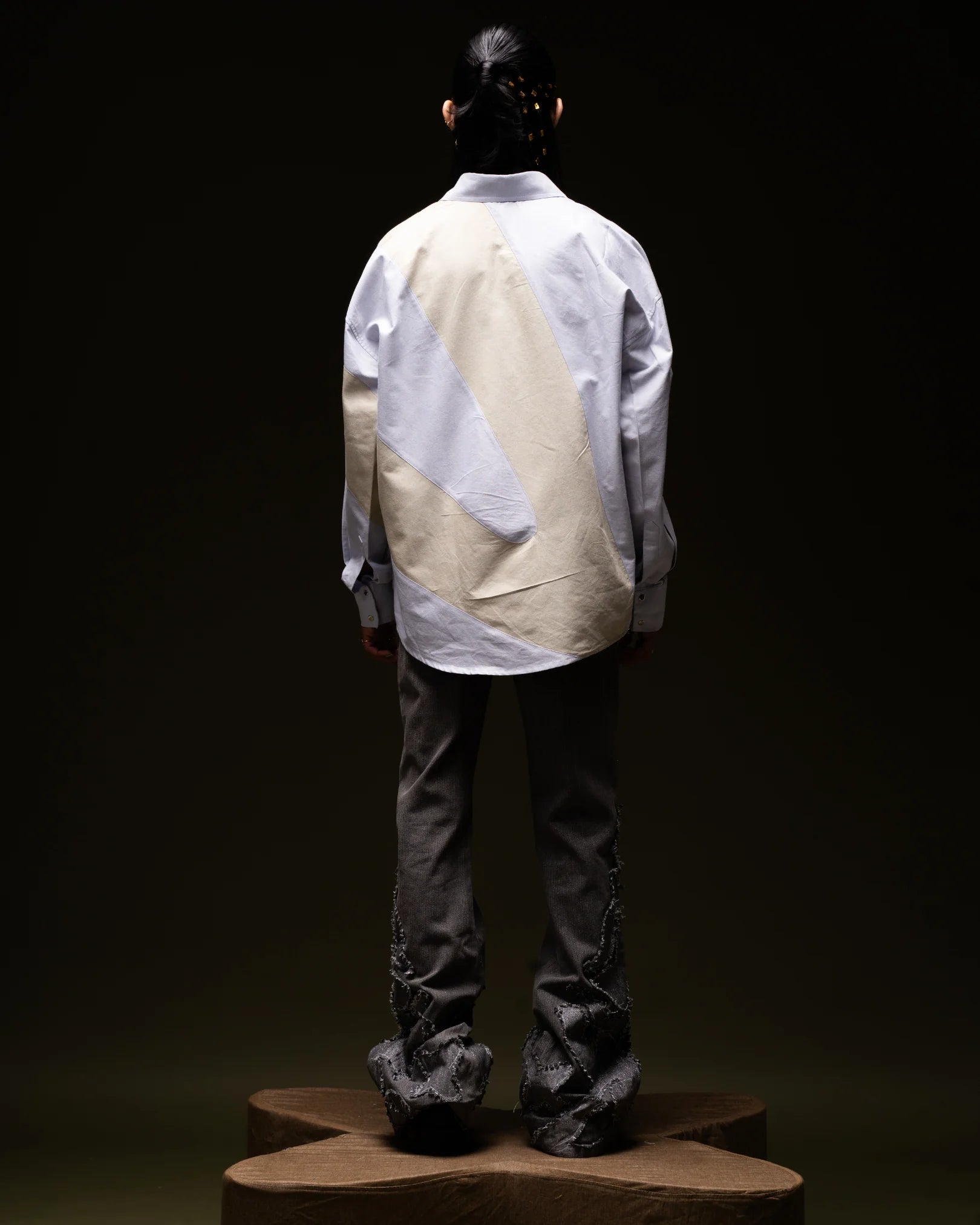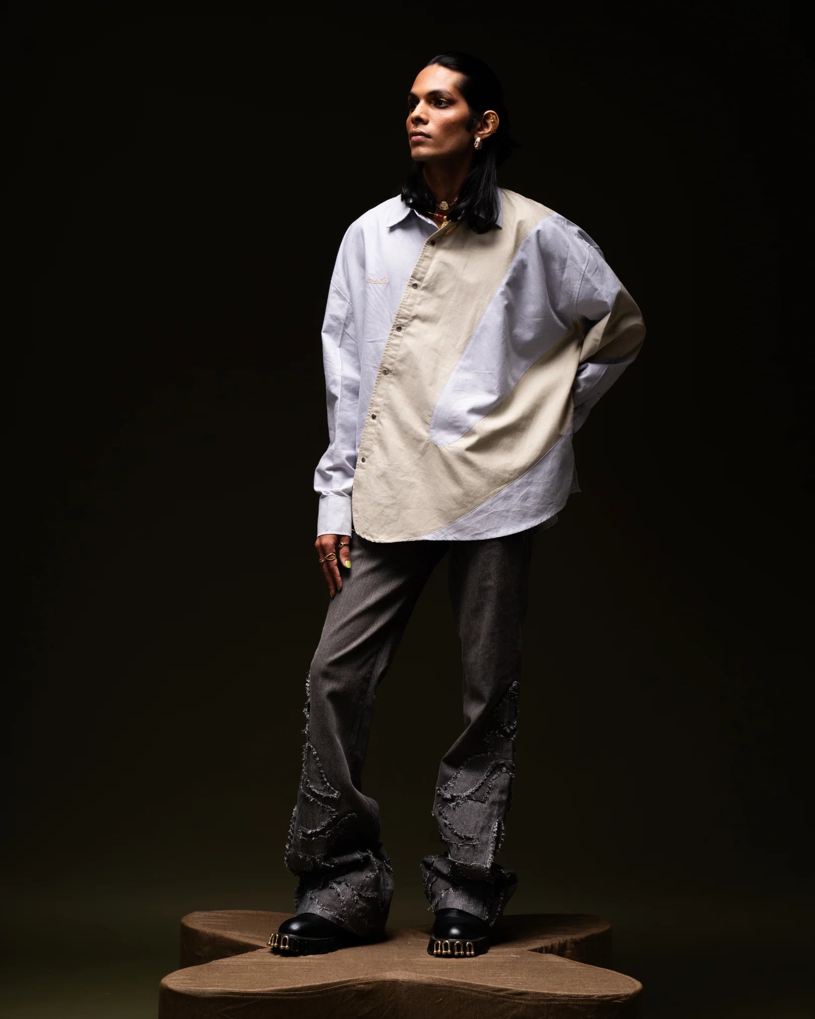 The Shuttle OG is an oversized, two-toned blue-grey shirt with a unique shuttle-shaped cutout and patchwork design. Featuring silver snap buttons for closure, it boasts an embroidered ERODE logo, a crisp collar, and a distinct shuttle-shaped buttoned placket. The shirt’s full, oversized sleeves with snap closures complete its bold, contemporary look.