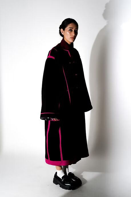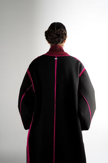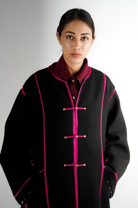 A pure handwoven sheep wool , embodying a seamless union of heritage craftsmanship and contemporary elegance. This luxurious piece is a distinguished addition to any wardrobe, offering a rich interplay of texture, structure, and embellishment.