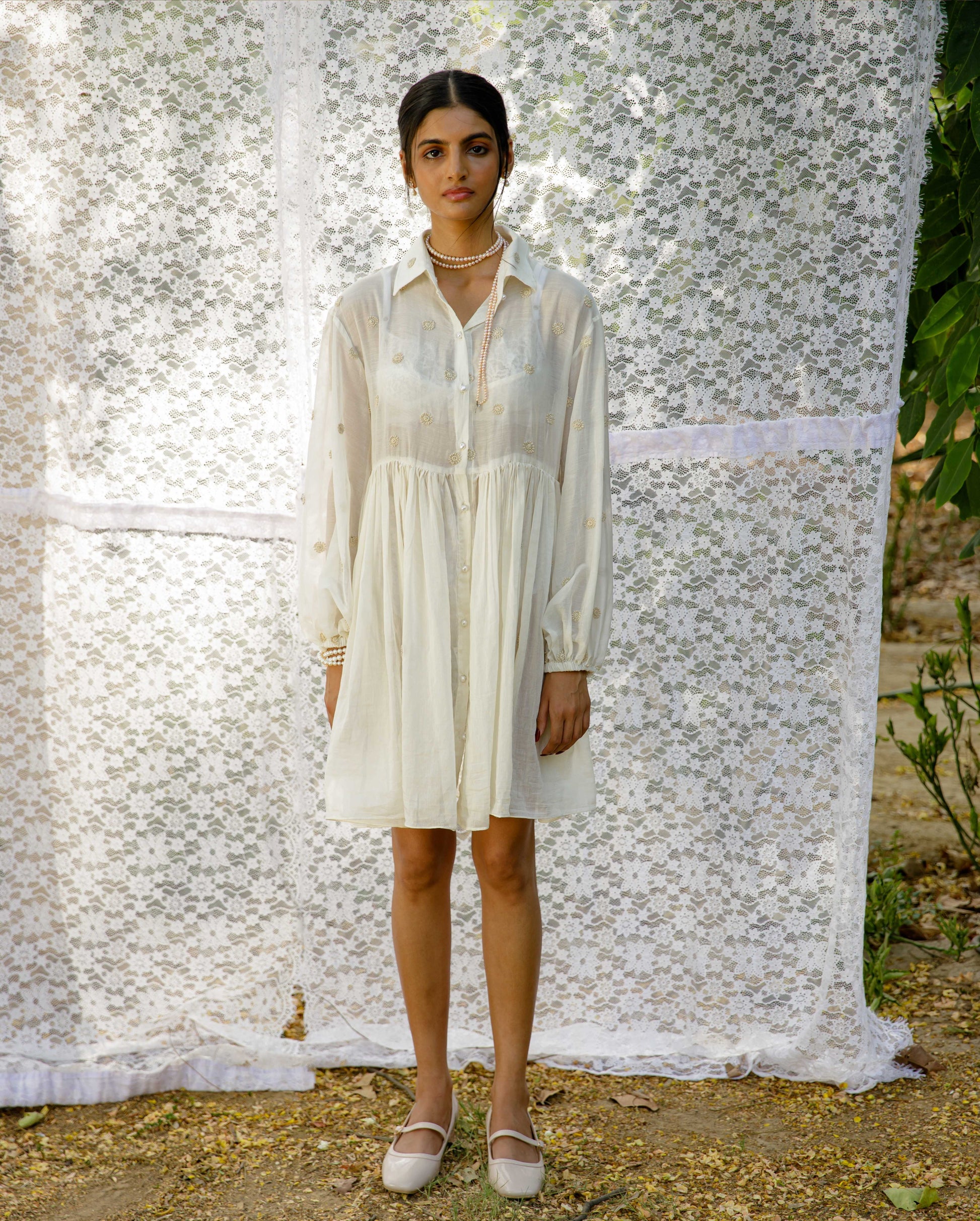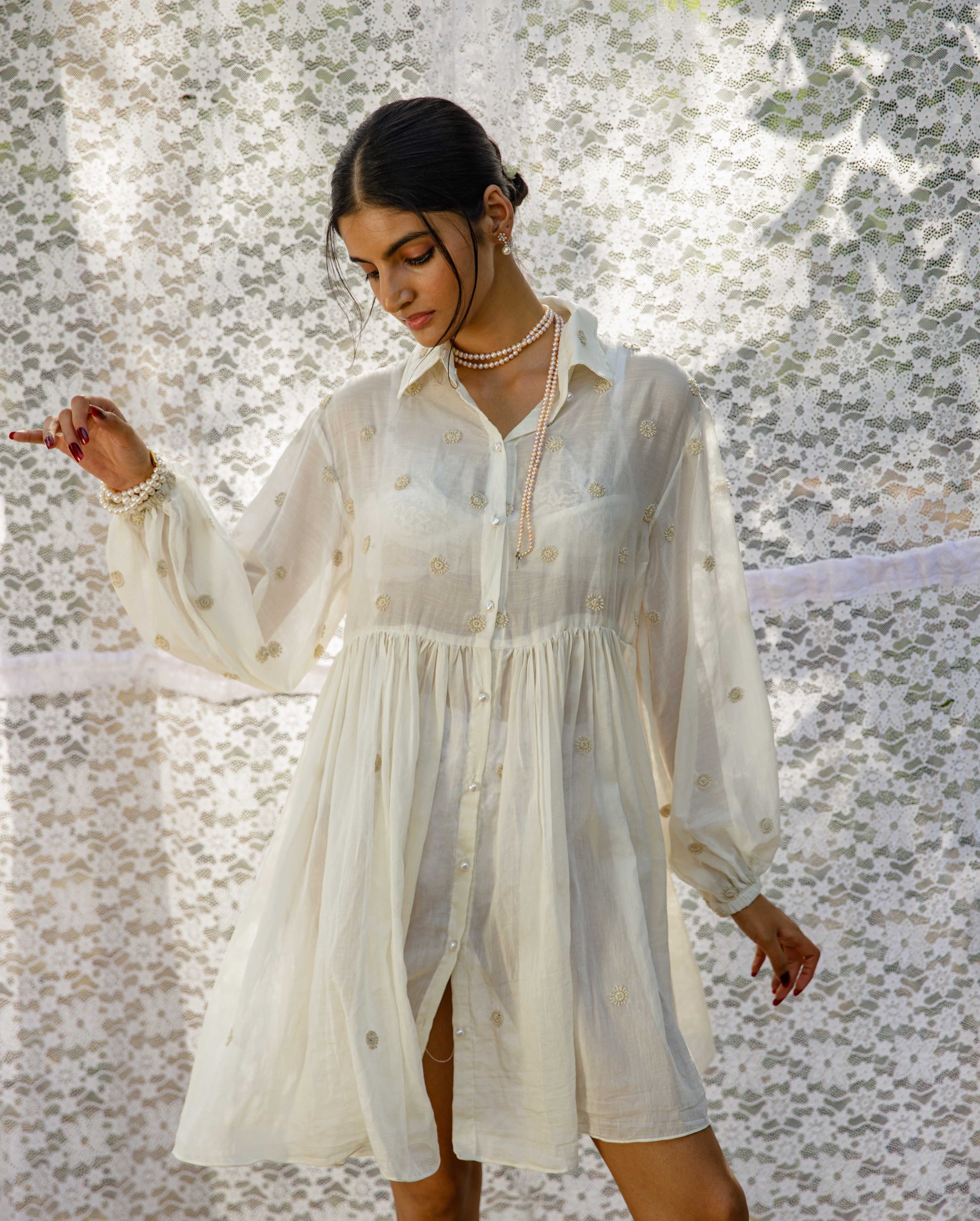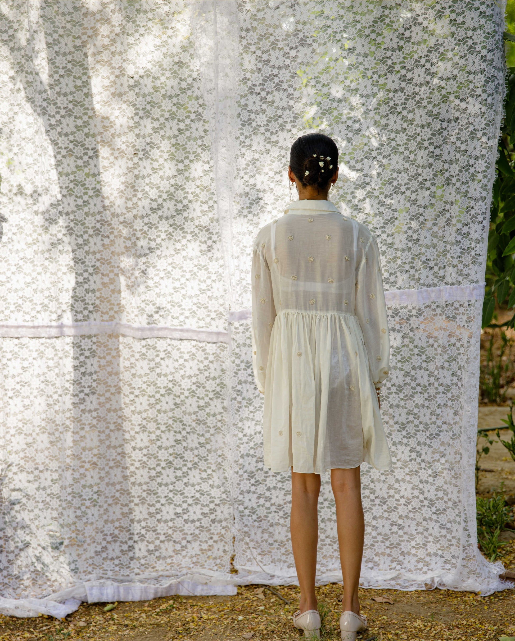 The sonder dress is for watching leaves fall off the tree. A white feminine translucent dress exudes a soft, ethereal quality, perfect for a relaxed, breezy look. The fabric cotton mul, flows gently over the body, offering a subtle sheer effect that plays with light. The dress has a loose, flowing silhouette. It features fine Chikankari embroidery, adding a touch of romance and elegance. Ideal for a serene summer day or a peaceful evening, it embodies lightness and ease.