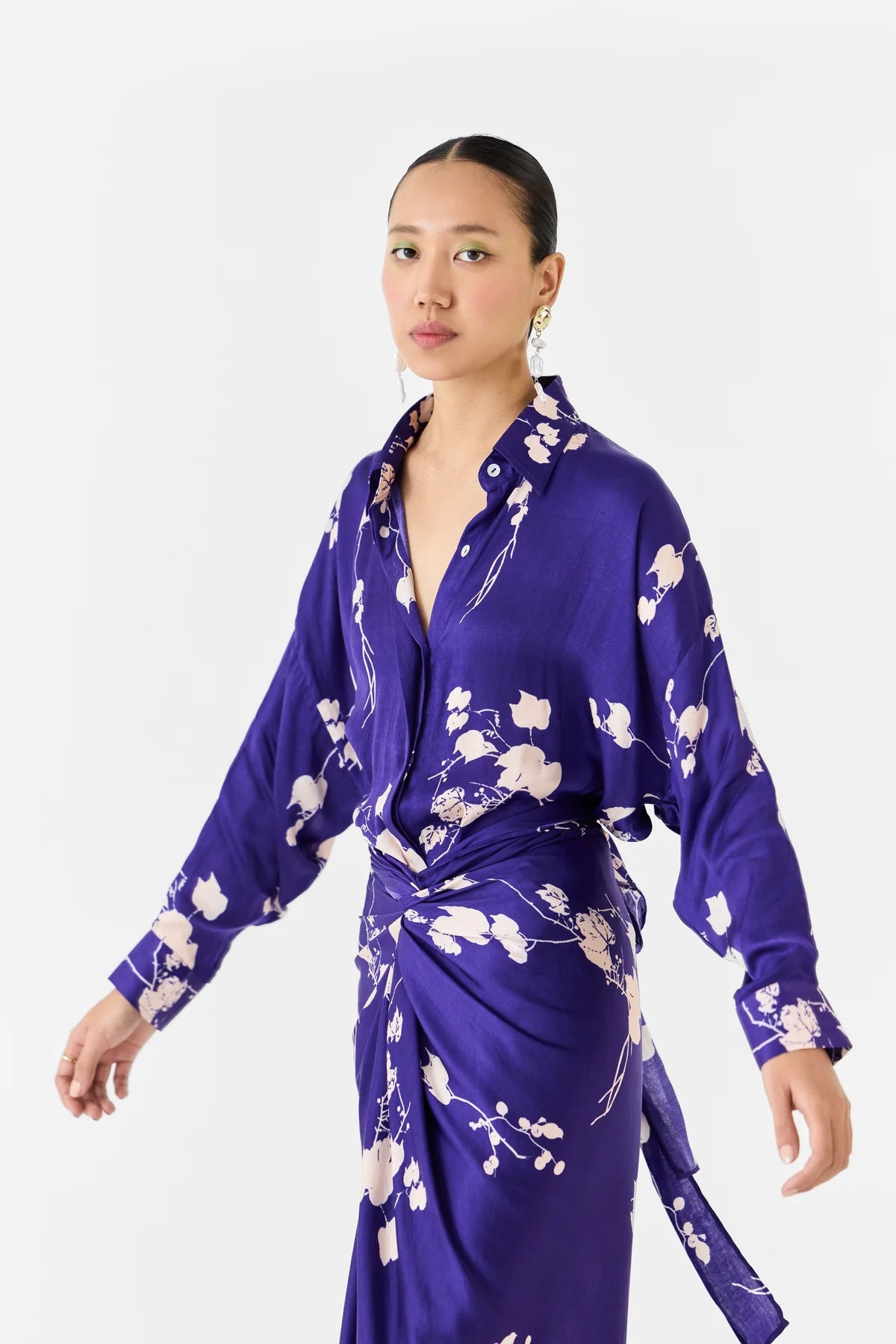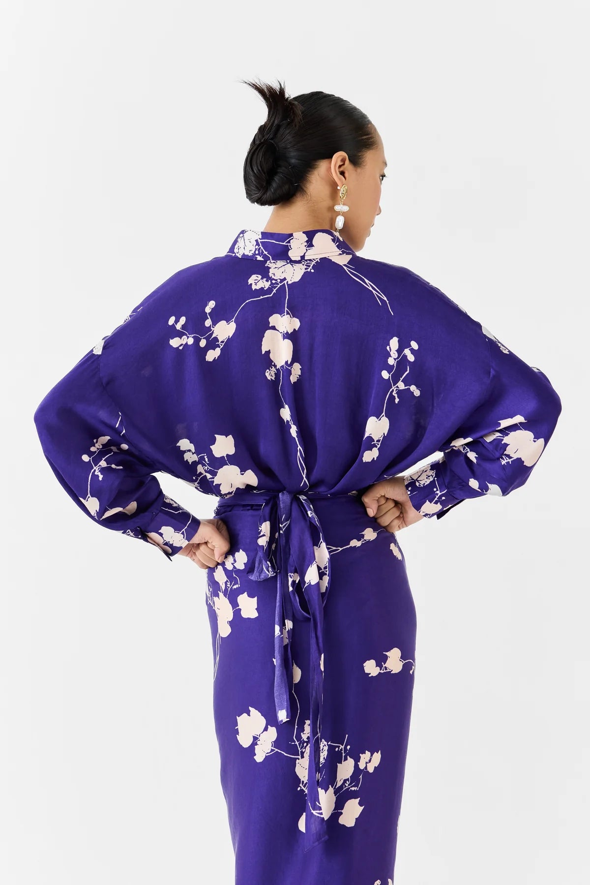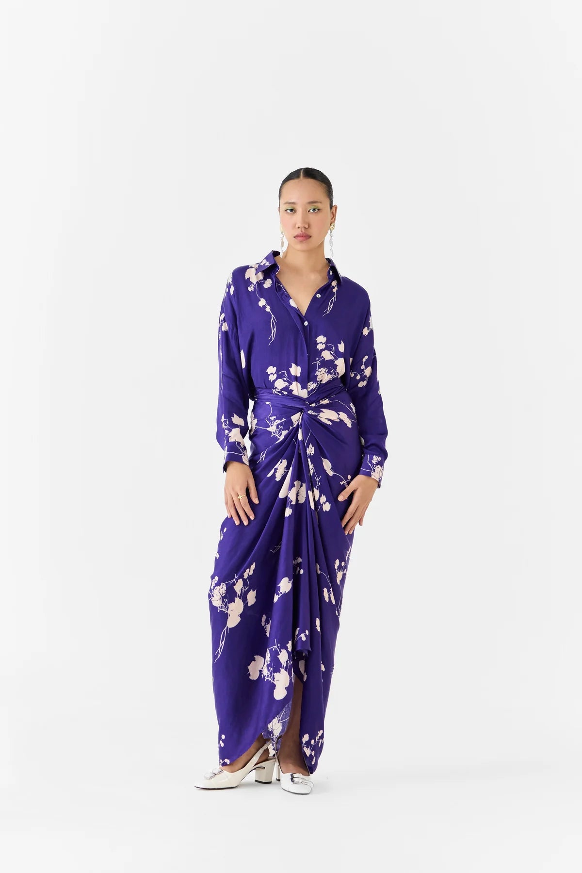 The Sakura Shirt Draped dress crafted from our stunning Vegan Silk fabrication, trans-seasonal, is a statement piece. The piece, made in our original digitally printed sakura print in cupro, is a one single dress. With tie ups at the waist, this dress has a relaxed shirt on top and attached skirt at the bottom. Featuring a draped skirt, this piece can be tied with a knot and can be styled in different ways. Wear it with heels for an elegant look.