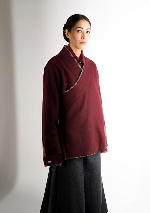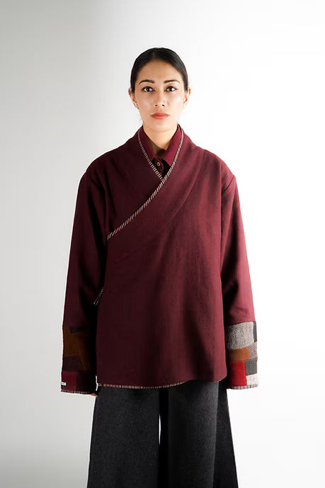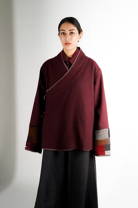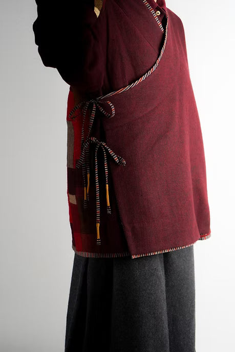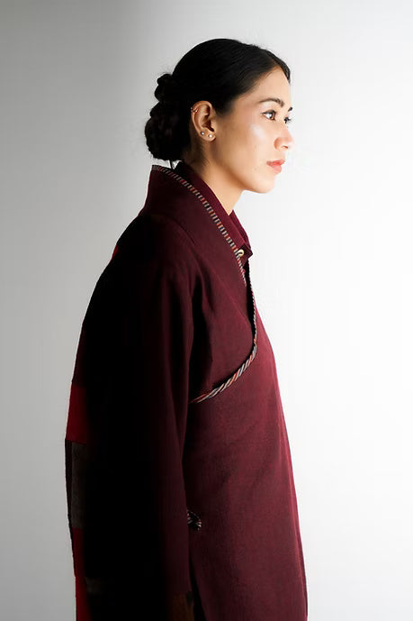 A contemporary take on the traditional Ladakhi Stutung, this jacket features a side tie-up closure, staying true to its heritage while ensuring an adjustable fit. The back is adorned with an upcycled fabric patch, adding a unique contrast and reinforcing our commitment to sustainability and textile revival. Crafted from Nambu wool from Ladakh, blended with regionally sourced cottons, this piece balances structure and ease, embodying 2112 Saldon’s signature fusion of tradition and modernity.