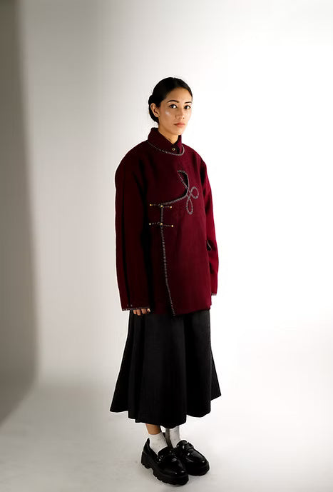 A pure handspun and handwoven sheep wool , embodying a seamless union of heritage craftsmanship and contemporary elegance. This luxurious piece is a distinguished addition to any wardrobe, offering a rich interplay of texture, structure, and embellishment.