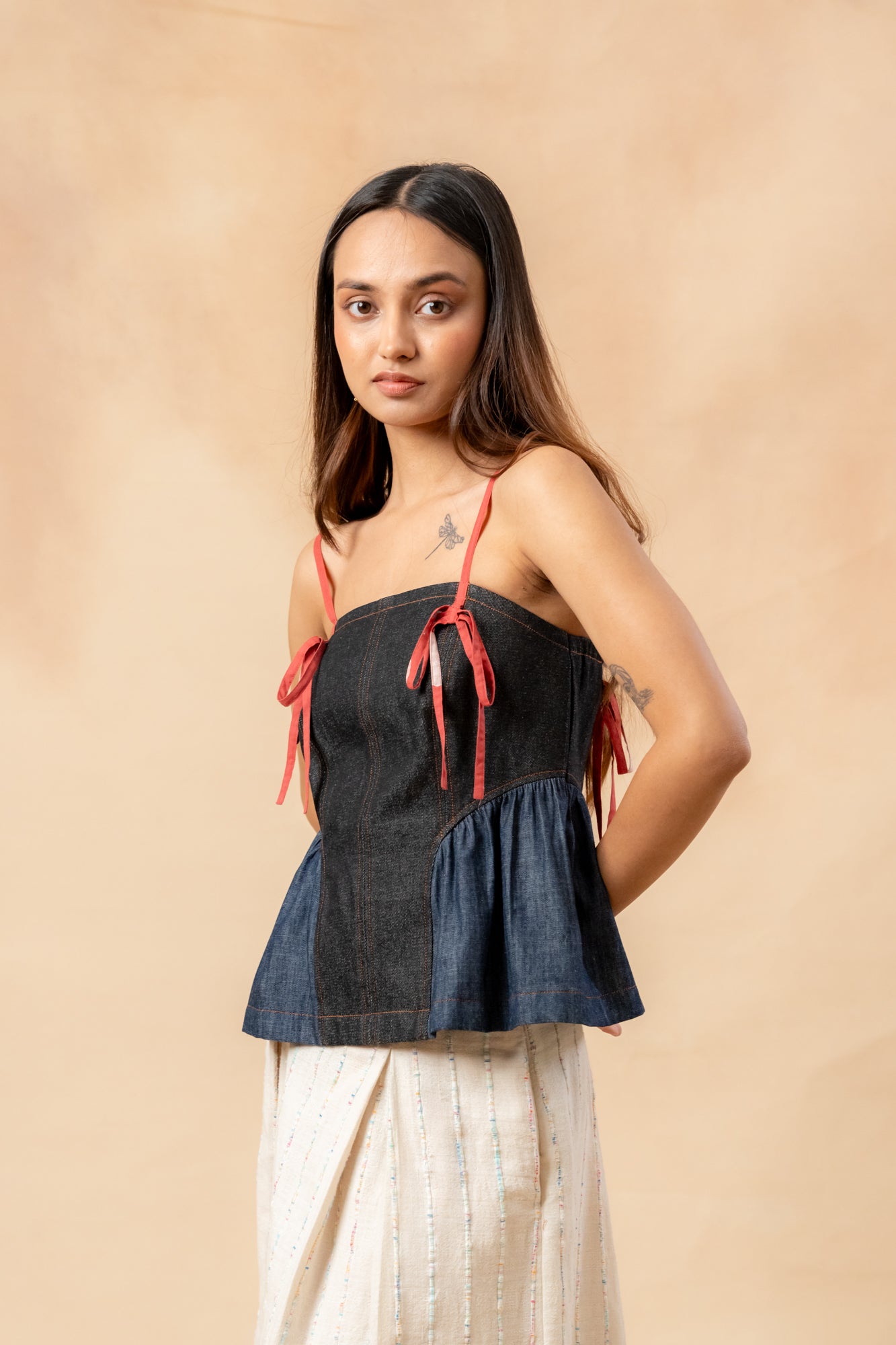 Description: Fitted bow top with adjustable contrast straps and side peplum