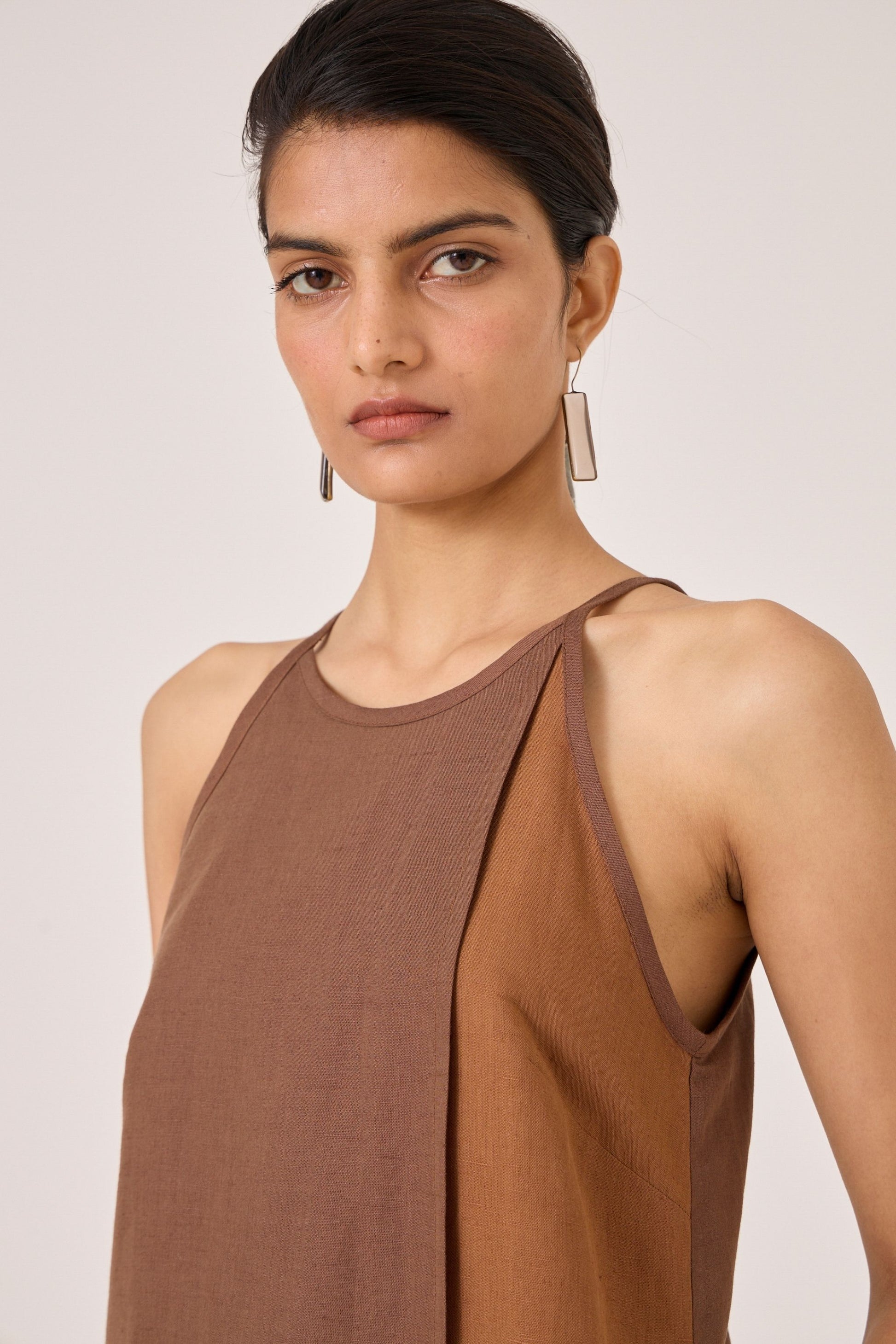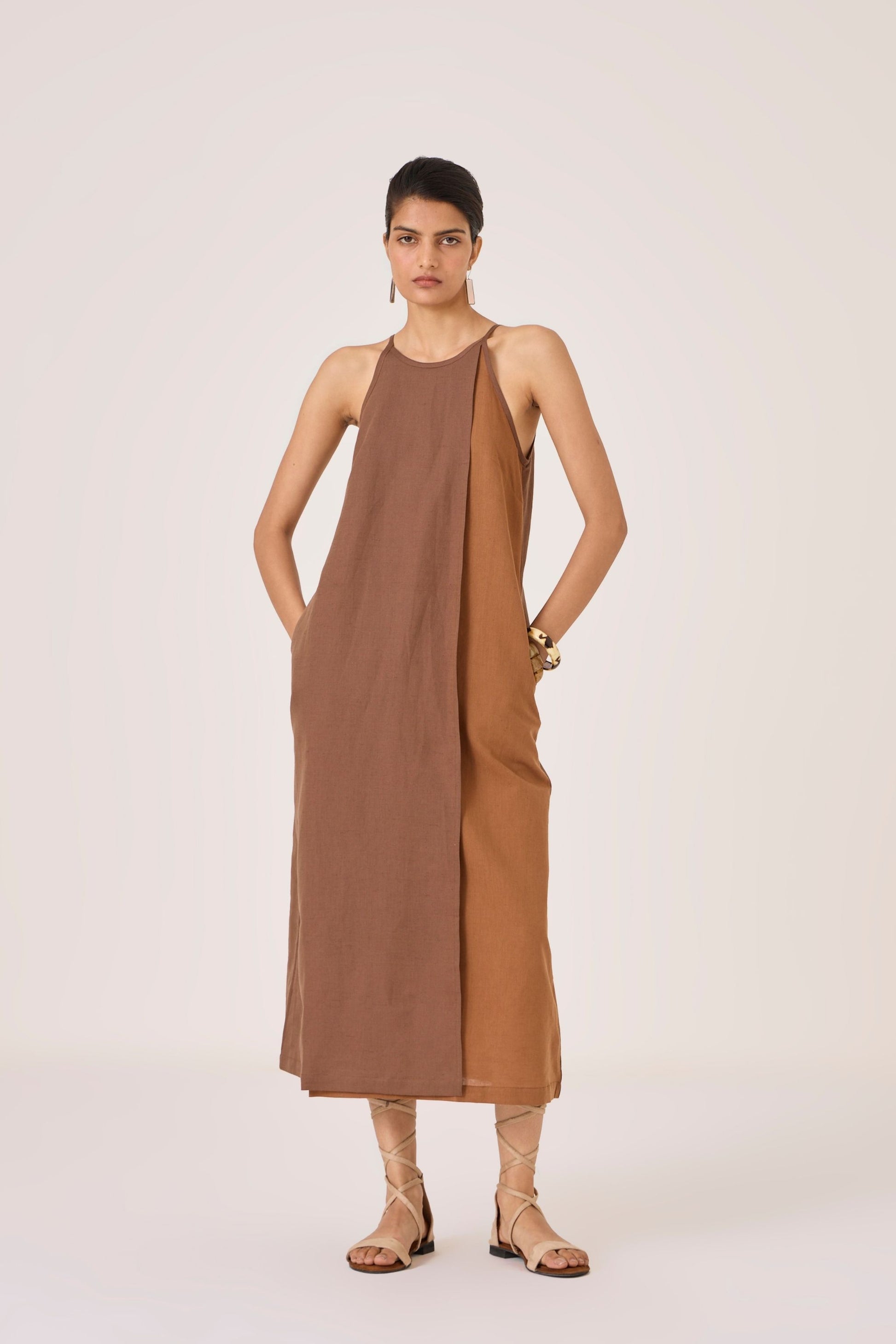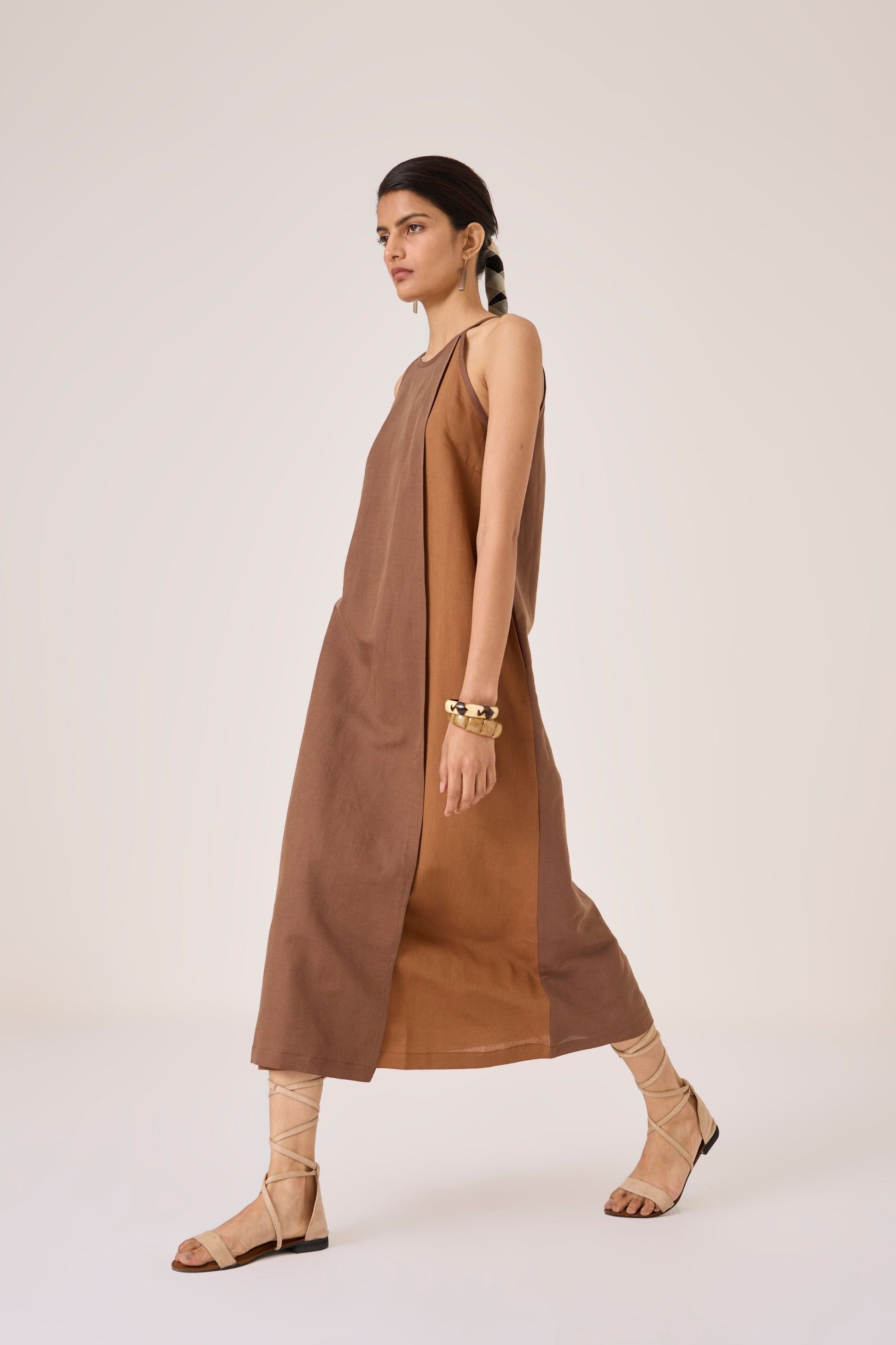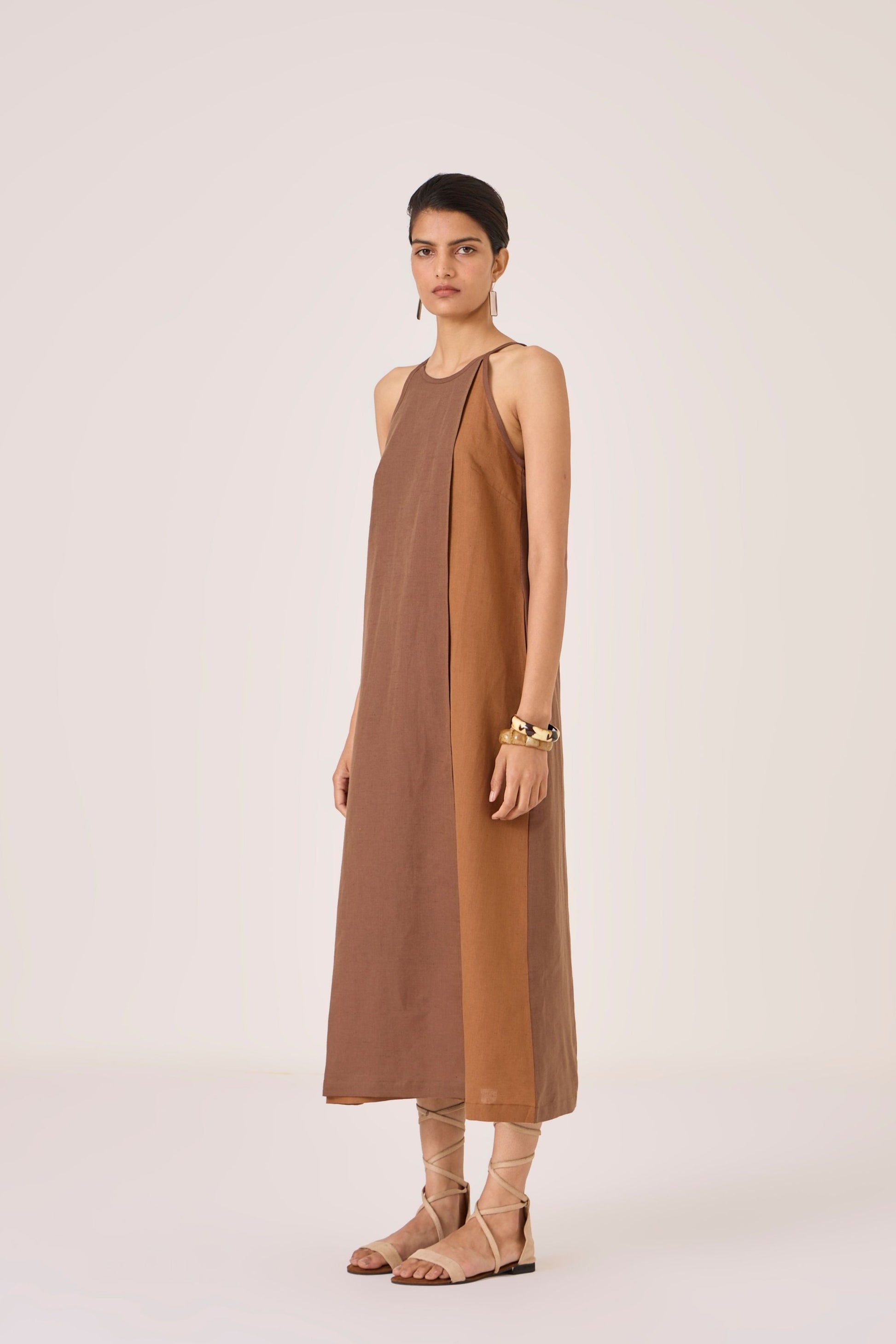 Incut sleeveless dress with front overlap panel . Colour block detail. Rouleau button closure at the back. Inseam pockets. Lined.