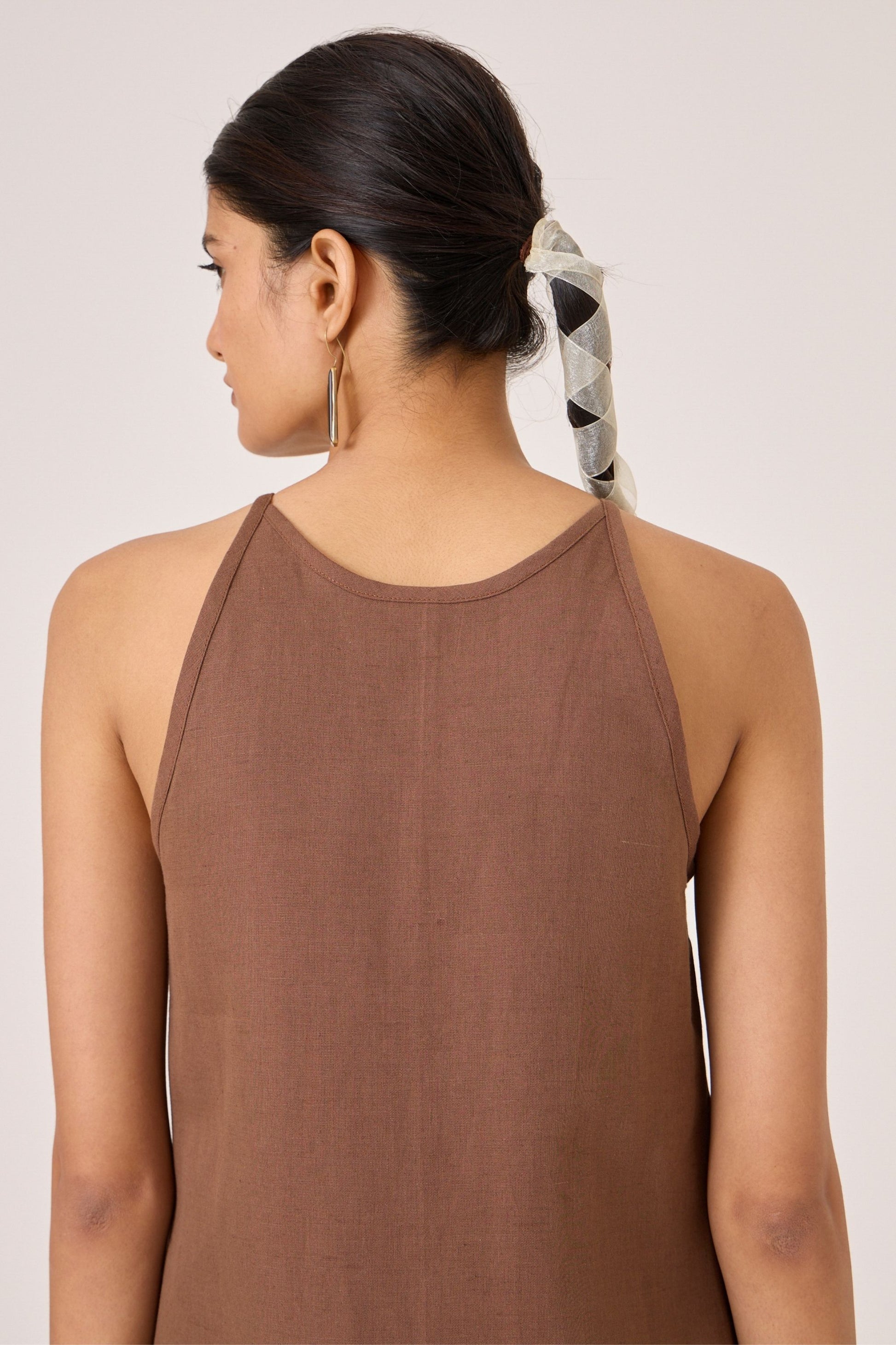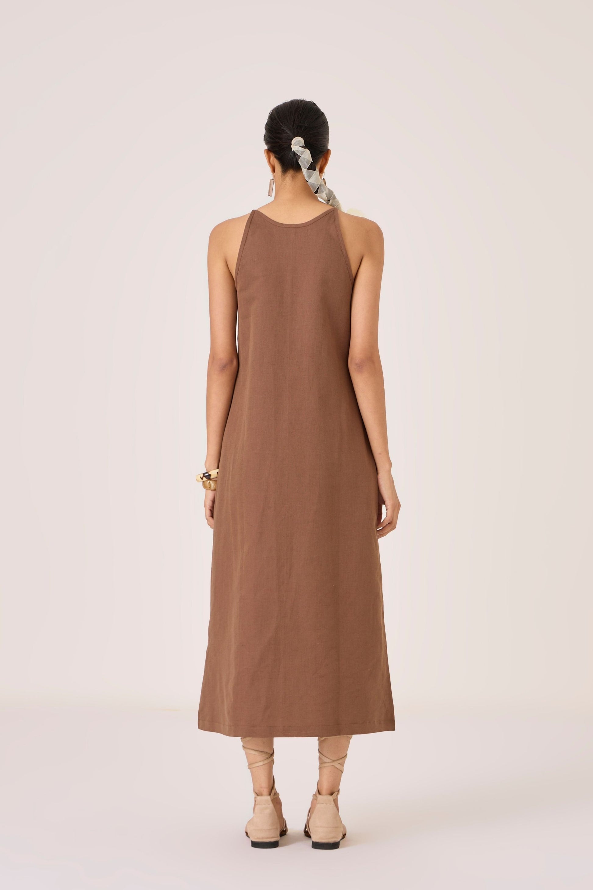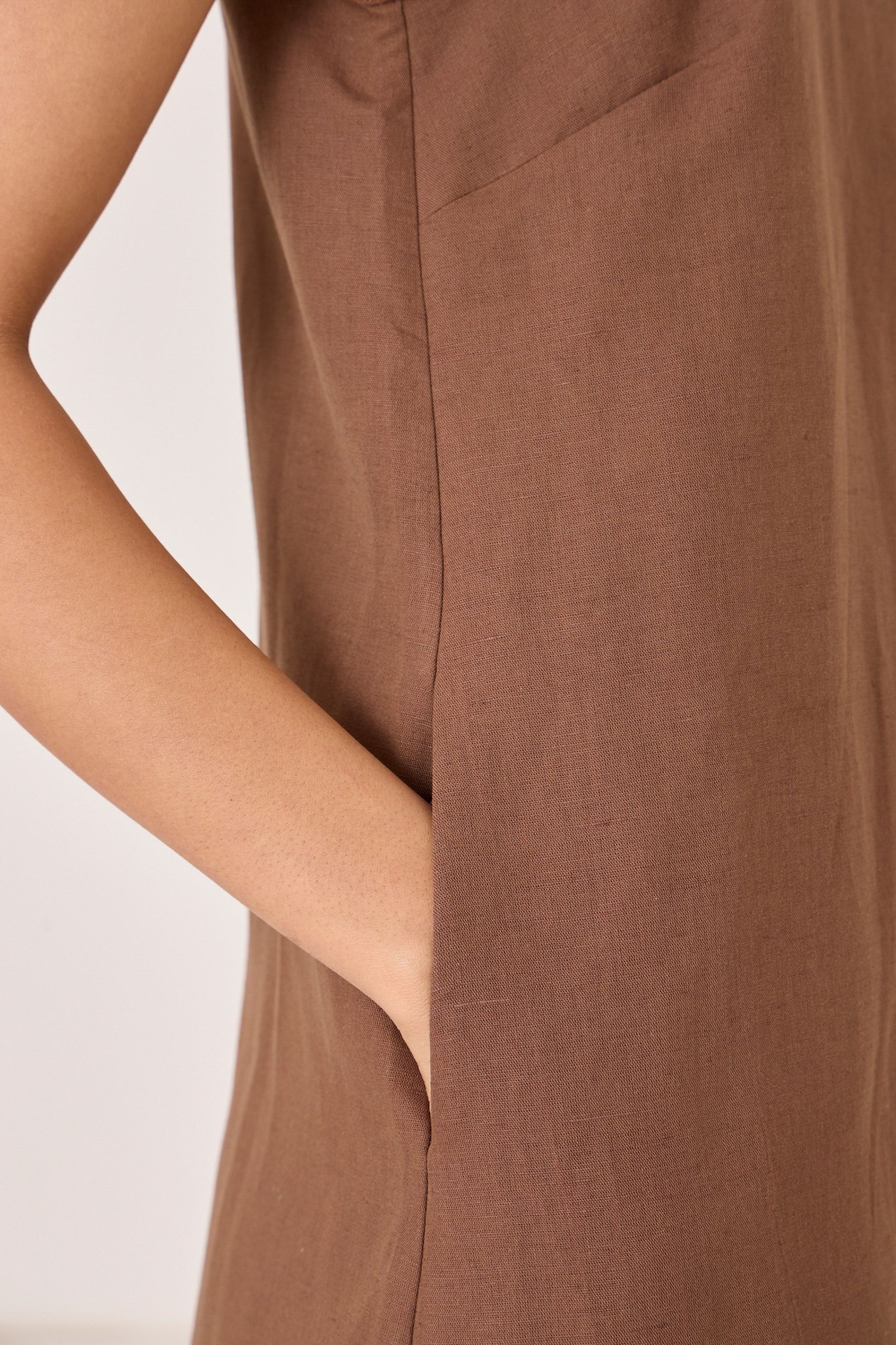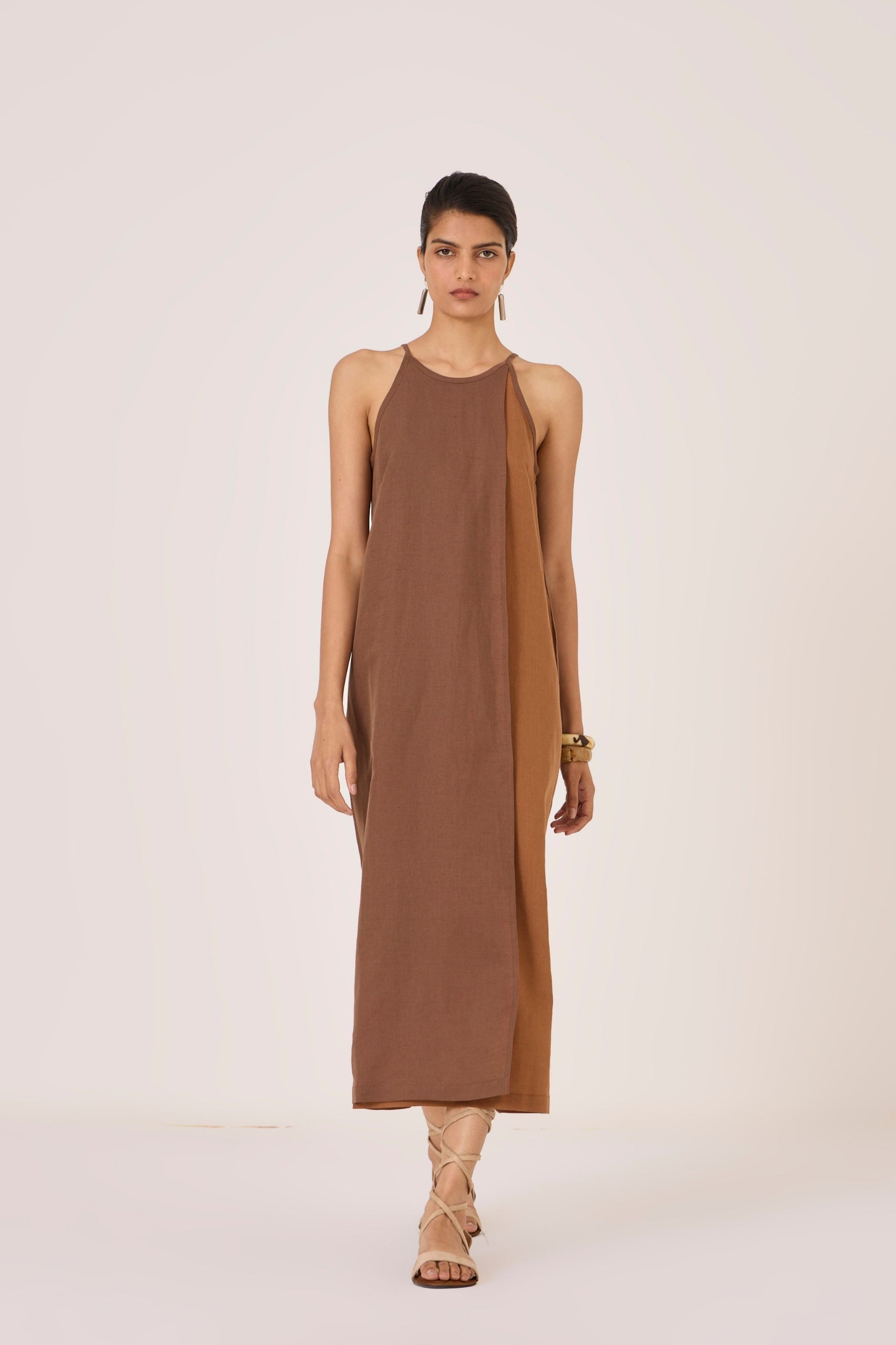 Incut sleeveless dress with front overlap panel . Colour block detail. Rouleau button closure at the back. Inseam pockets. Lined.