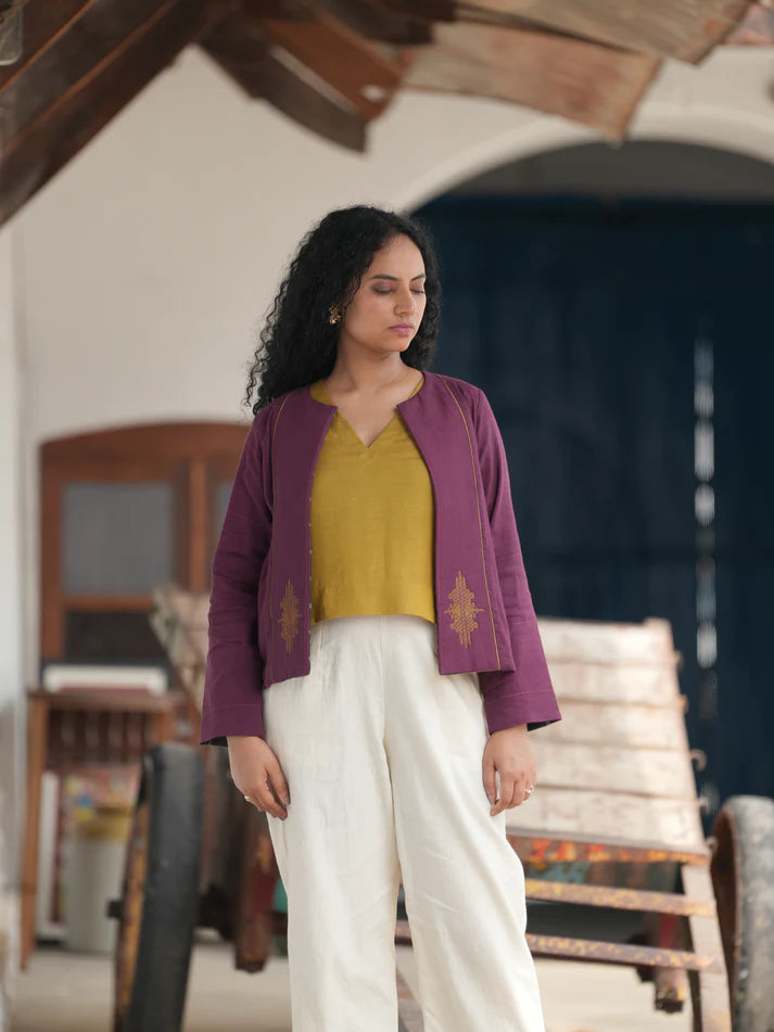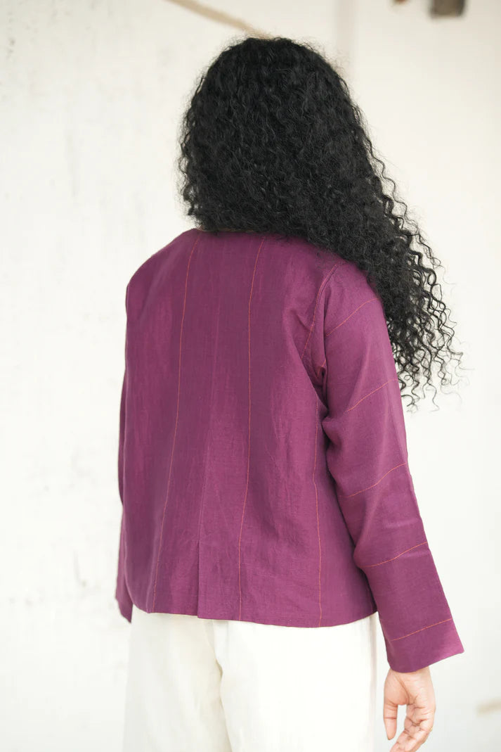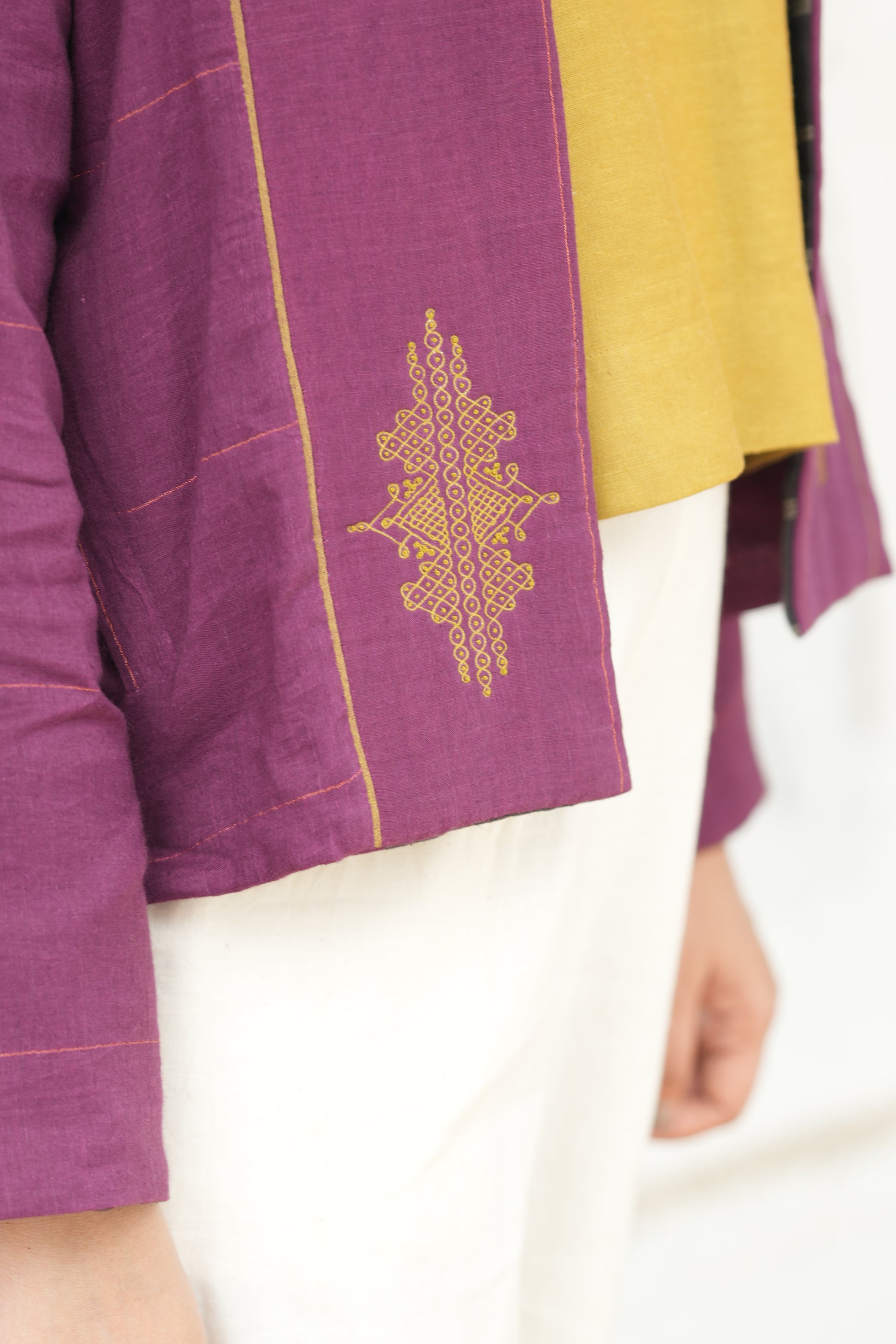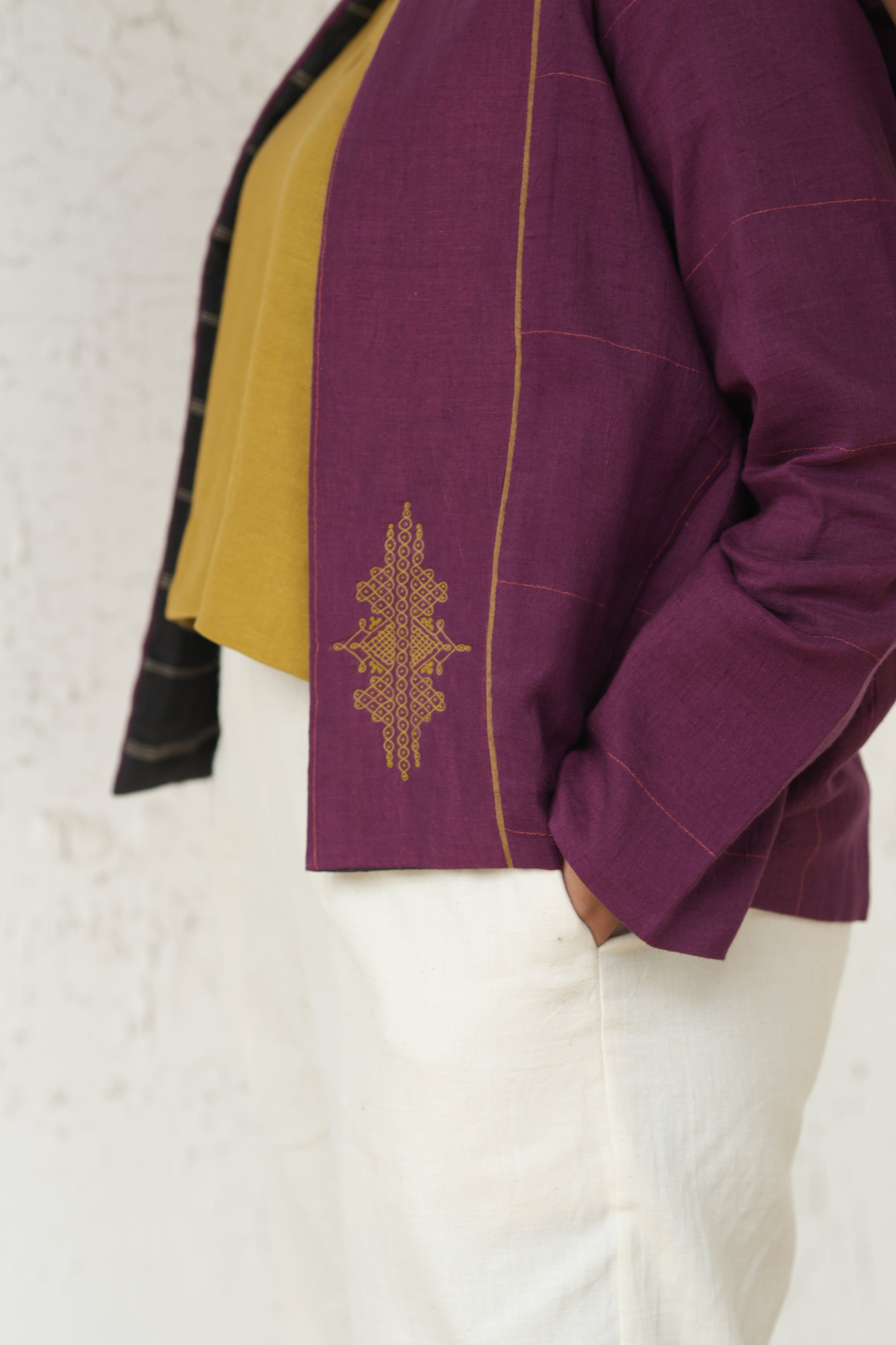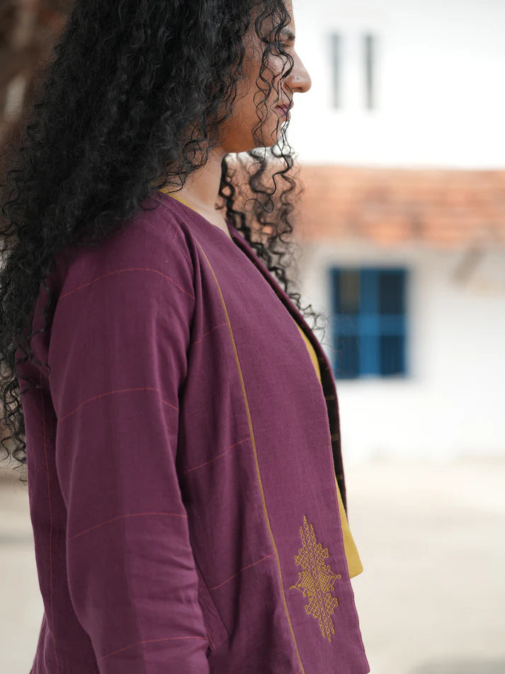 The sutra jacket designed in handloom cotton and linen, this jacket is lightweight yet structured, making it a versatile addition to any wardrobe. The open, collarless neckline lends a sleek, contemporary touch, while the puffed yoke adds soft volume for a refined silhouette. Thoughtfully placed embroidery on either side enhances its artisanal appeal, and the contrast lining offers a striking finish.