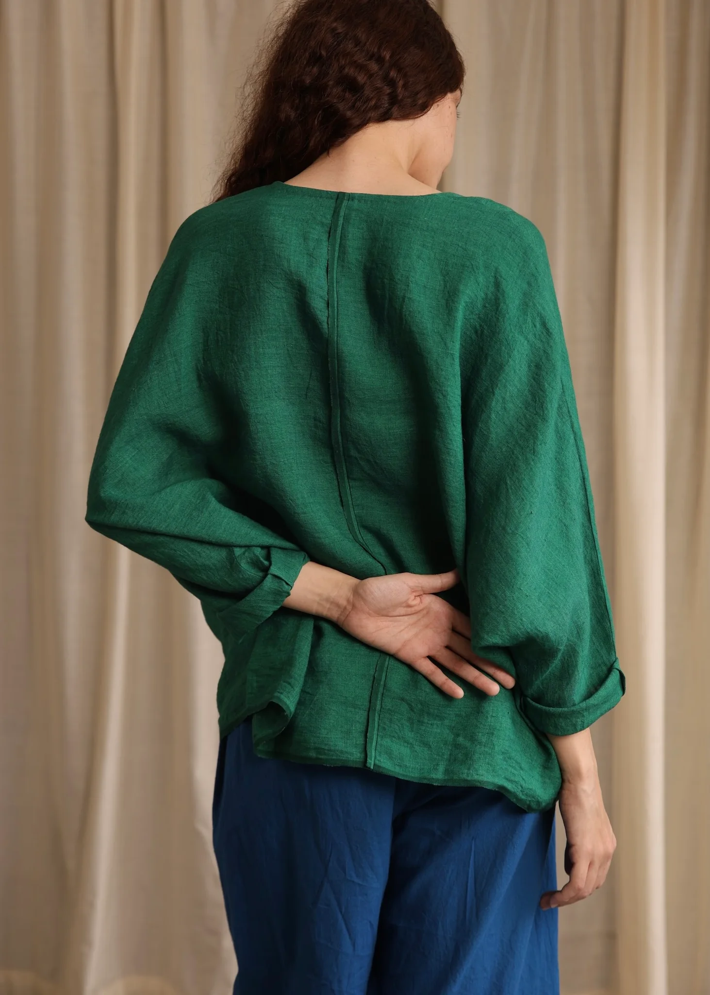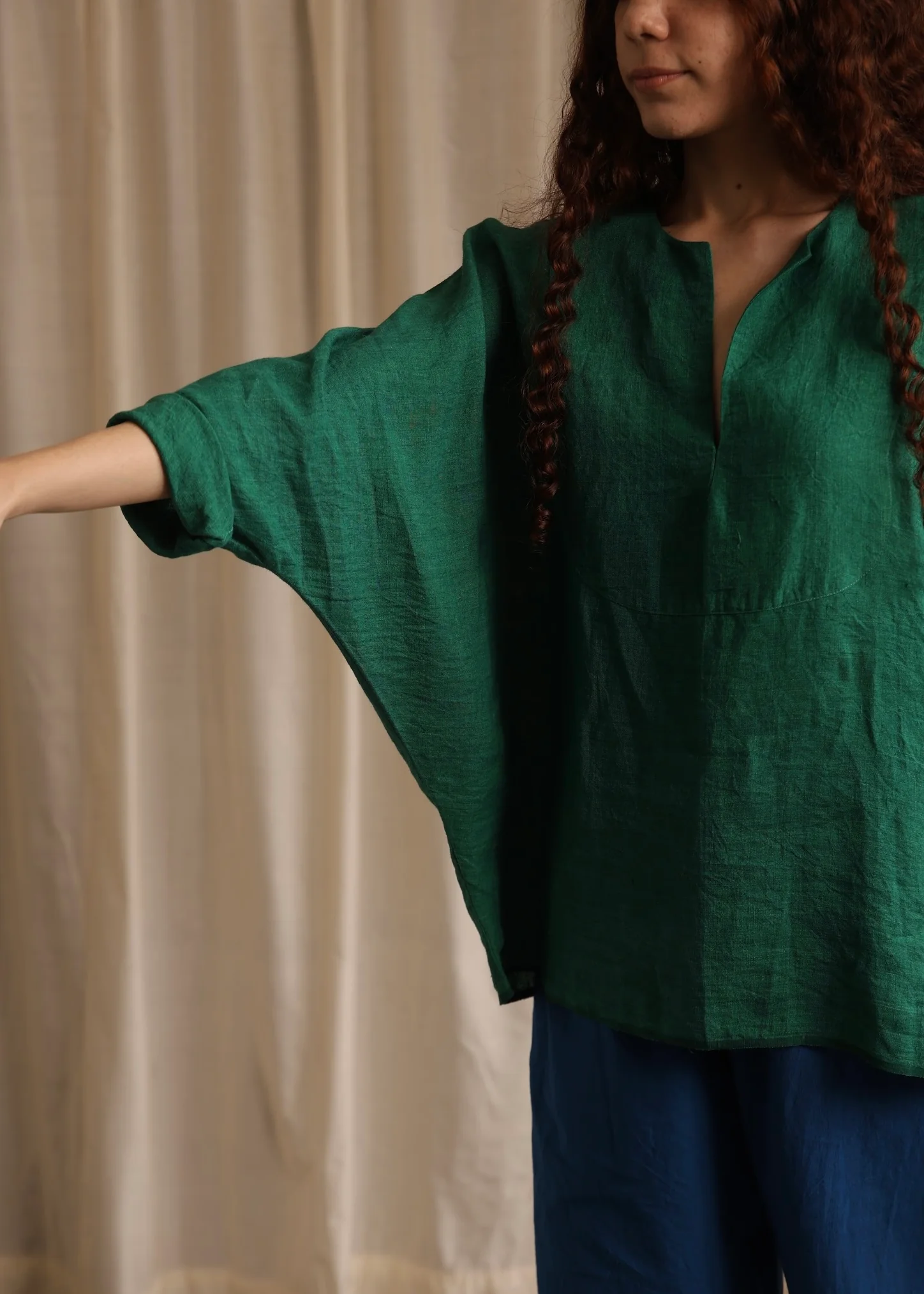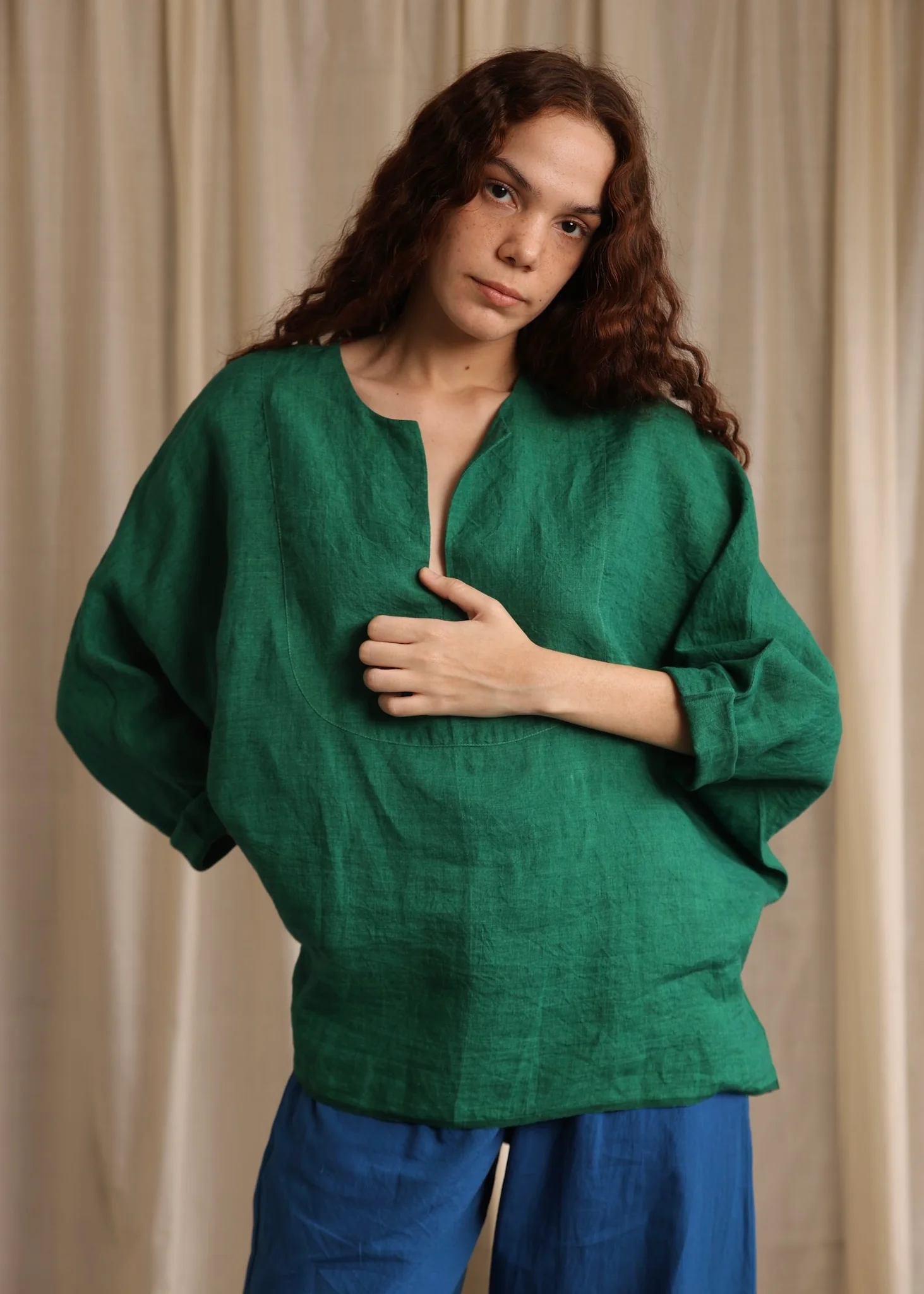 Sylvie is a vibrant green linen top featuring a deep neckline and loose long sleeves for a casual yet chic look that provides comfort and a refreshing pop of color for your summer wardrobe.