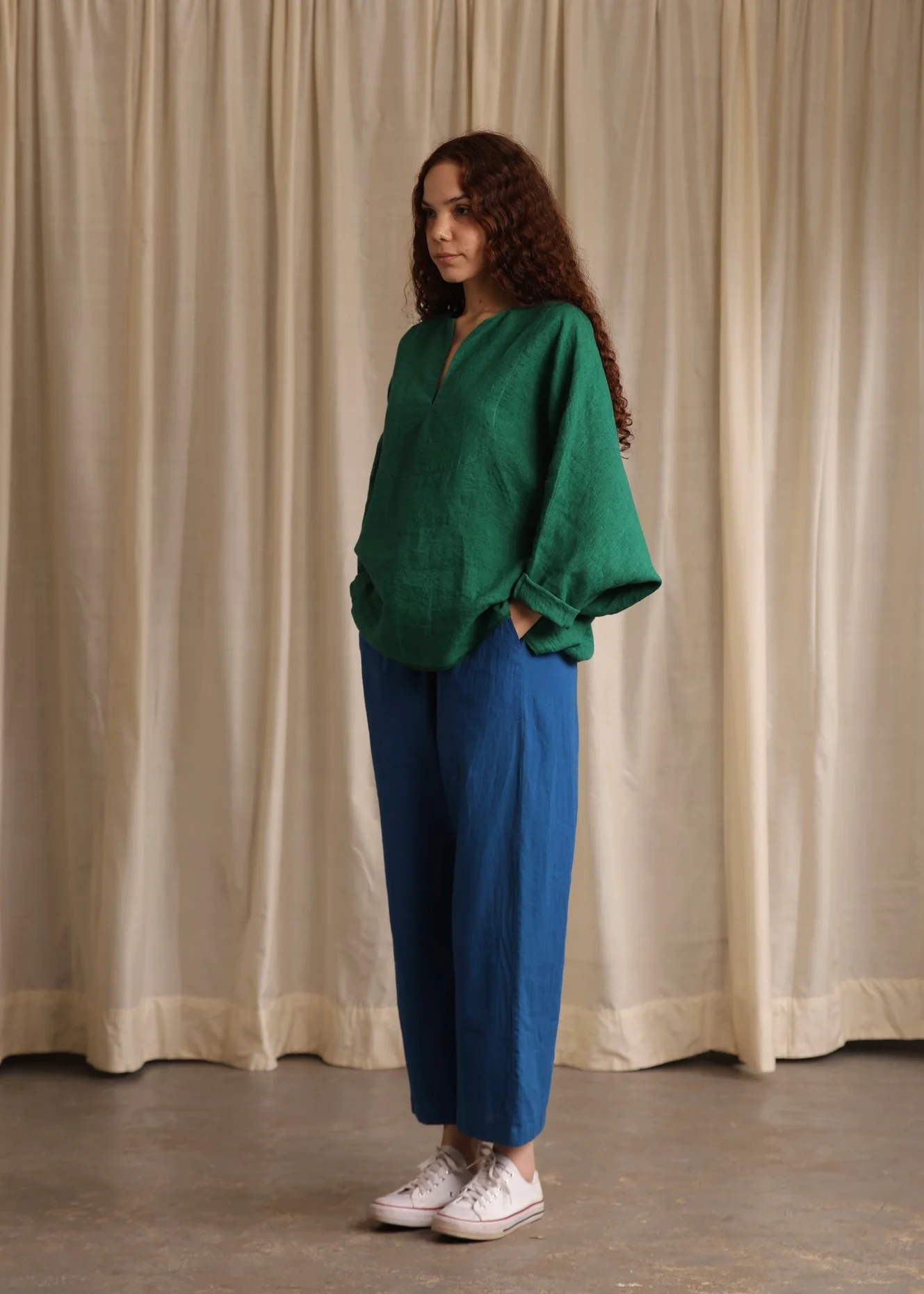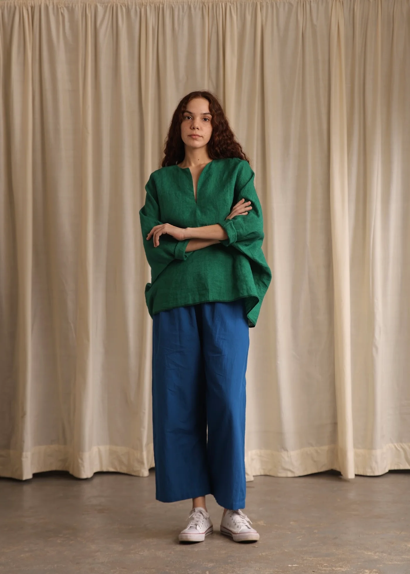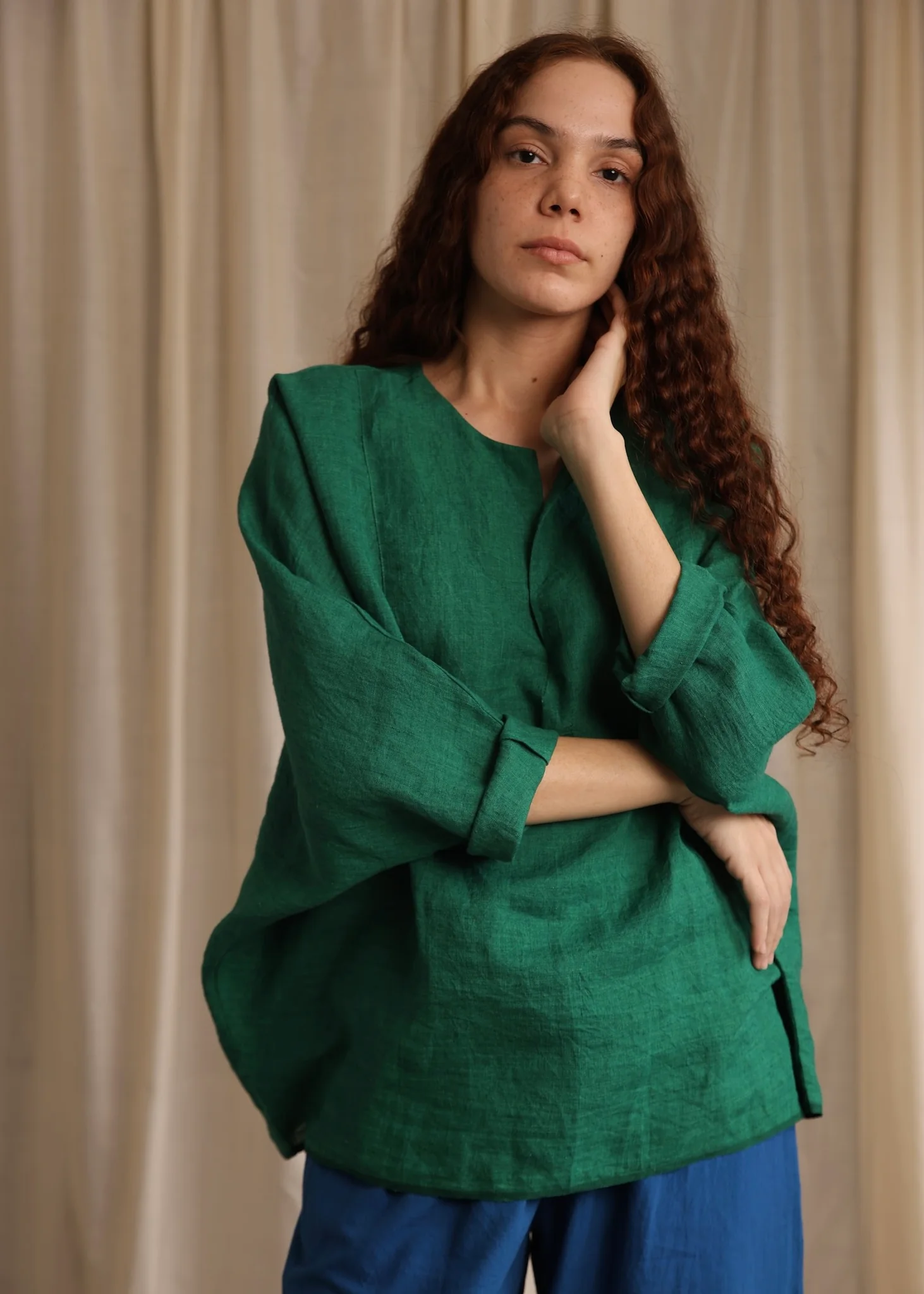Sylvie is a vibrant green linen top featuring a deep neckline and loose long sleeves for a casual yet chic look that provides comfort and a refreshing pop of color for your summer wardrobe.