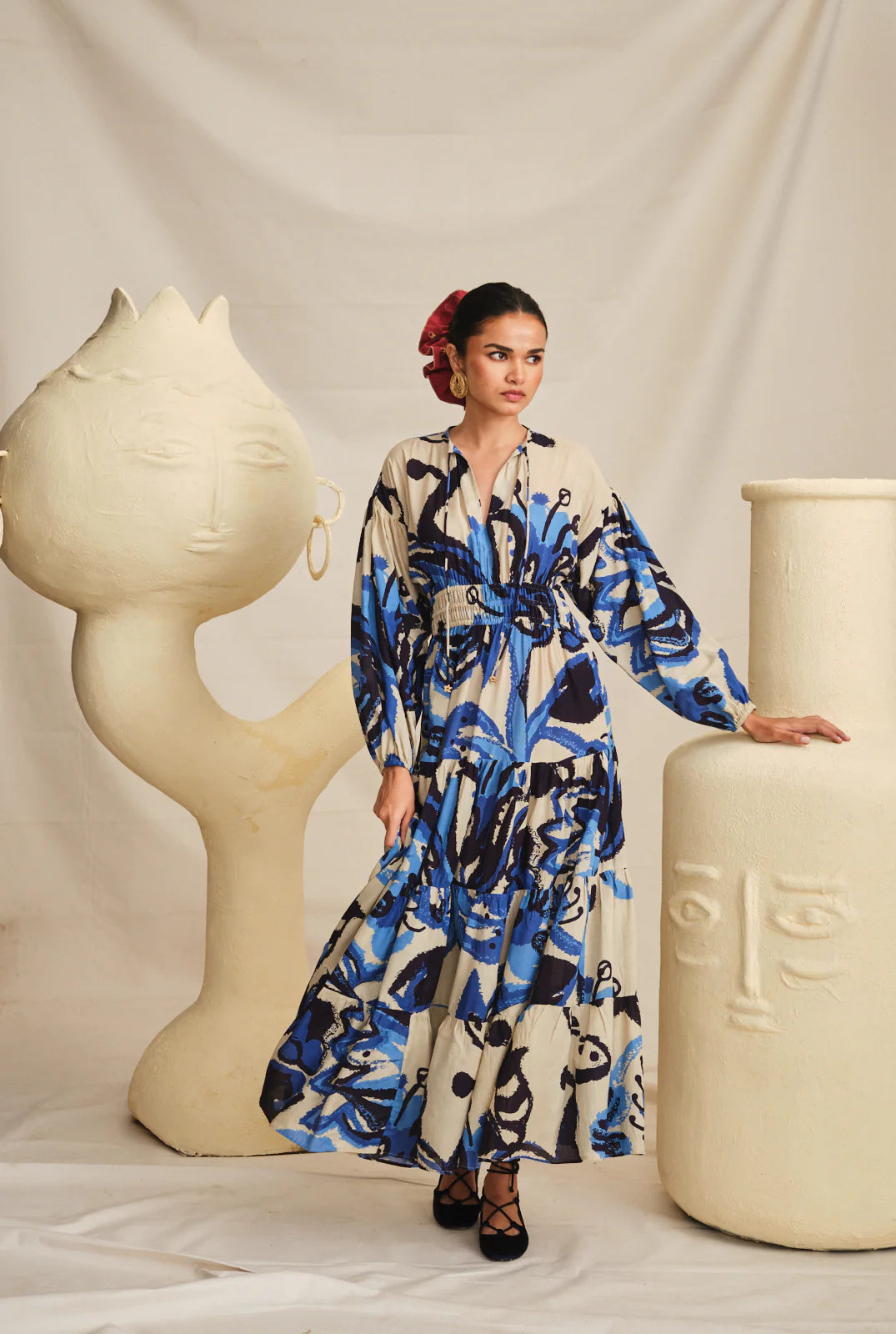 This fit and flare silhouette adds an instant touch of sophistication and confidence to your wardrobe. A flowy maxi dress crafted in painterly florals and meticulously hand-screen printed by our skillful artisans.