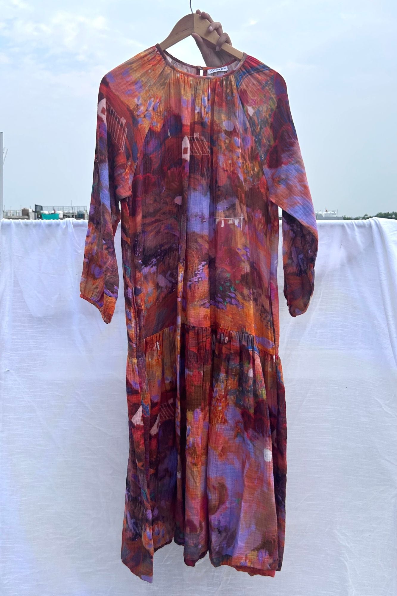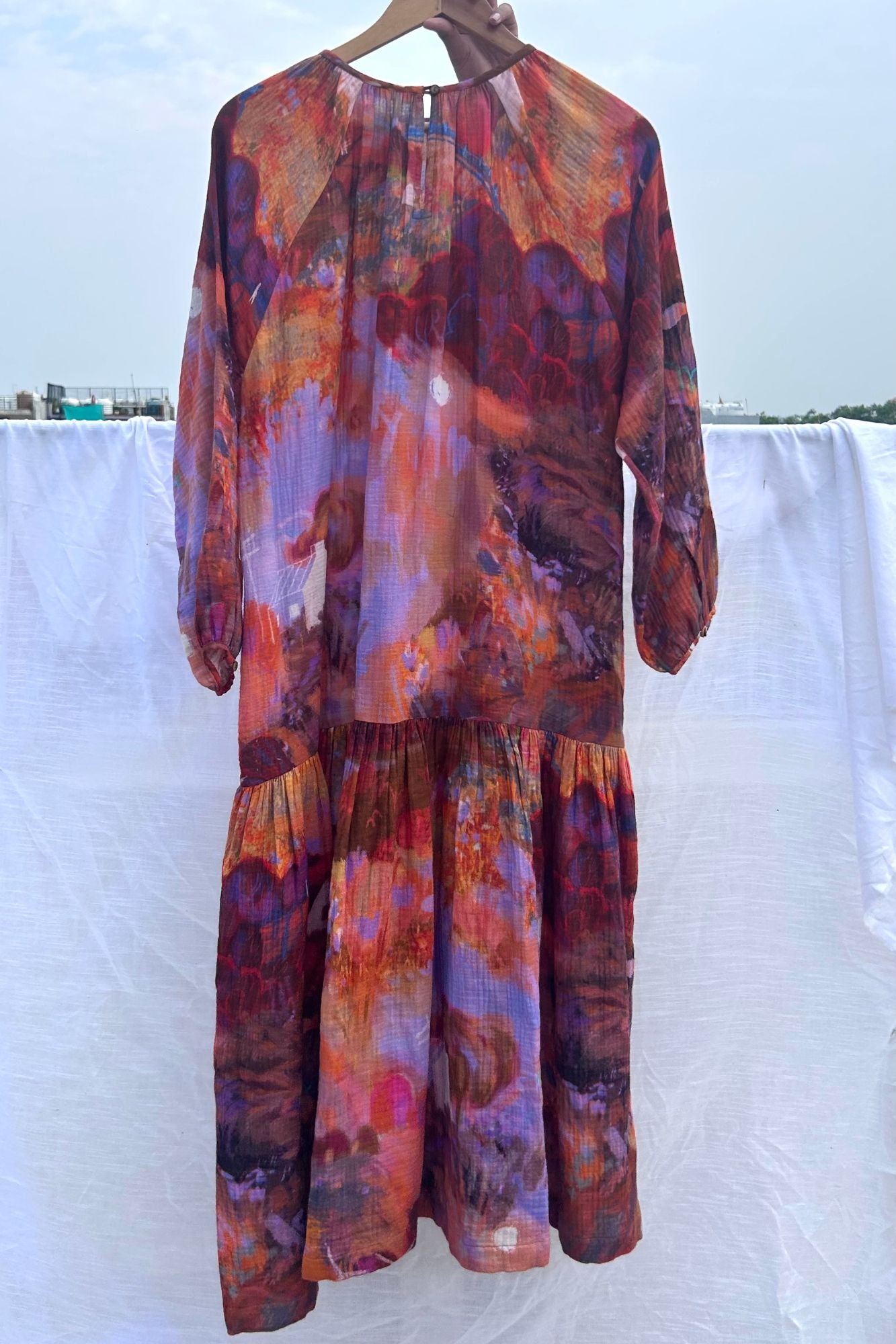 Description: Neck gathered, loose-fitted dress with hand-painted doodle print on organic cotton, dress comes with side pockets.