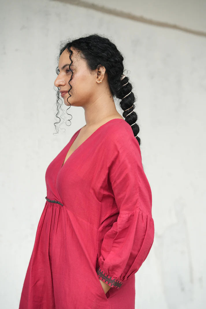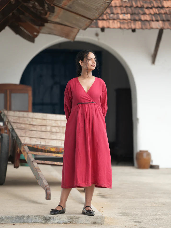 The Urmi Handloom Cotton and Linen Dress, designed for the modern woman who values both comfort and style. This dress features a beautifully overlapped V-cut yoke, accentuating the neckline with a flattering, sophisticated touch. The middle panel boasts contrast-edged gathers, adding a chic, textured detail that enhances the dress’s overall appeal.