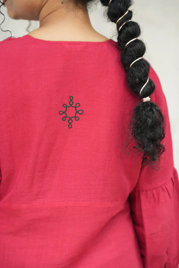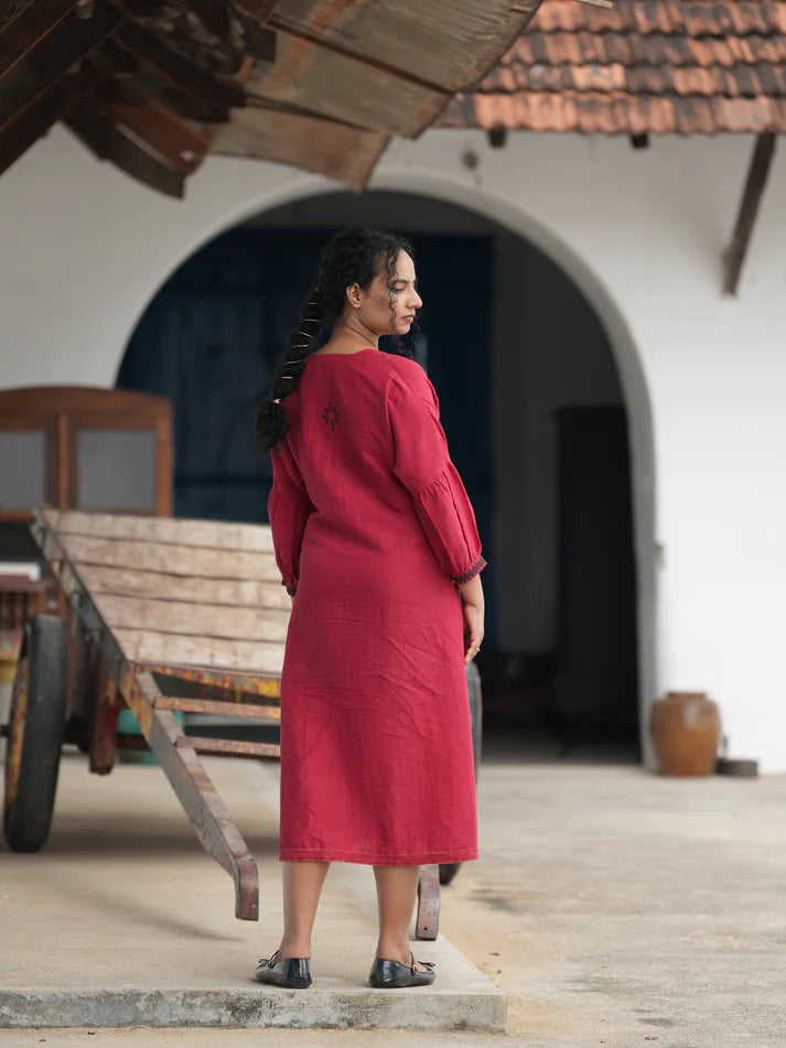 The dropped sleeves gracefully transition into puffed sleeves, creating a soft, voluminous look. Delicate embroidered motifs on the sleeves further elevate this dress, adding a unique and artisanal charm. Crafted from breathable handloom cotton and linen, this dress is perfect for those who appreciate natural fabrics and effortless elegance.
