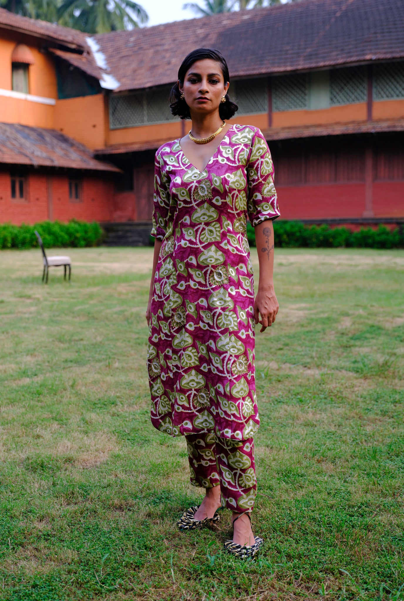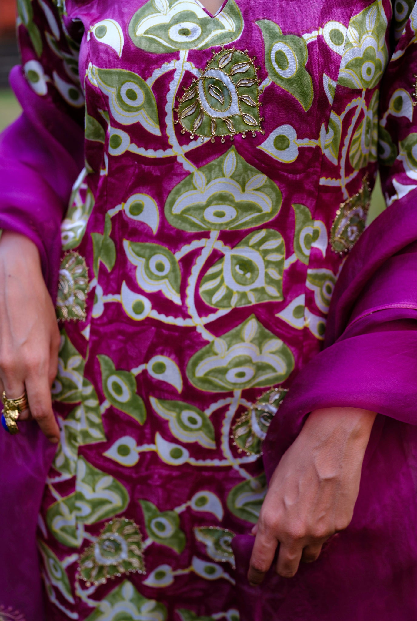 5.5 meters of Mashru silk sourced from Gujarat has been used for this piece. Hand-block printed in Jaipur. Hand embroidered and manufactured at our workshop in Pune, India. This product is crafted in Jaipur, India using the traditional artisan technique of hand-block printing, and is hand embroidered by our skilled artisans in Pune. Subtle variations in patterns are natural to this process.