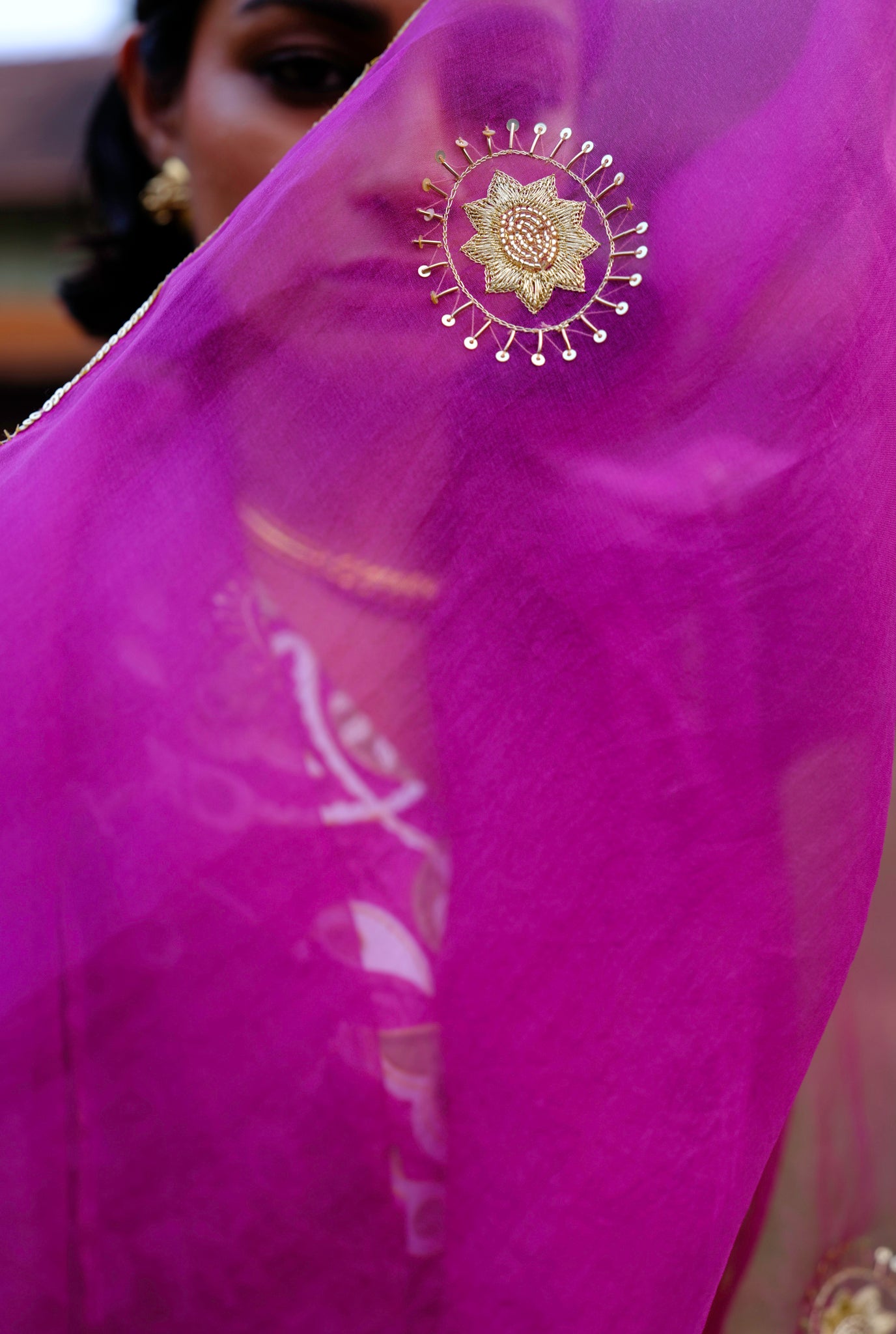 We love a classic, this kurta set returns in a new, vivid print. Crafted in lustrous silk, this kurta set features a V neckline with tailored, cropped trousers. The bold print is hand embroidered to add grandeur. Pair it with our lightweight, sheer organza dupatta dyed in jewelled violet, decorated with intricate zari thread work and beading.